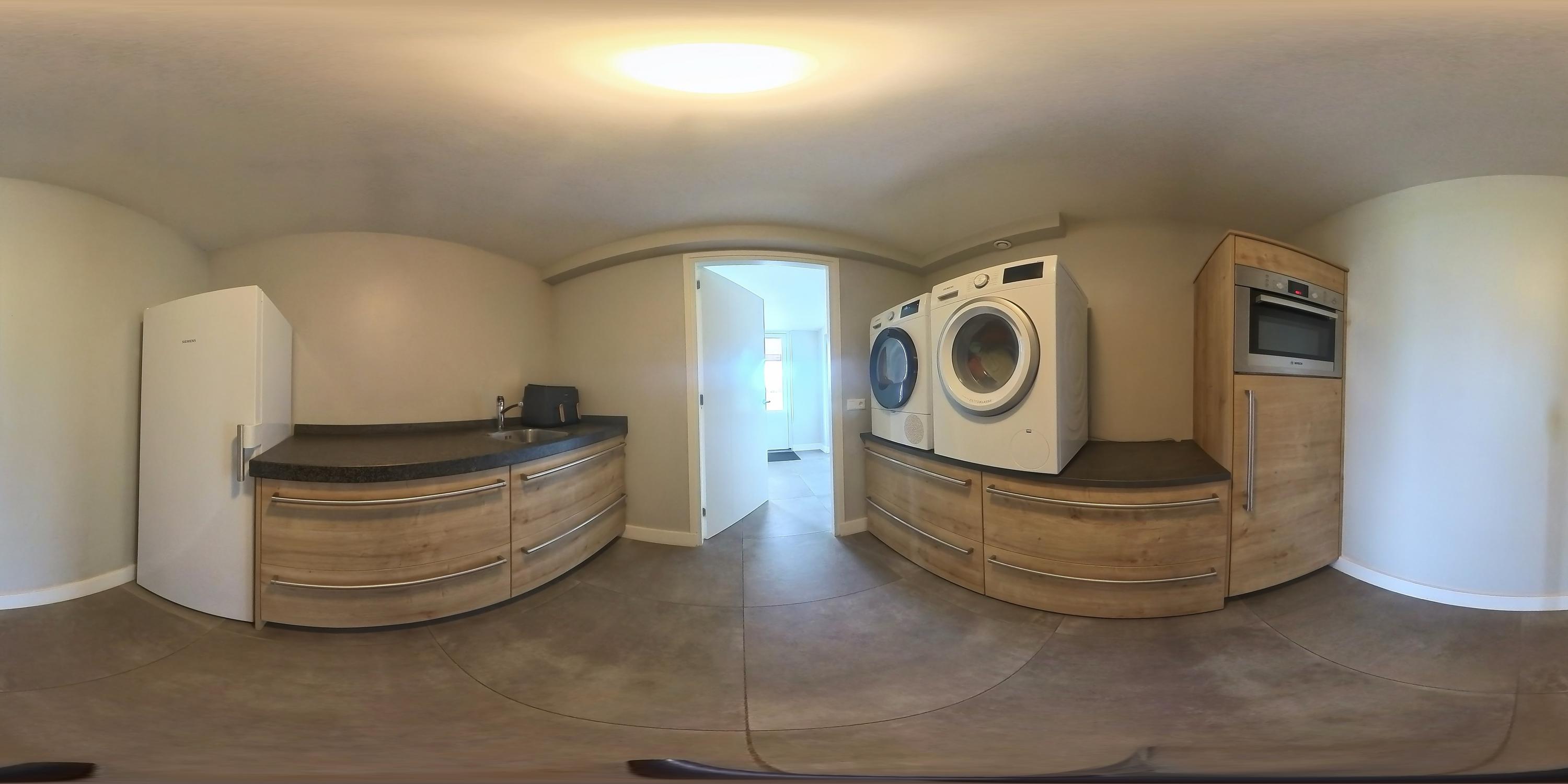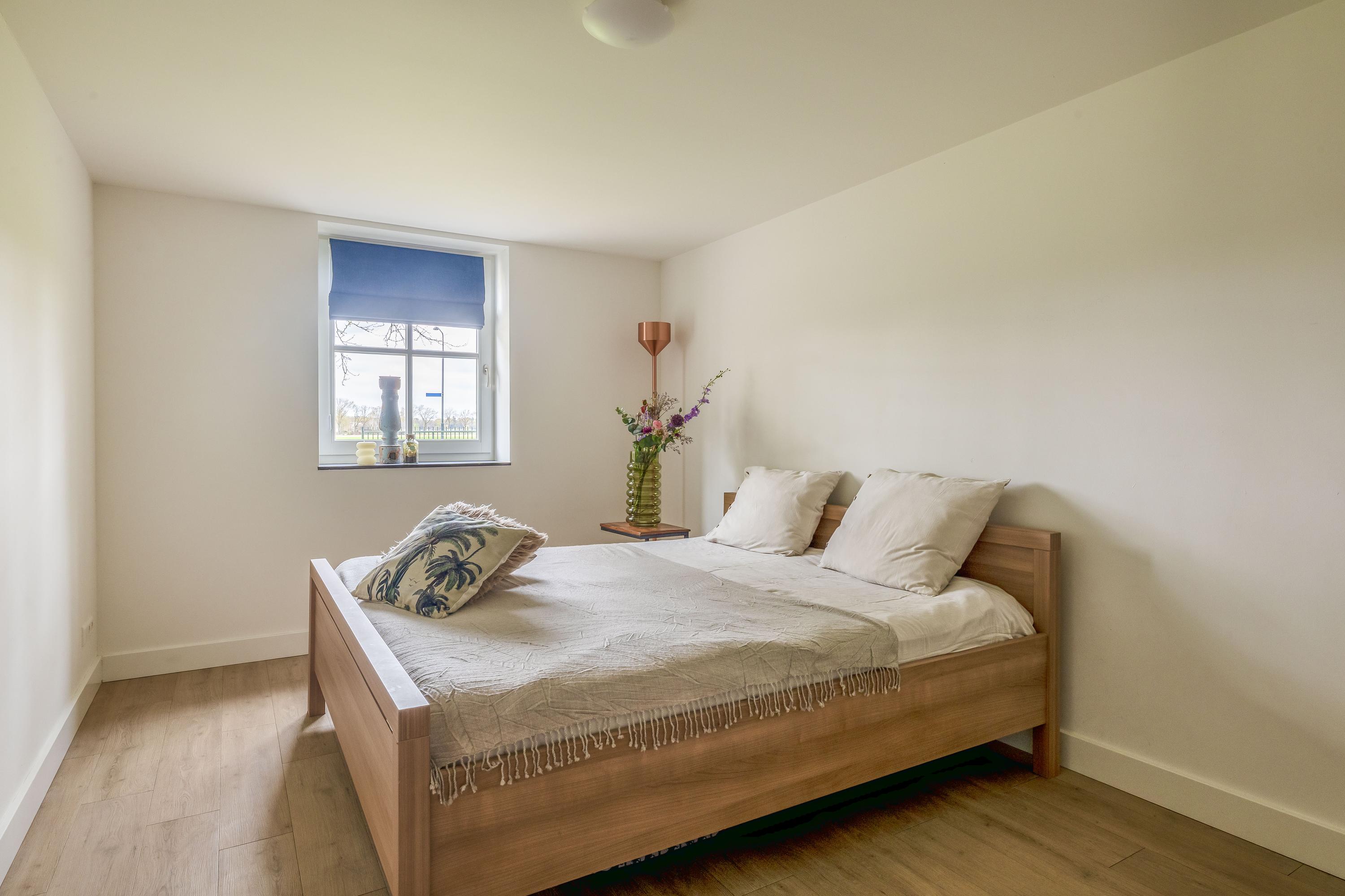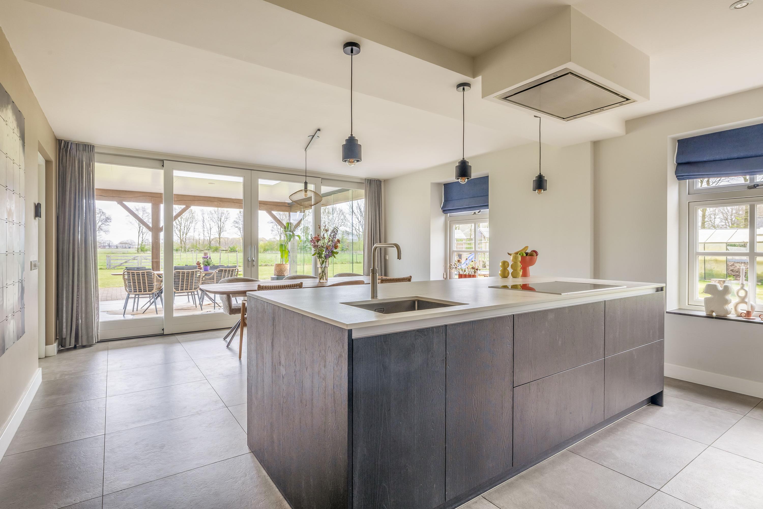 The cosy living room, with its warm wooden parquet flooring and stucco walls, is a delightful space with plenty of natural light. The living room is directly connected to the kitchen-diner. The kitchen-diner is fitted with a cooking island and wall units and features all necessary appliances, including a Quooker, dishwasher, induction hob, oven and fridge. The modern tiled floor with underfloor heating and the sliding doors providing access to the covered terrace make this kitchen a pleasant and practical living space with views of the surrounding landscape. The utility room, toilet and storage room are accessible via the corridor. The utility room is practically laid out with washing appliances at a convenient height, storage space and additional facilities such as a fridge and combi-oven. The toilet is fitted with a wall-hung toilet and washbasin. The storage room has connections for installing a bathroom, making it easy to create a lifetime-proof layout.