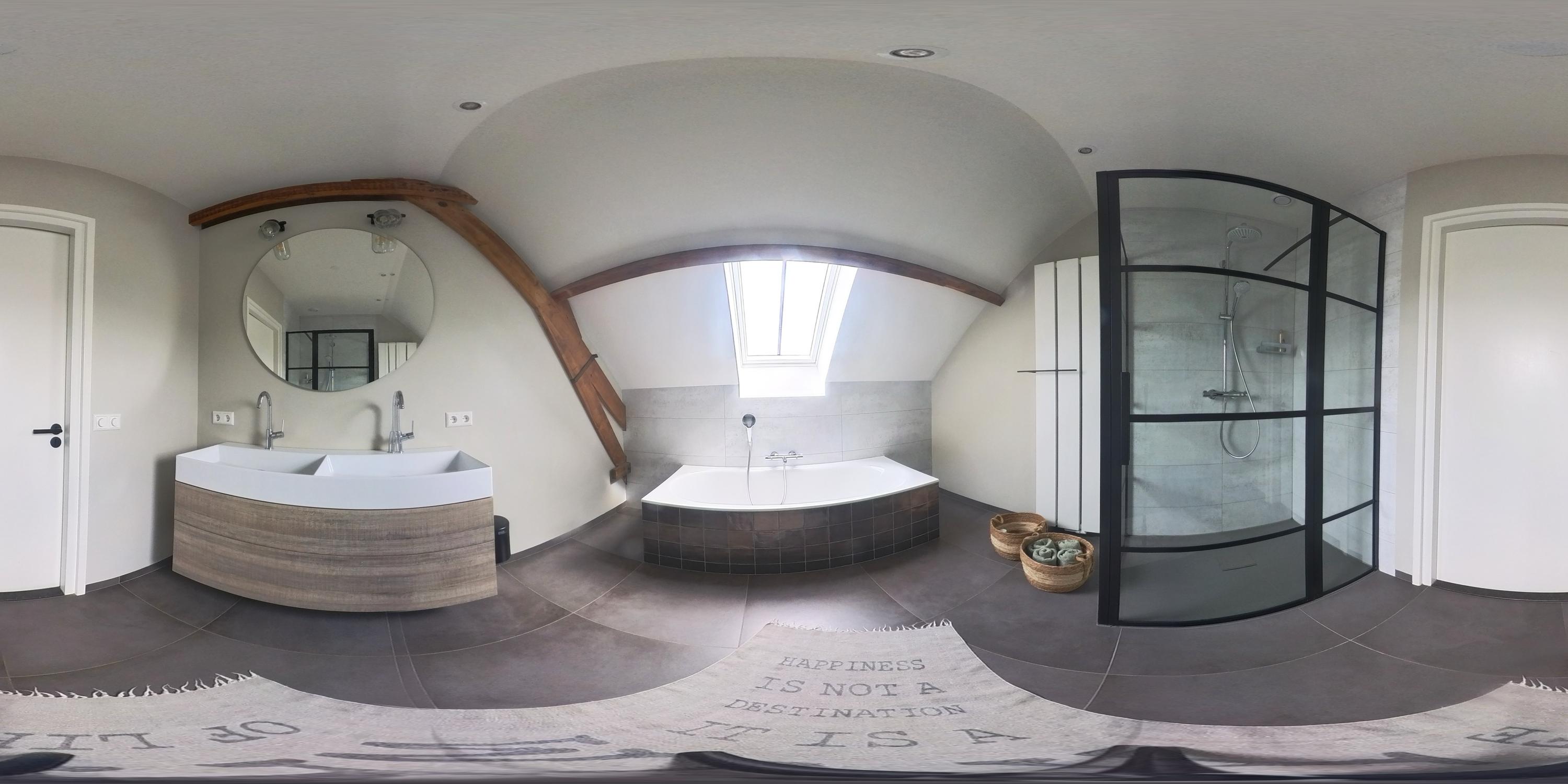 The first floor features a spacious landing with a mezzanine and provides access to three spacious bedrooms, a bathroom, a separate toilet and the central heating room. The floor is finished with laminate flooring and stucco walls. The high ceilings create a spacious feel. One of the bedrooms has fitted wardrobes and the master bedroom features a walk-in wardrobe. The bathroom is fitted with a bath, shower and double washbasin with vanity unit. Exposed wooden beams contribute to the warm, rustic atmosphere. The separate toilet is fitted with a wall-hung toilet. The central heating room houses the combi boiler (Nefit, 2018).