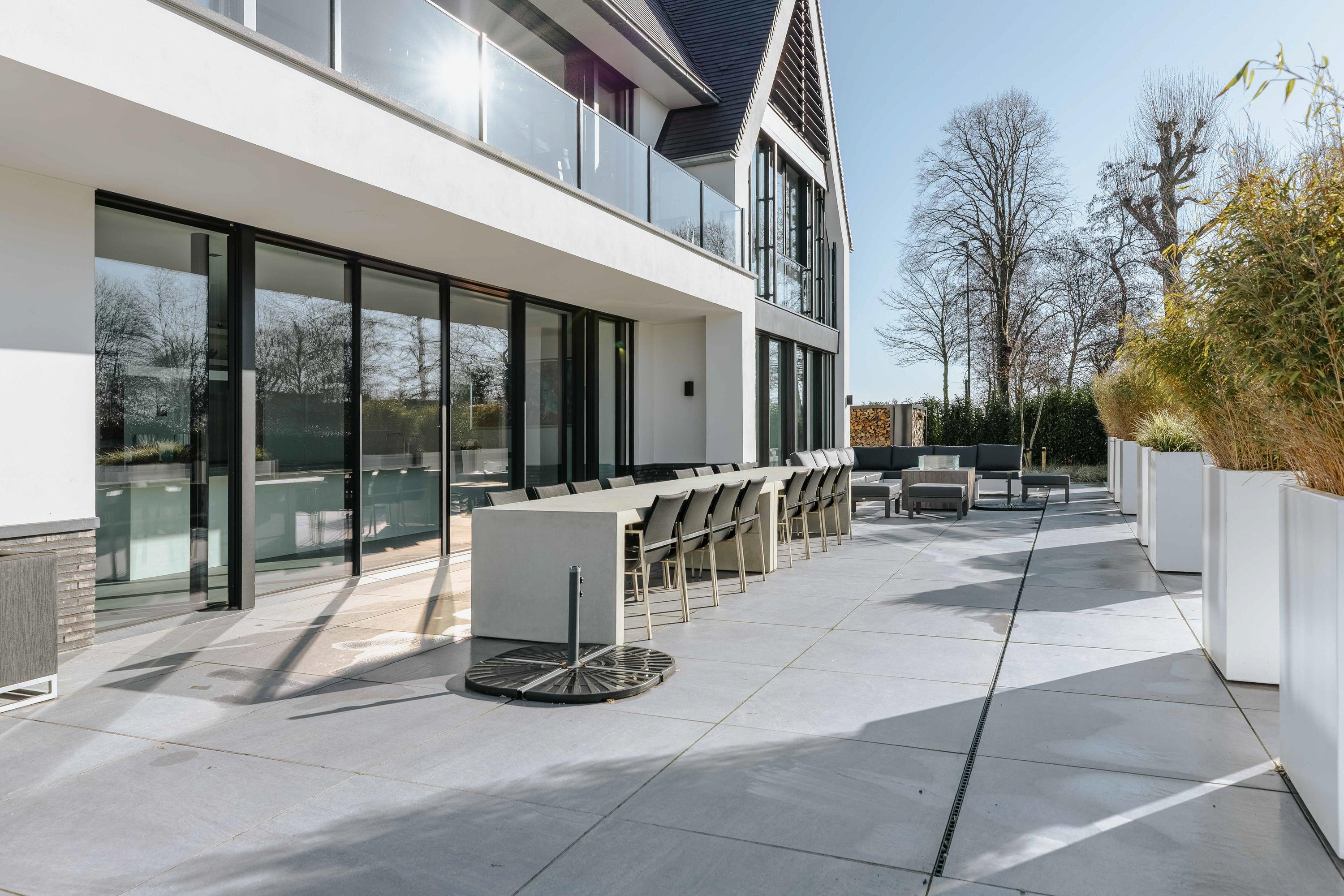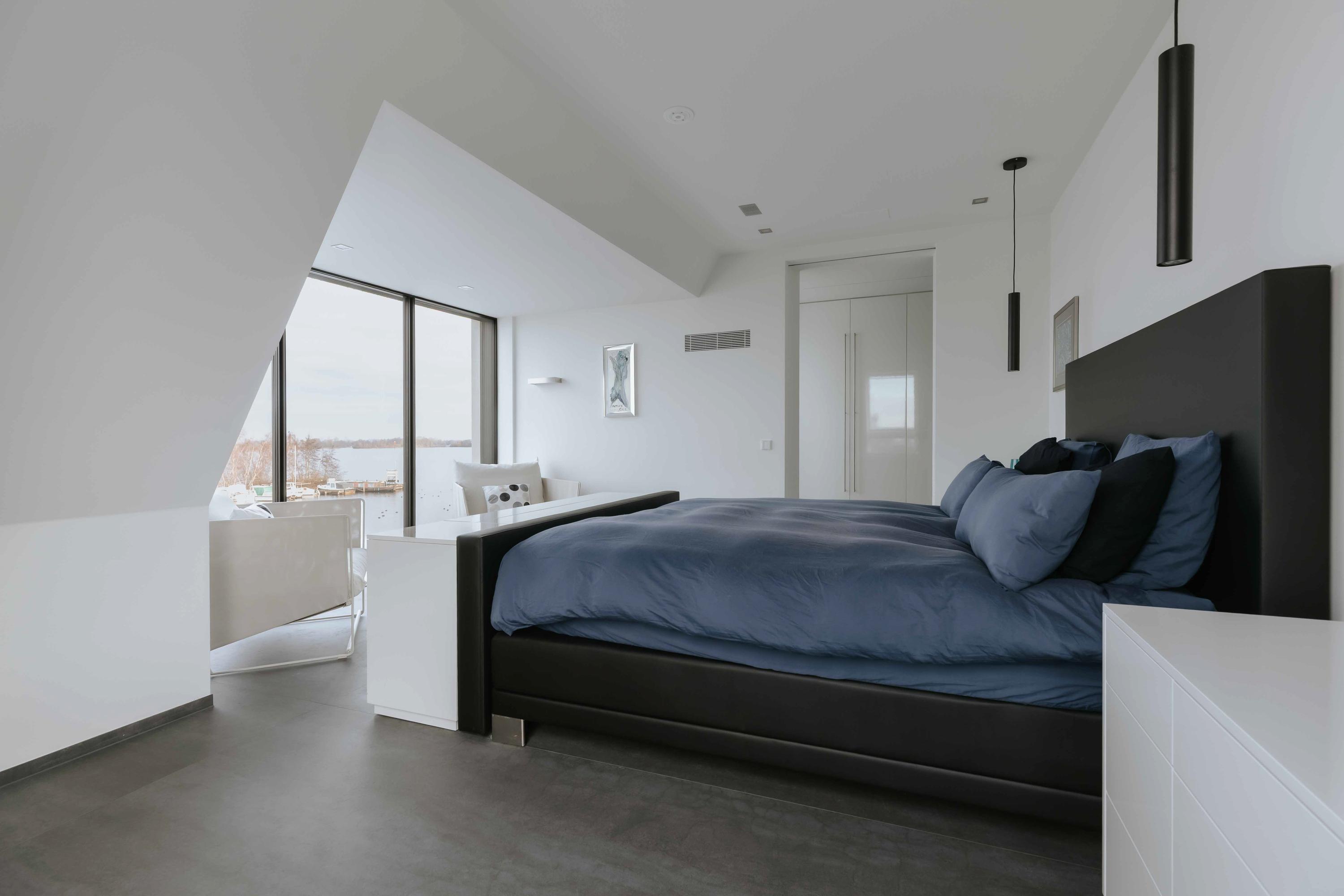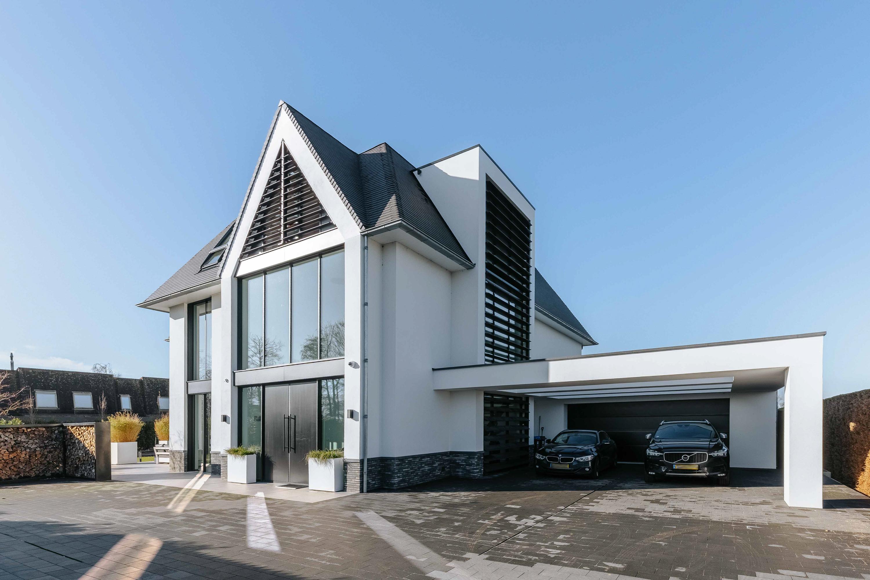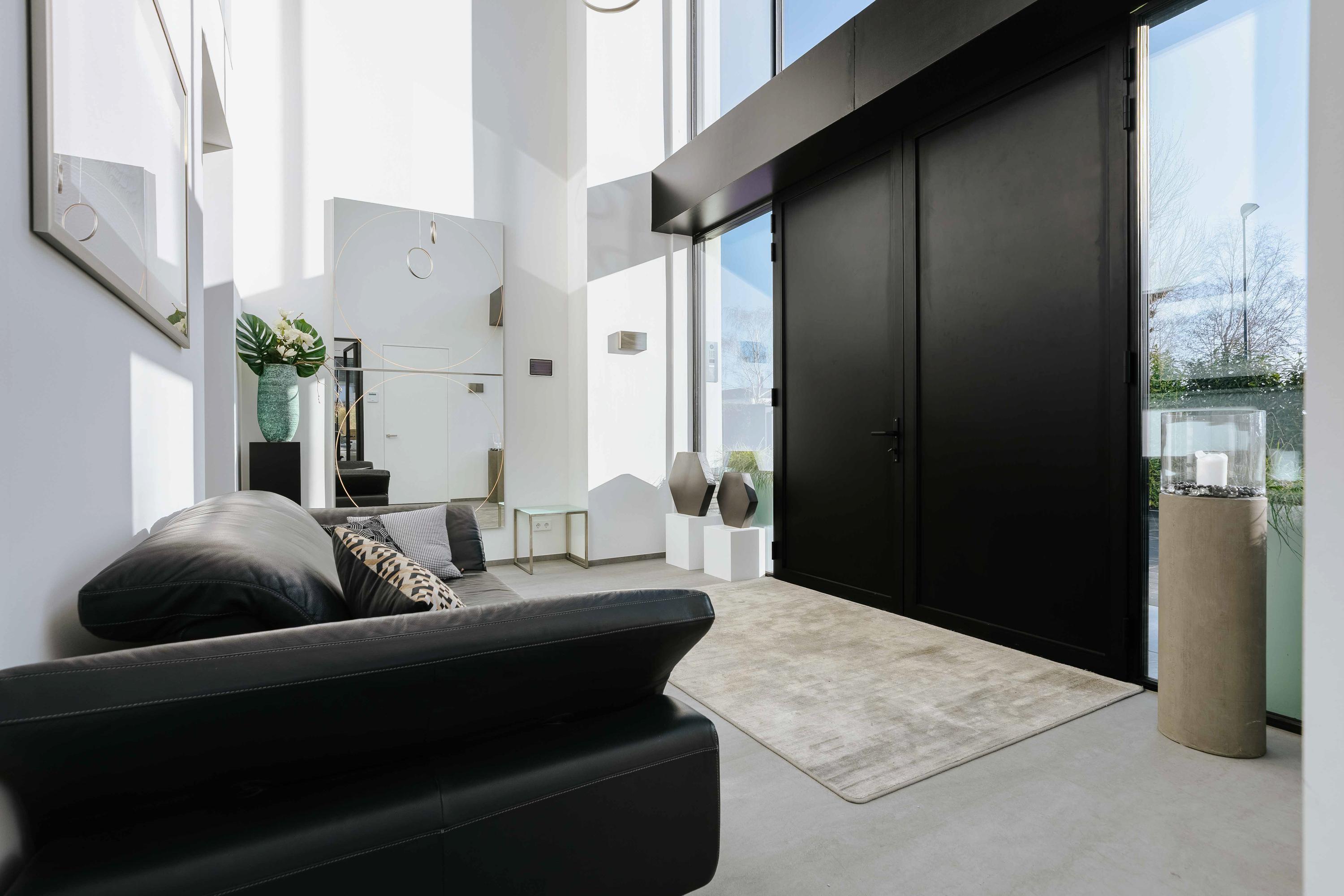 The second floor features three comfortable bedrooms and two luxurious bathrooms. The impressive master suite has a walk-in closet, air conditioning, and a fully equipped wellness bathroom with a sun shower, steam shower, and bathtub. All rooms have been finished with an eye for detail and feature custom cabinets and luxurious sanitary ware.