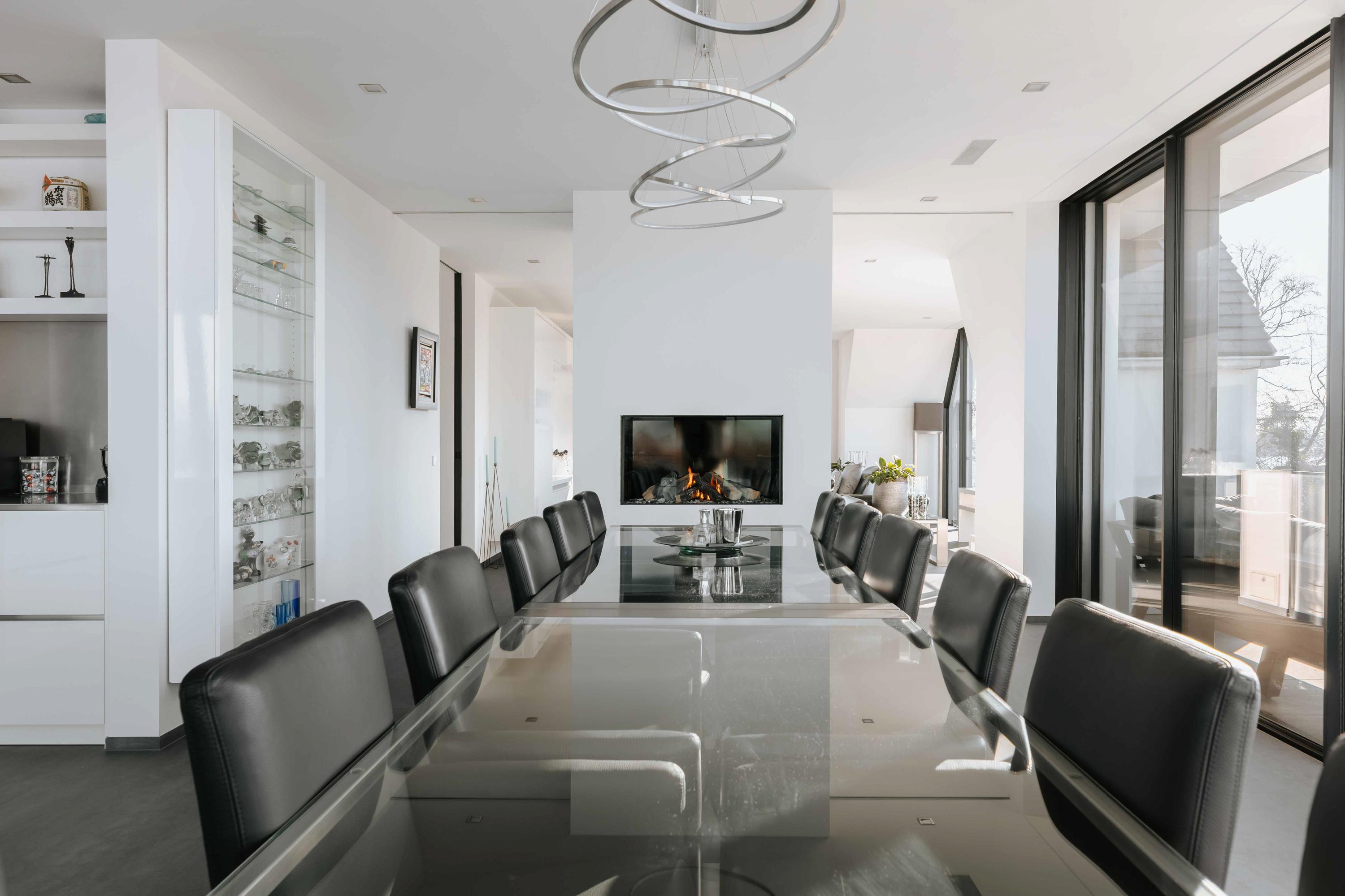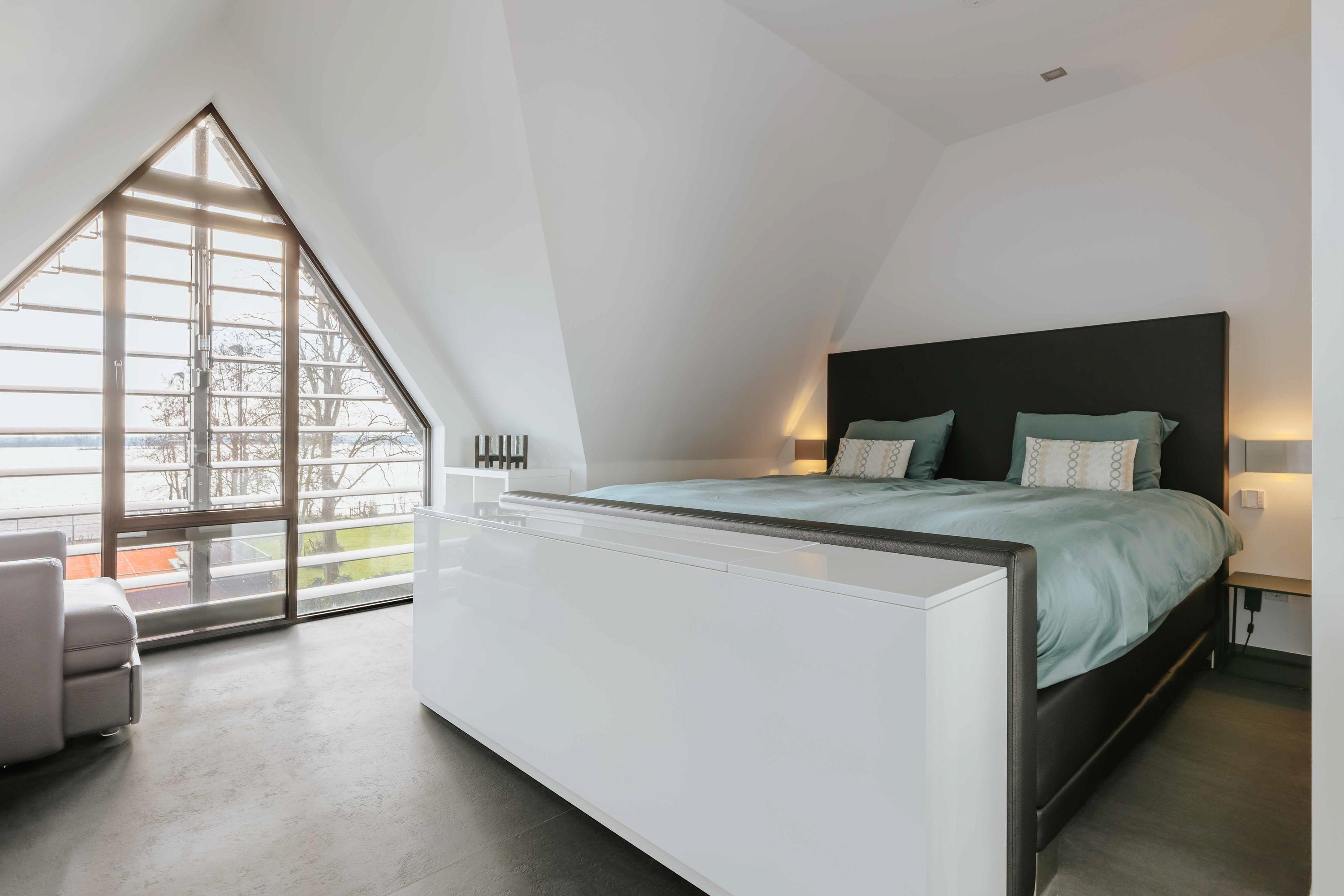 In addition to a representative entrance, the ground floor offers a gym and a study, which can also be used as bedrooms. There is also a spacious living/garden room with a luxury kitchen and direct access to the boathouse, swimming pool, and terrace.