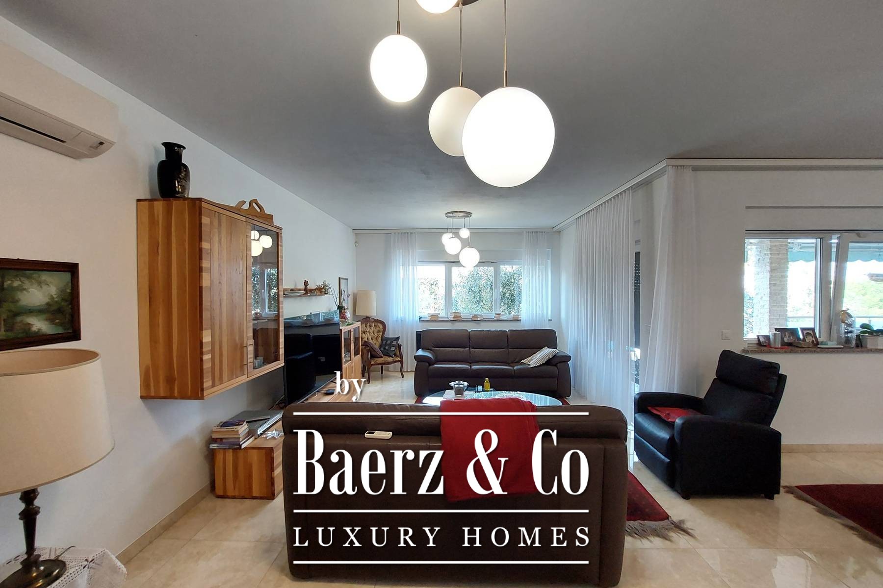 Ascending the internal staircase, the upper floor houses three further bedrooms. Two feature ensuite bathrooms and connect to a spacious terrace with sweeping views of the sea and the Brijuni Islands. The third room serves as an adaptable study, optimizing the natural light offering. The property integrates convenience throughout, with an alarm, video surveillance system, gas underfloor heating, air conditioning in every room, solar collectors, and an 800-liter boiler.