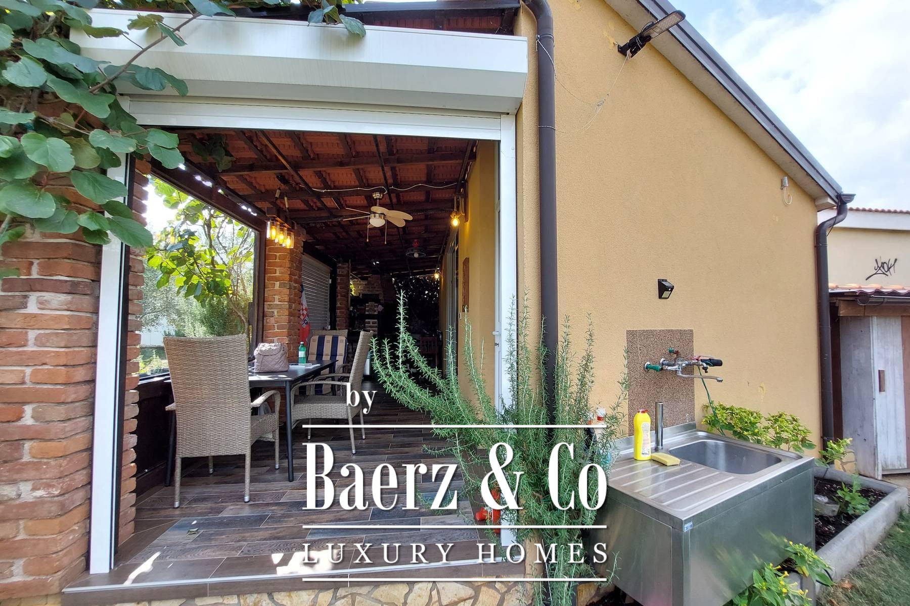 Outdoors, a fully fenced garden supports six-car parking, including a garage with direct house access, two covered spaces, and three open ones. The landscaped grounds feature an automatic irrigation system and a 32 m² swimming pool. At the garden's edge, a separate tavern with fireplace, kitchen, dining area, and dedicated facilities creates an exceptional setting for both summer gatherings and colder months. The proximity to a water protection area assures ongoing tranquility, preserving views and privacy. This luxury townhouse for sale in Vodnjan is sold fully furnished and offers a considered blend of efficiency, security, and welcoming outdoor spaces.