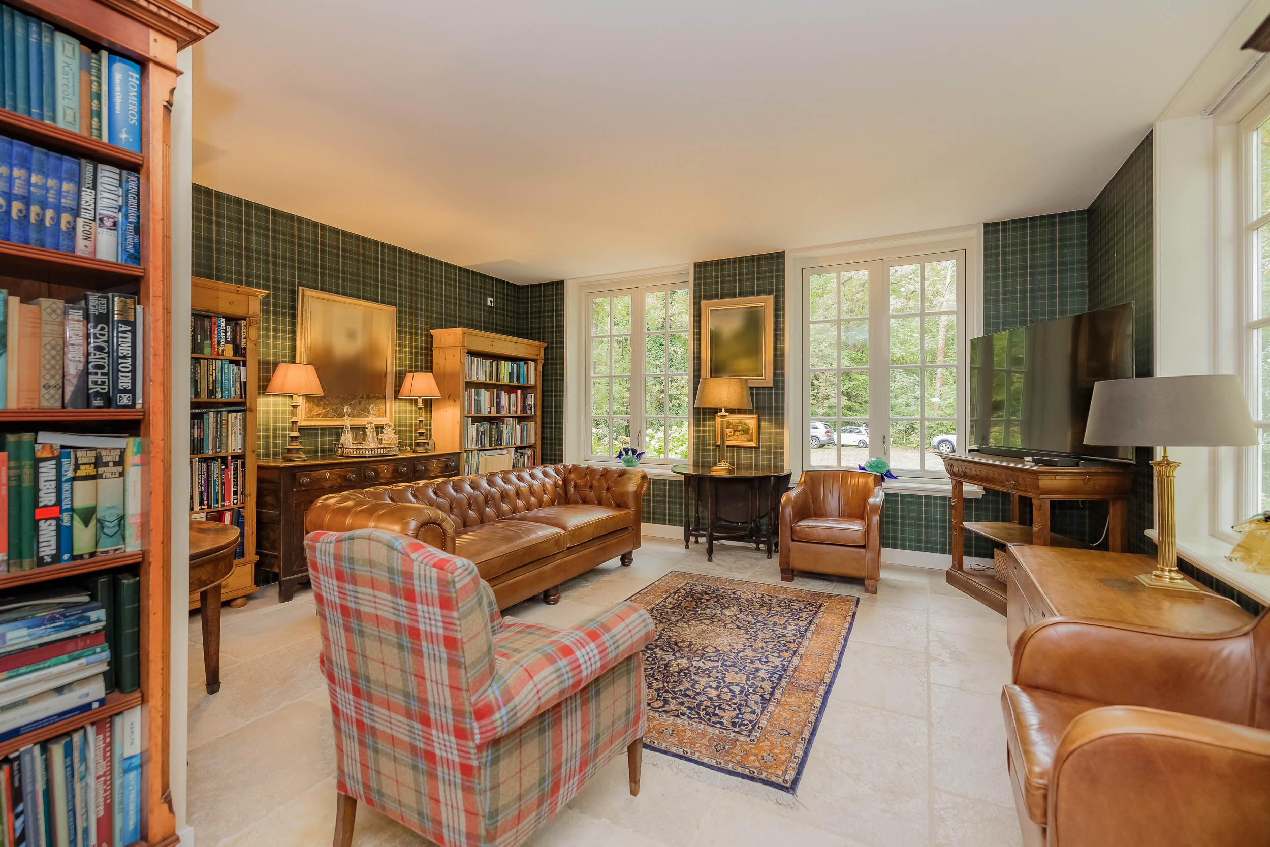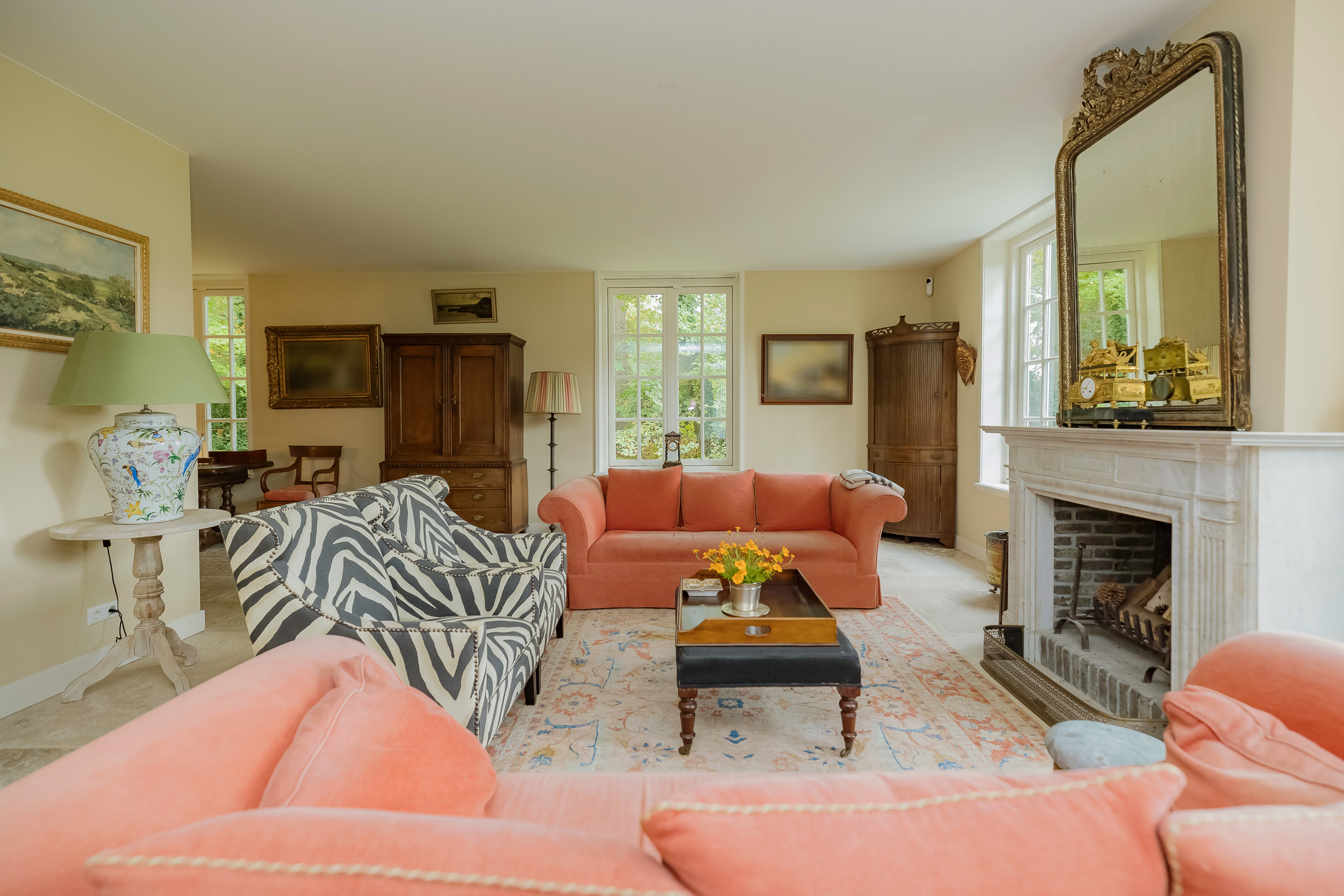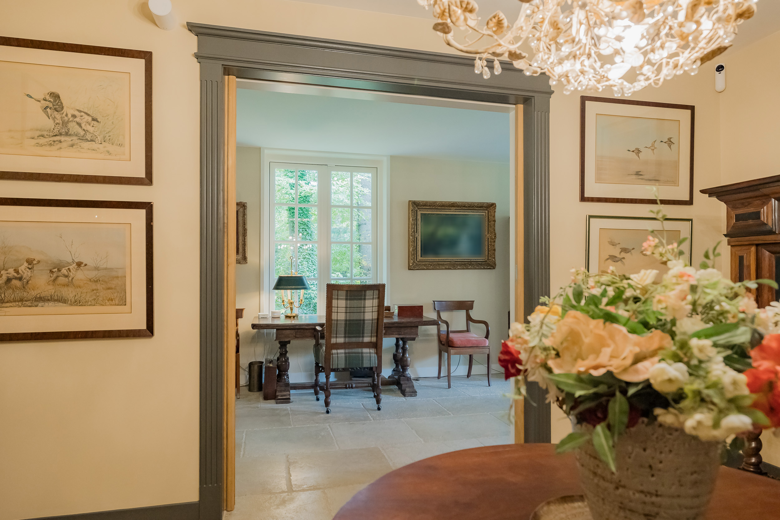 All rooms are accessible via the impressive central hall with its beautiful staircase and elevator. The bright living room is a wonderfully spacious place to enjoy the peace and quiet and the view, and offers direct access to the veranda. The fireplace and underfloor heating add to the atmosphere and comfort. At the front of the house is a cozy drawing room (or dining room) with a view of the forest. Between these rooms is a spacious workspace.