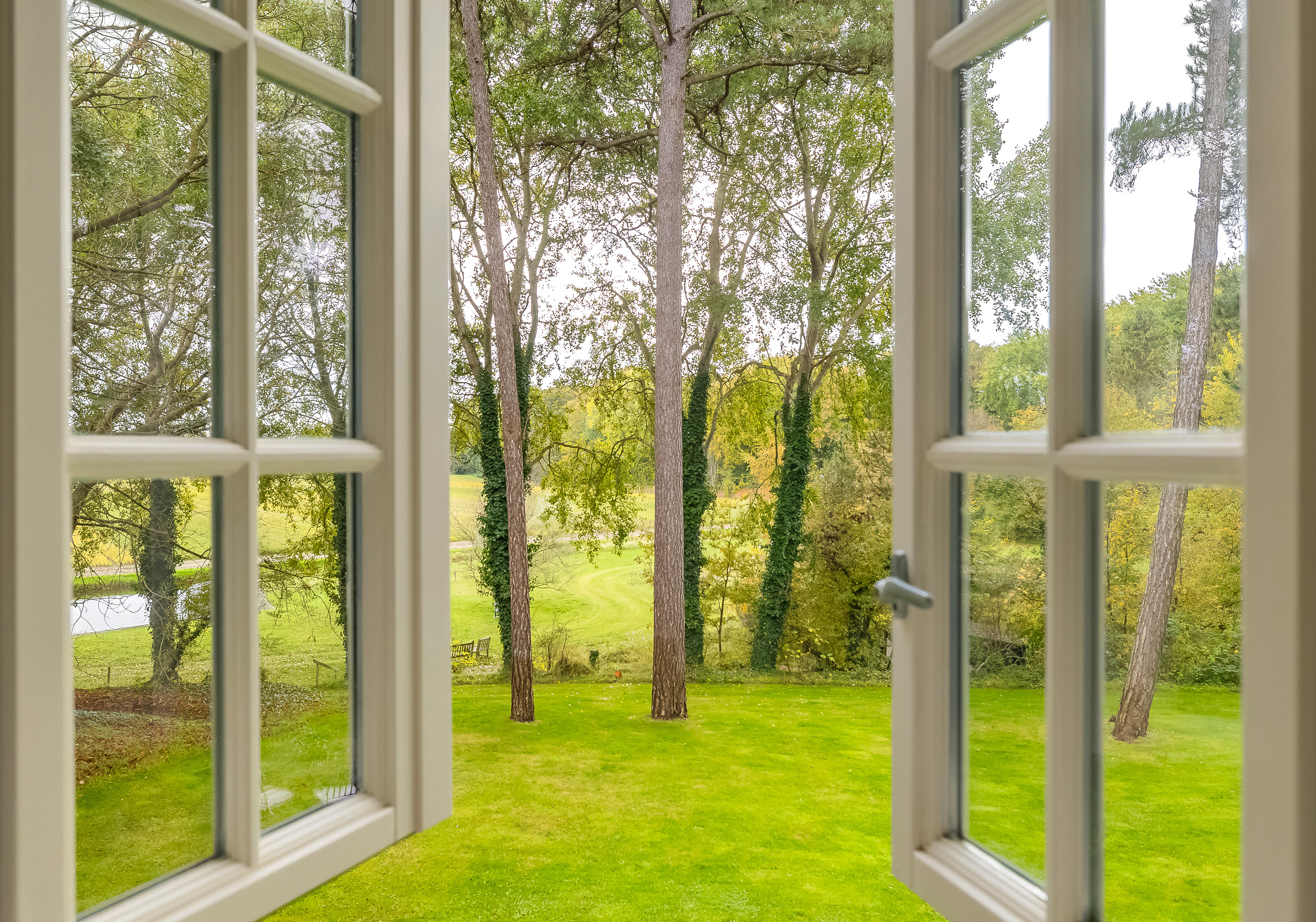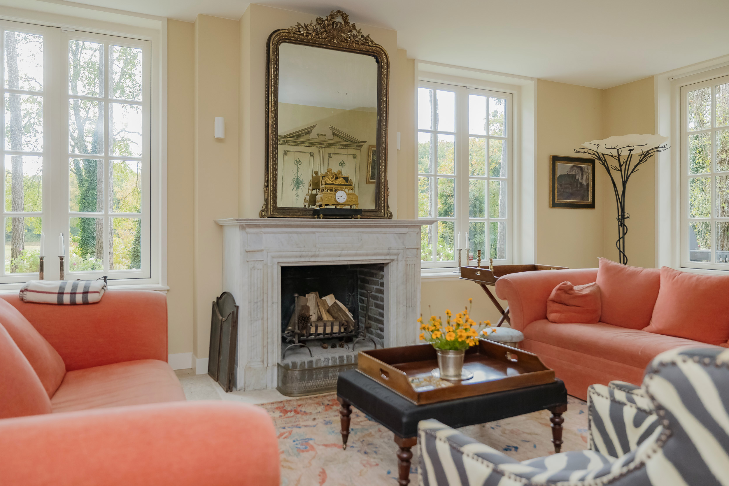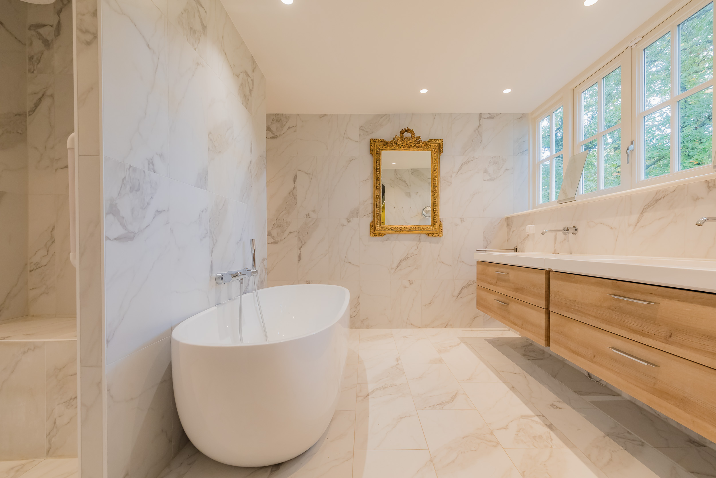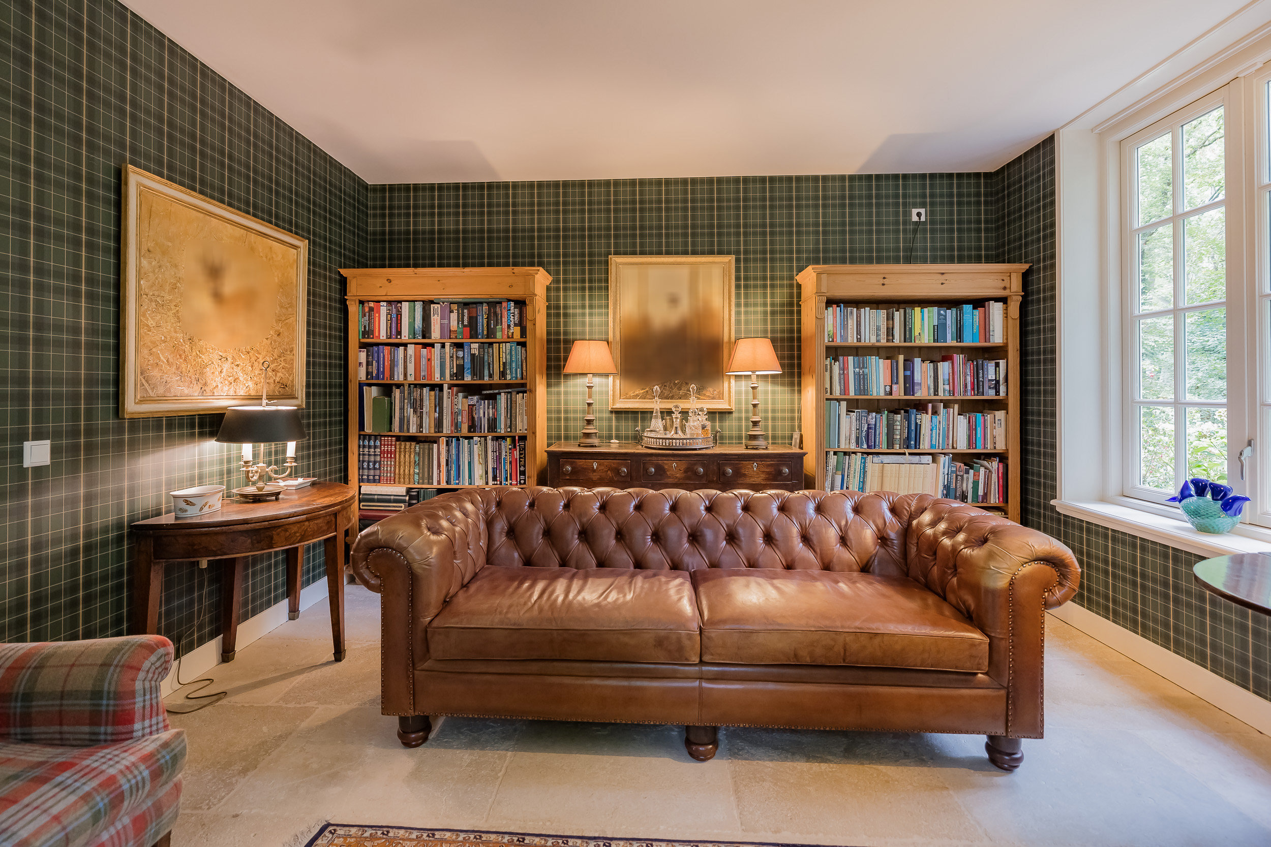 All rooms are accessible via the impressive central hall with its beautiful staircase and elevator. The bright living room is a wonderfully spacious place to enjoy the peace and quiet and the view, and offers direct access to the veranda. The fireplace and underfloor heating add to the atmosphere and comfort. At the front of the house is a cozy drawing room (or dining room) with a view of the forest. Between these rooms is a spacious workspace.
