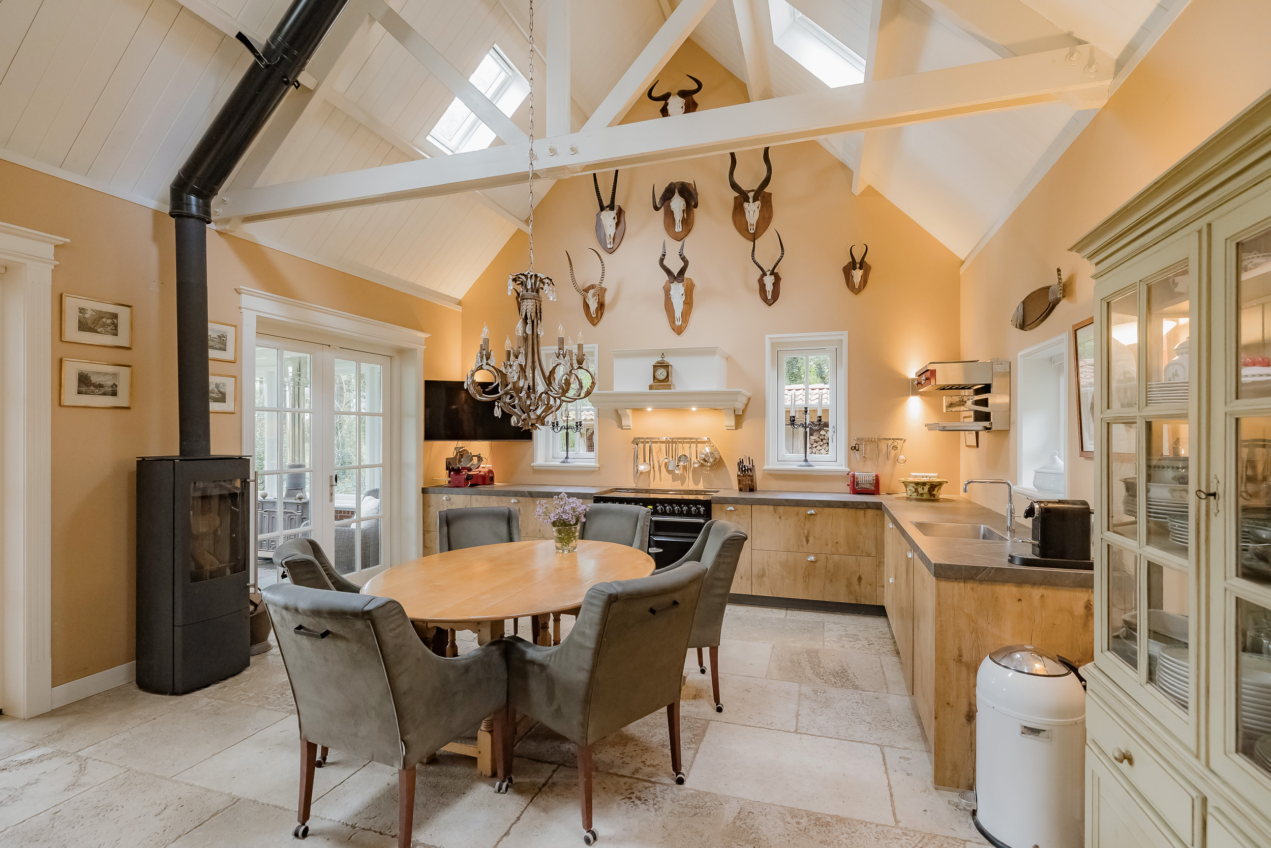 The spacious, cozy kitchen has a high ceiling, a mezzanine, modern built-in appliances including an American refrigerator and a luxury AGA induction stove with 4 ovens. Adjacent to this is a practical utility room. The skylights and wood-burning stove make the kitchen a pleasant, warm place to cook and eat. From the kitchen, you can walk straight onto the veranda, where the wood-burning stove ensures that you can enjoy the outdoors all year round.