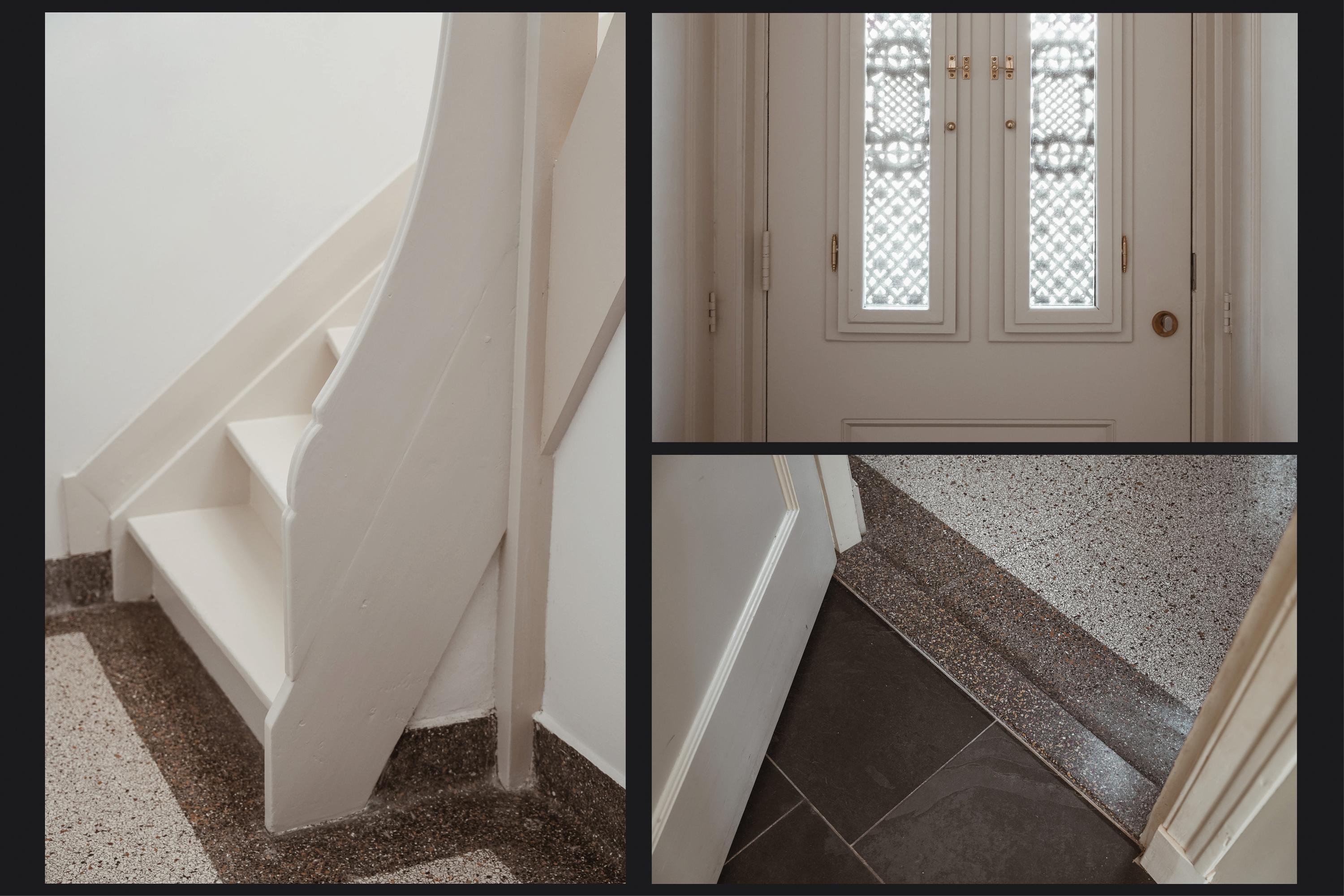 The landing reflects the care and attention given to the renovation. The new extension blends seamlessly with the original architecture. There is also a separate toilet on this level. In the rear extension is a bedroom with balcony, a luxurious open bathroom and a walk-in closet. The bathroom is fitted with a semi-freestanding bathtub, a spacious walk-in shower with rainfall shower and a stylish vanity unit. The wall behind the vanity is finished with hexagonal mosaic tiles, while the shower and bath areas feature concrete ciré finishes. Thanks to its east-facing position, the morning sun enters here, and the balcony is directly accessible from the bedroom.