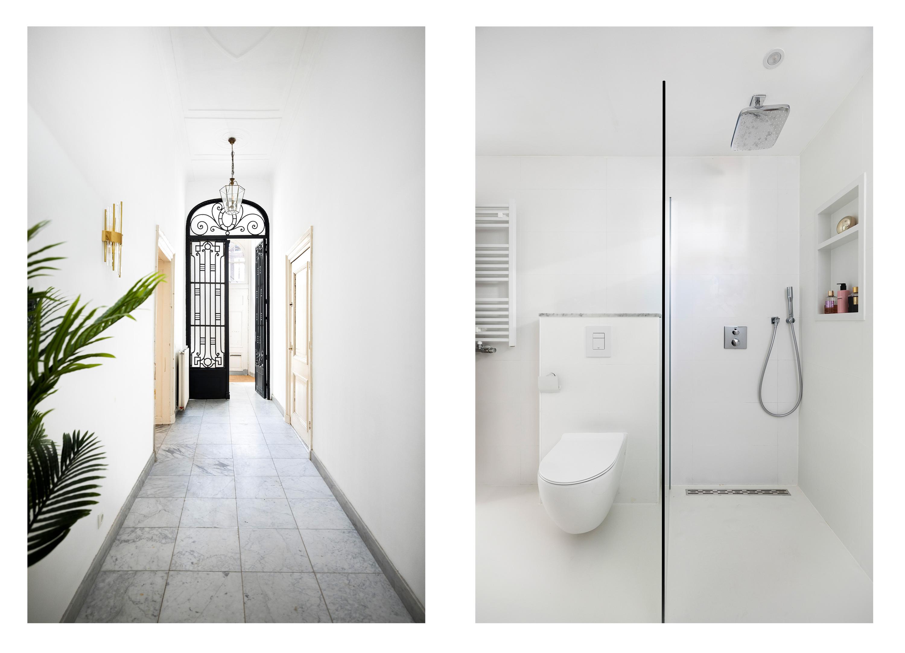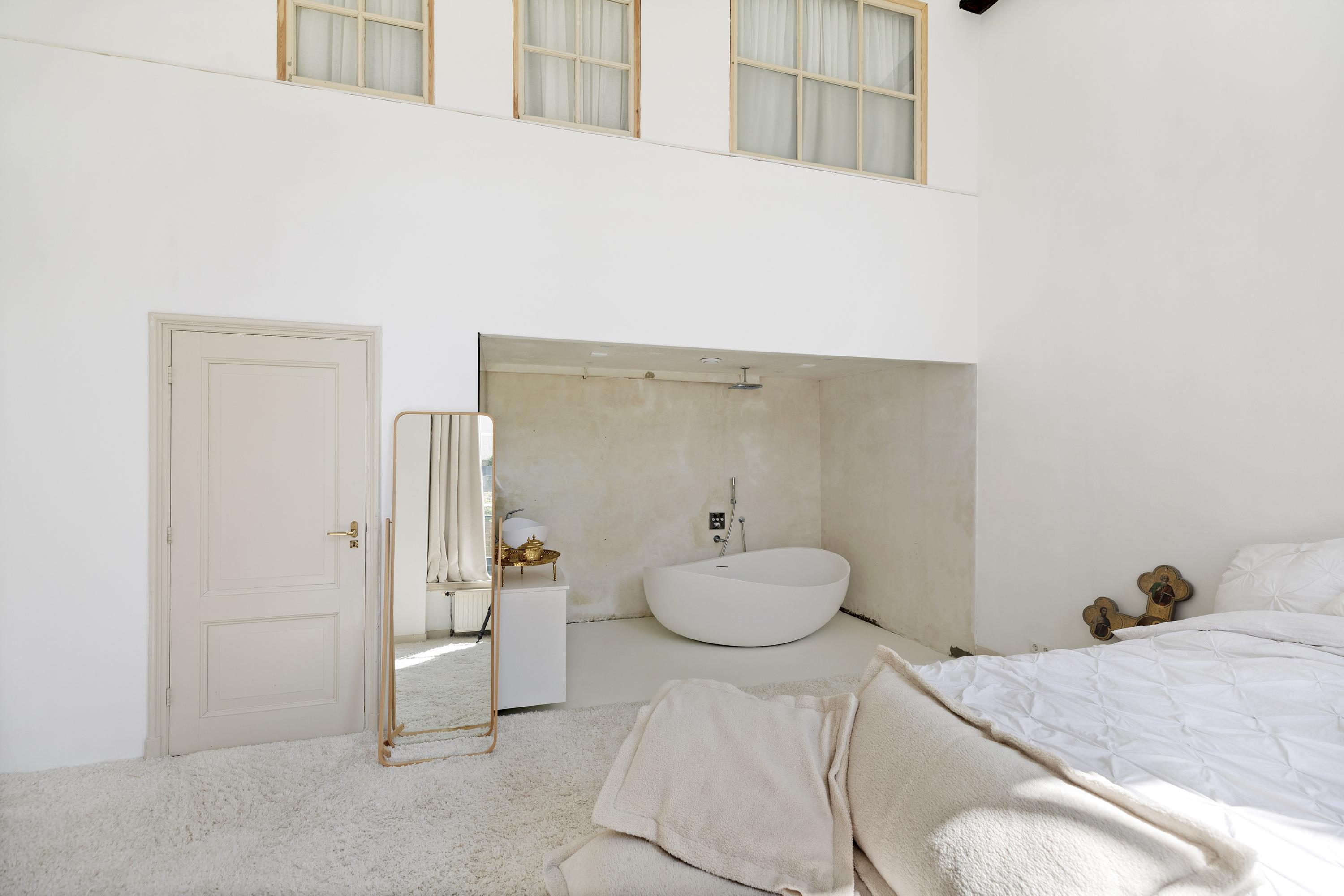 To the right: a living room and kitchen en suite. The flooring is warm oak in a classic herringbone pattern. The walls are freshly plastered in white, and the woodwork is finished in classic Bentheimer yellow. These rooms are surprisingly versatile — they can accommodate anything from sleek minimalist design to vibrant, art-filled spaces, even children’s bikes and dollhouses — everything finds its place here.