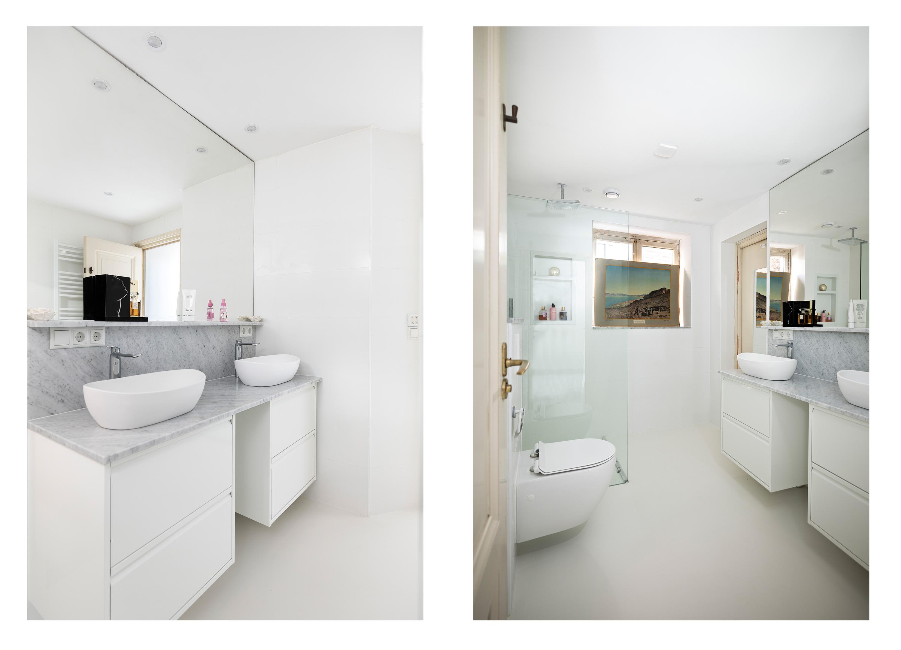 Adjacent is a beautiful bathroom with a large walk-in shower, WC, and double sink.