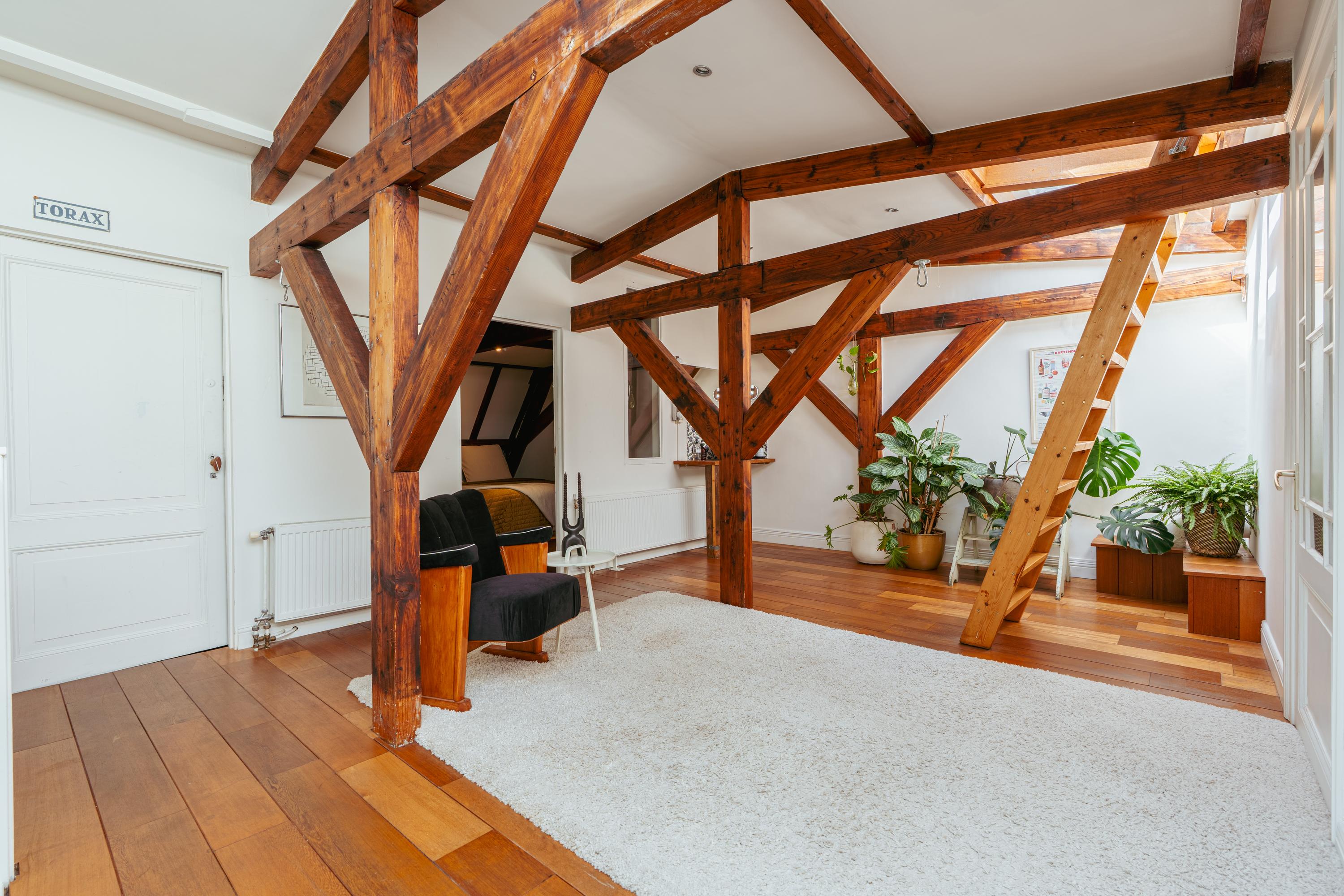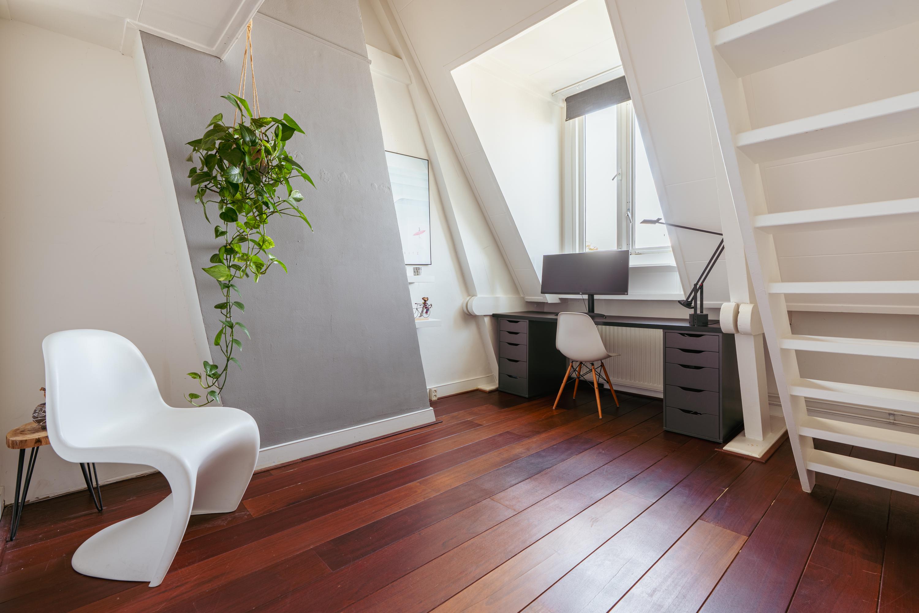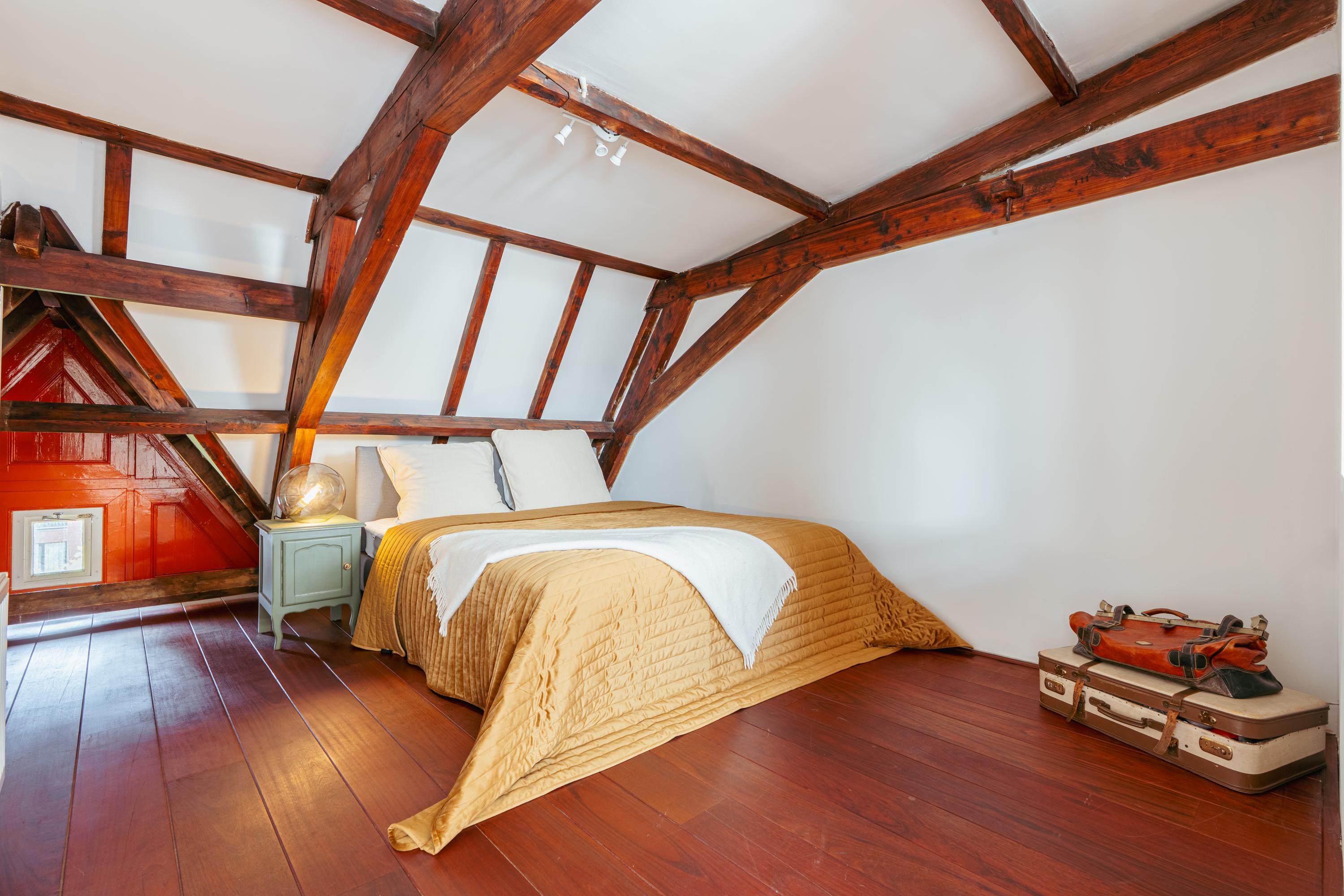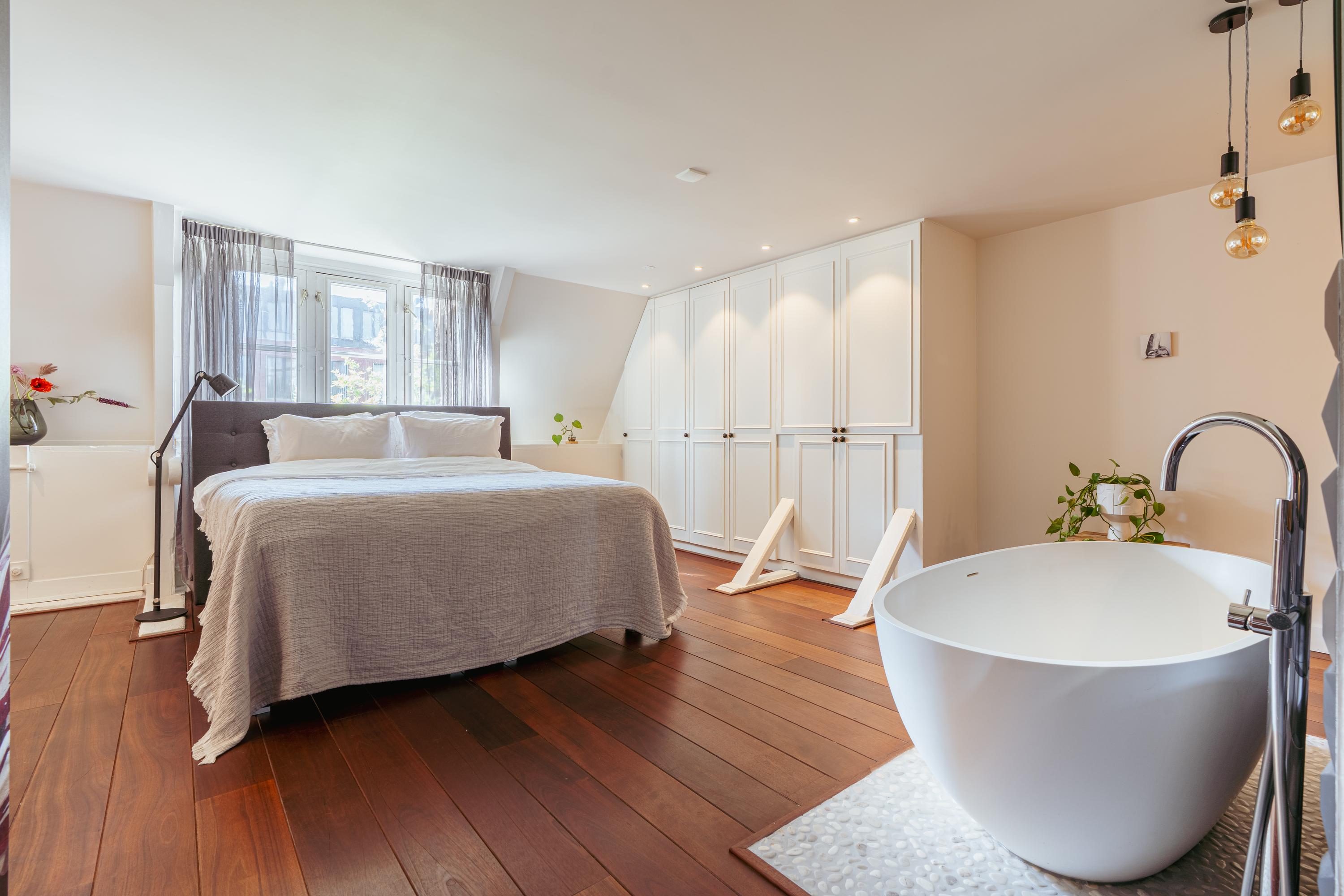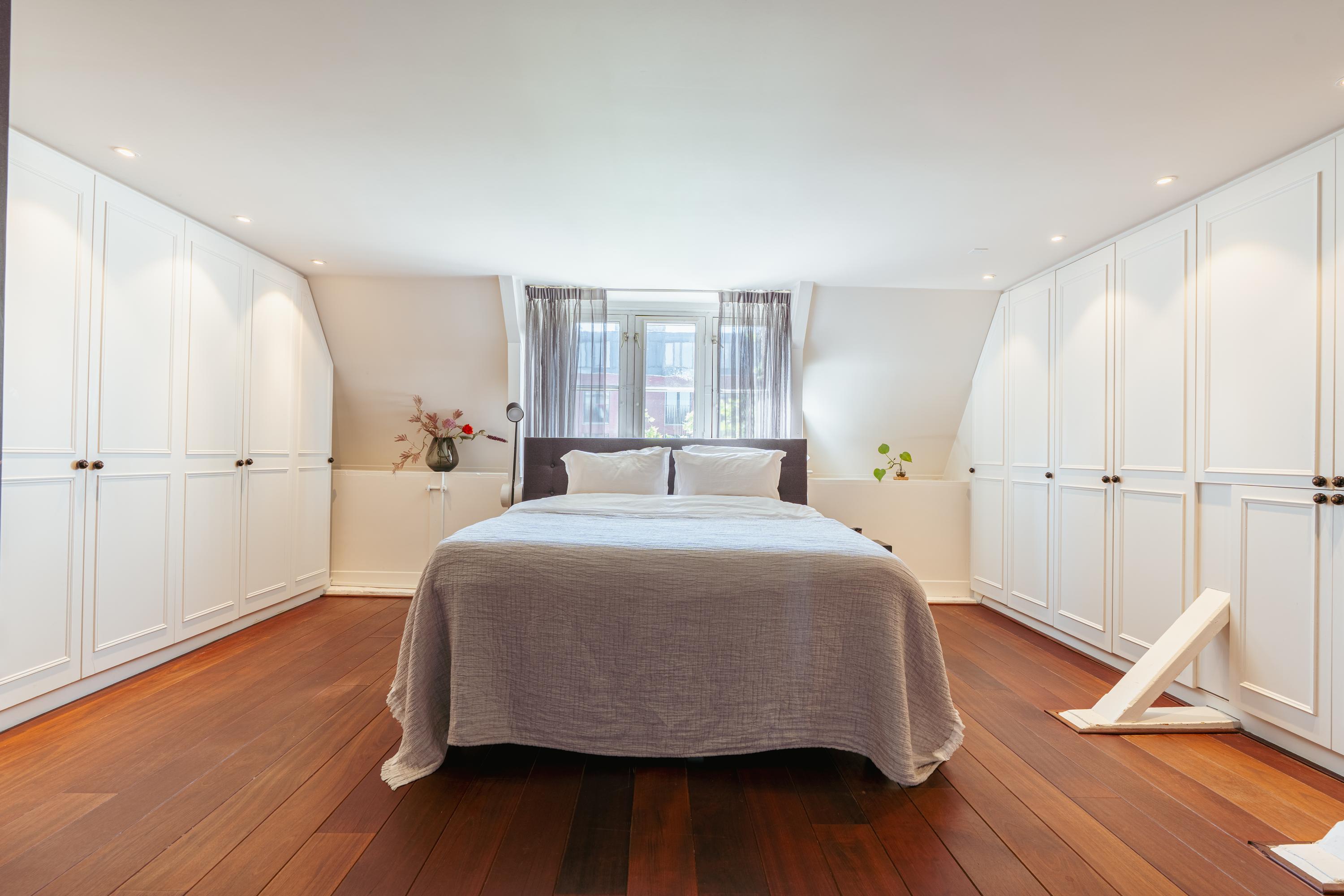 La cuarta planta alberga tres dormitorios, incluida una suite principal con vestidor, bañera exenta y duchas dobles de efecto lluvia, así como dos dormitorios adicionales con niveles de entreplanta. Un segundo baño cuenta con ducha Jee-O a ras de suelo y una sala de lavandería independiente. En la última planta, vigas originales enmarcan un espacio polivalente ideal como área de música o estudio, junto a un cuarto dormitorio y zona de almacenaje. Una escalera adicional conduce a una azotea con vistas panorámicas que alcanzan el Teatro Carré y el Rijksmuseum.