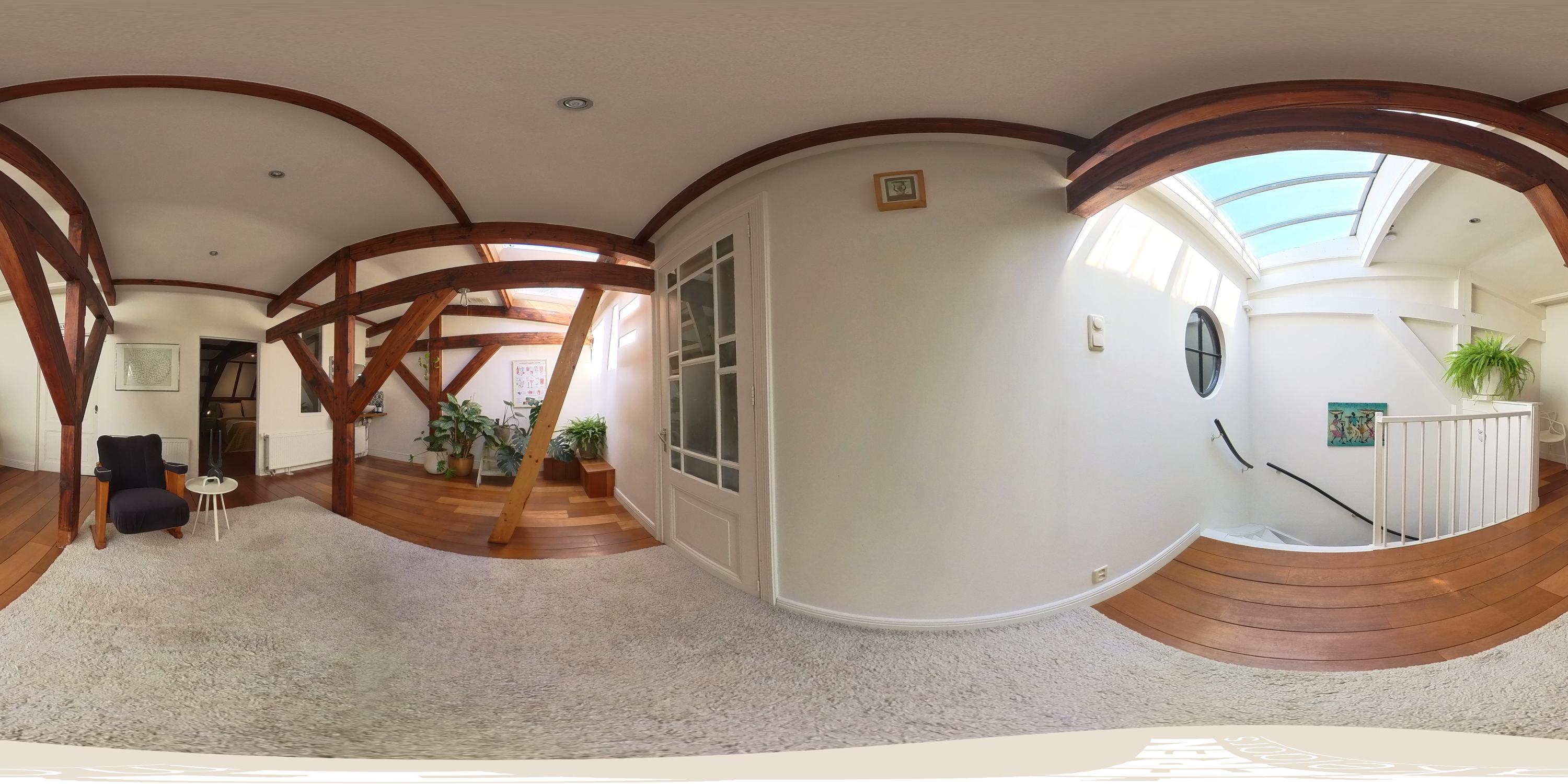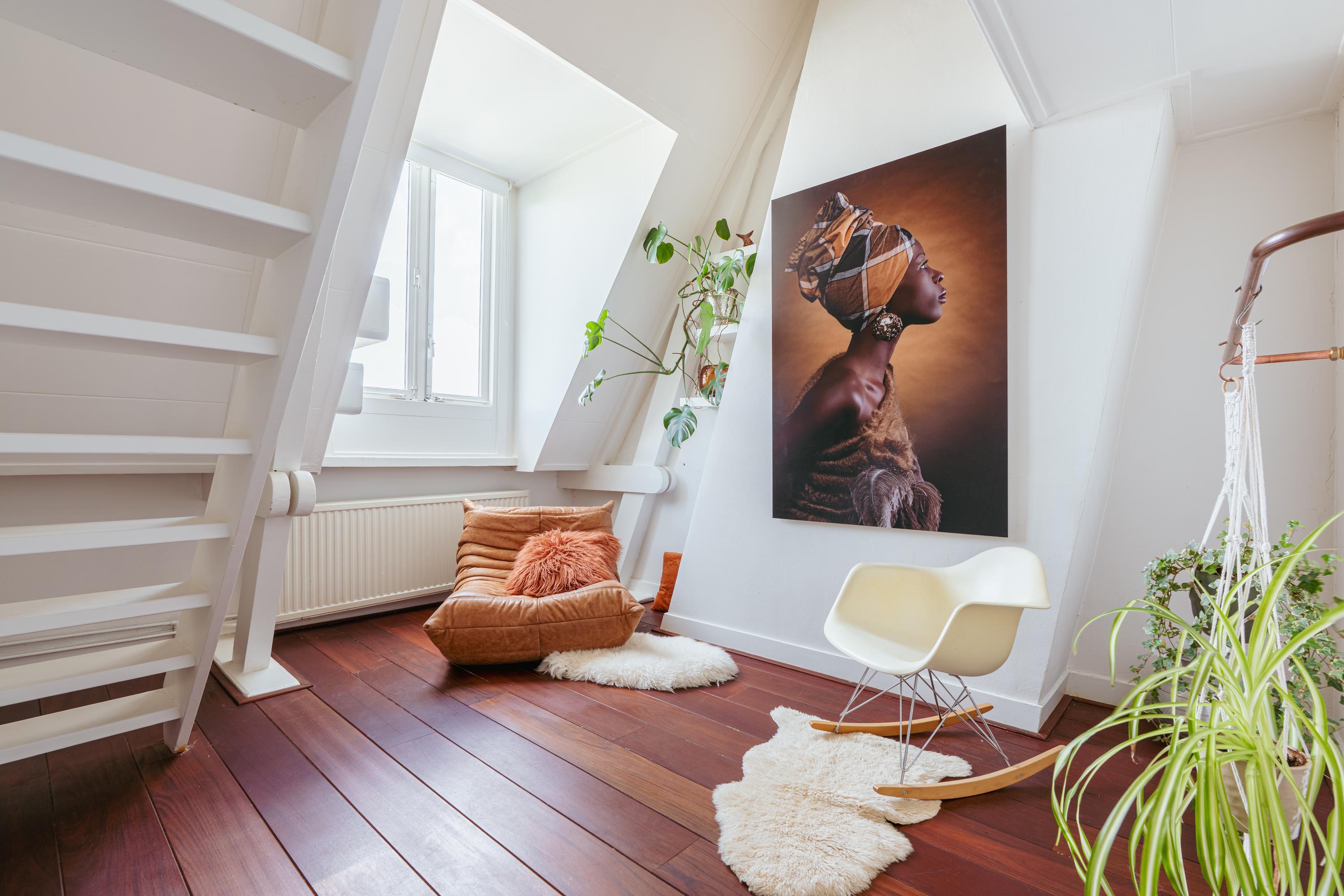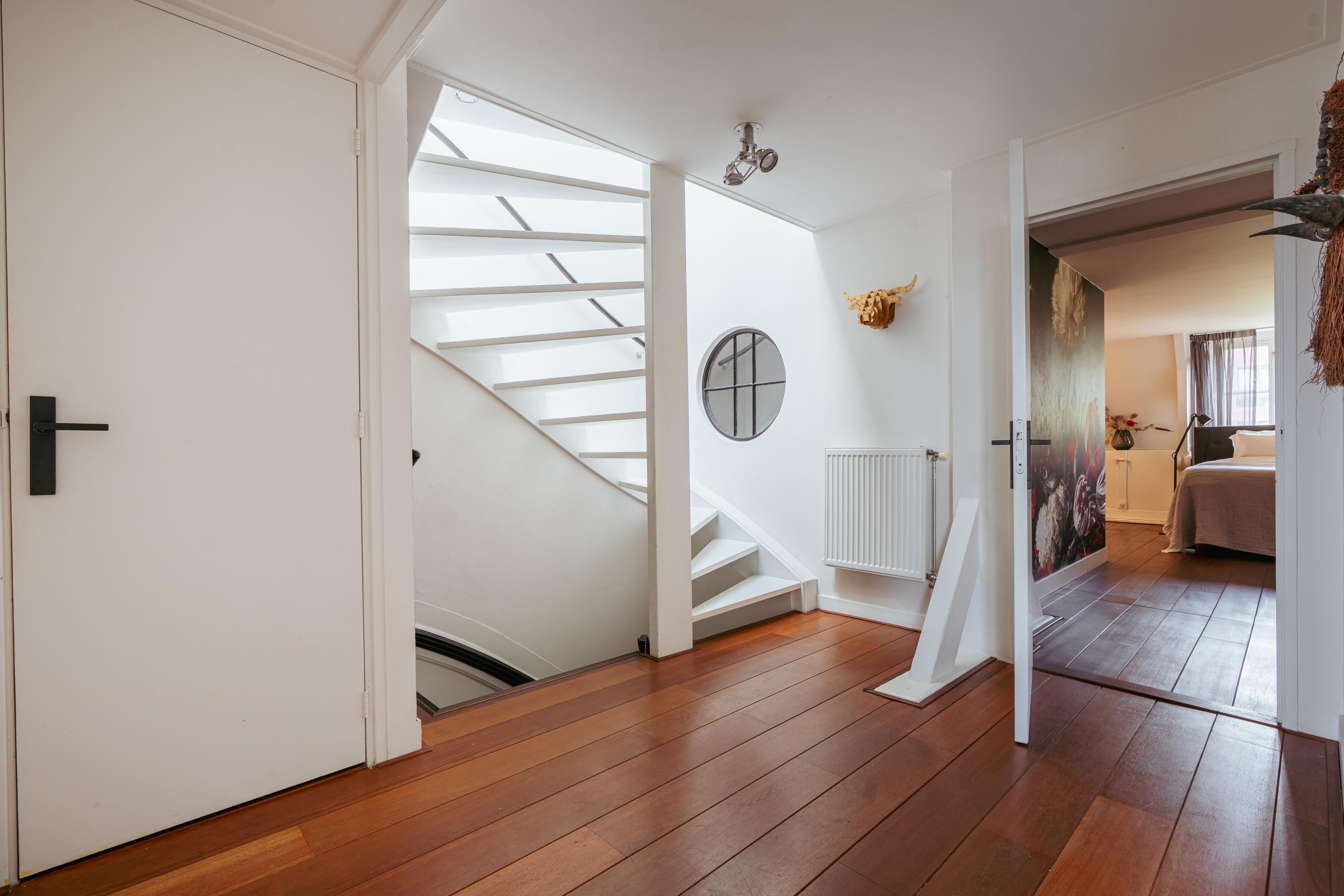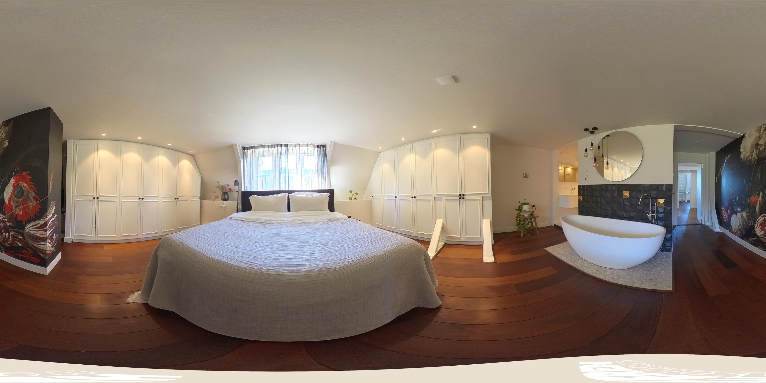 La cuarta planta alberga tres dormitorios, incluida una suite principal con vestidor, bañera exenta y duchas dobles de efecto lluvia, así como dos dormitorios adicionales con niveles de entreplanta. Un segundo baño cuenta con ducha Jee-O a ras de suelo y una sala de lavandería independiente. En la última planta, vigas originales enmarcan un espacio polivalente ideal como área de música o estudio, junto a un cuarto dormitorio y zona de almacenaje. Una escalera adicional conduce a una azotea con vistas panorámicas que alcanzan el Teatro Carré y el Rijksmuseum.