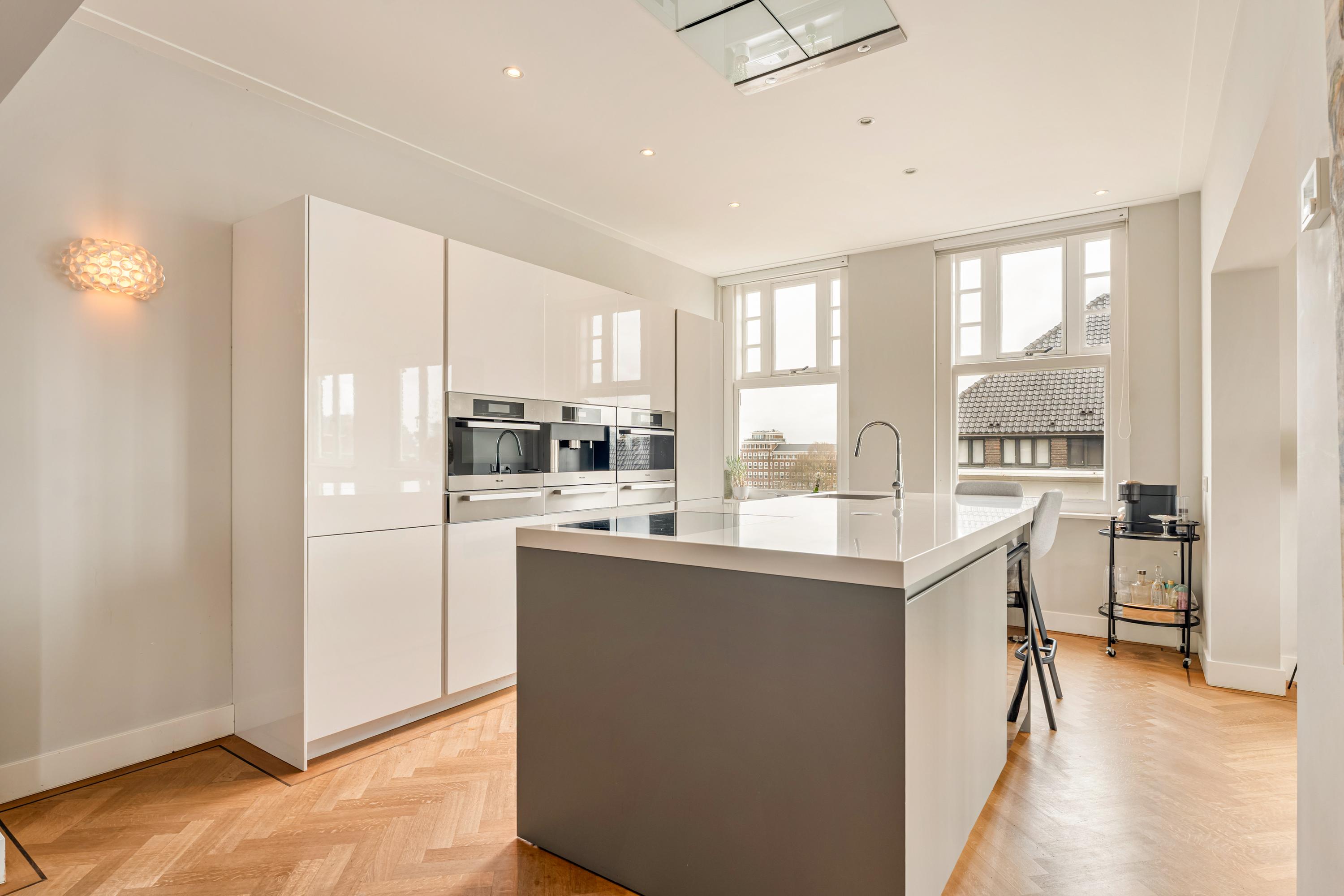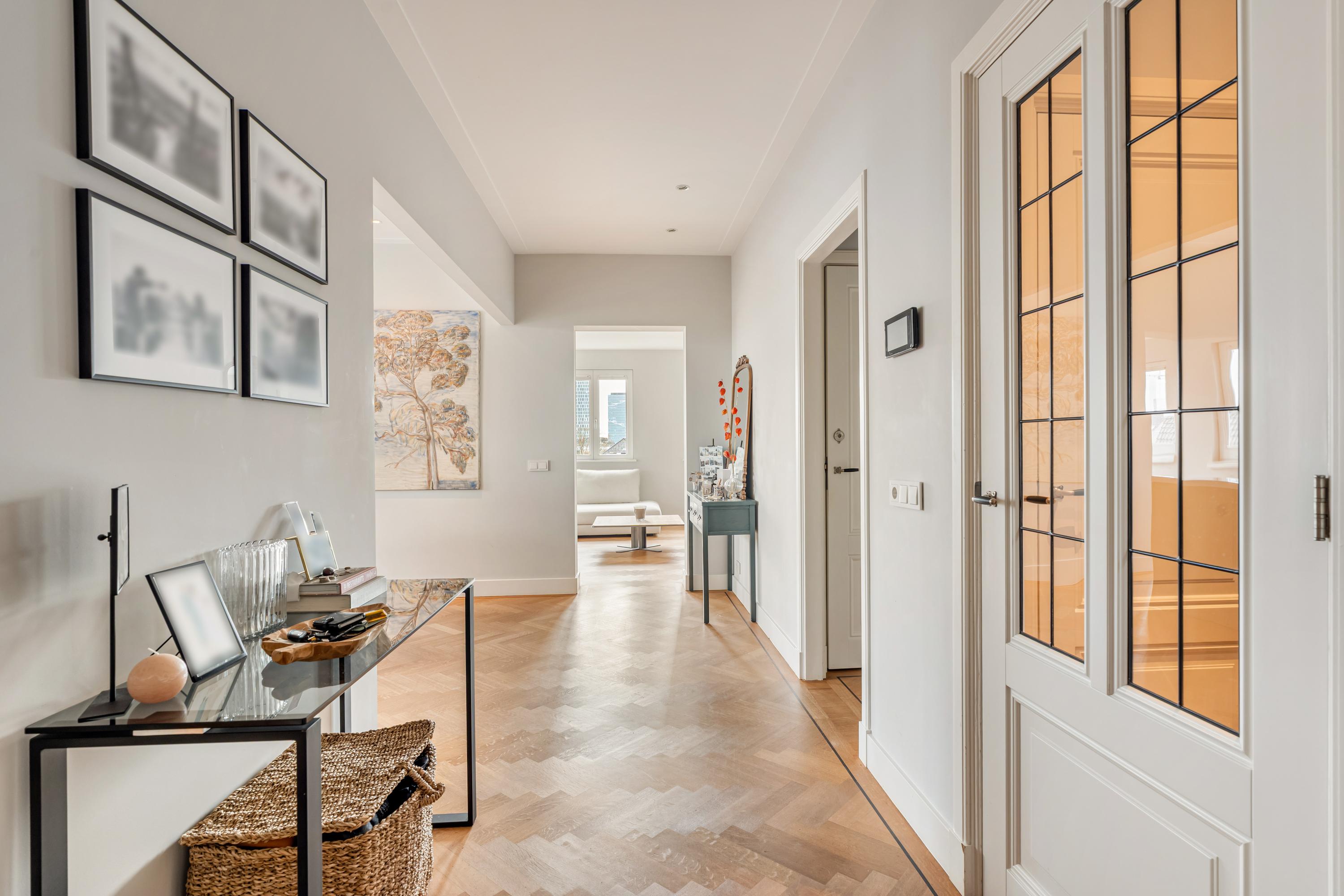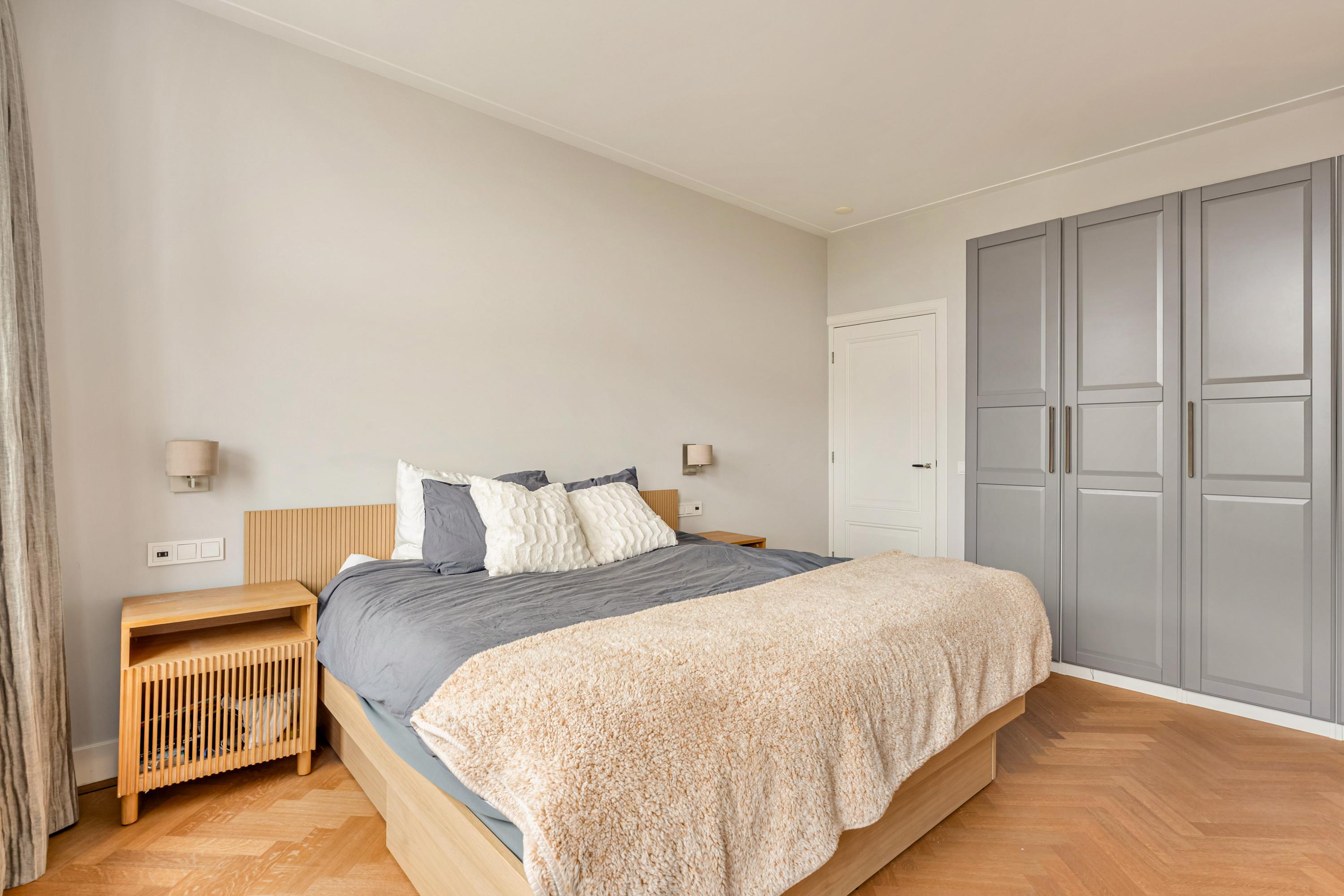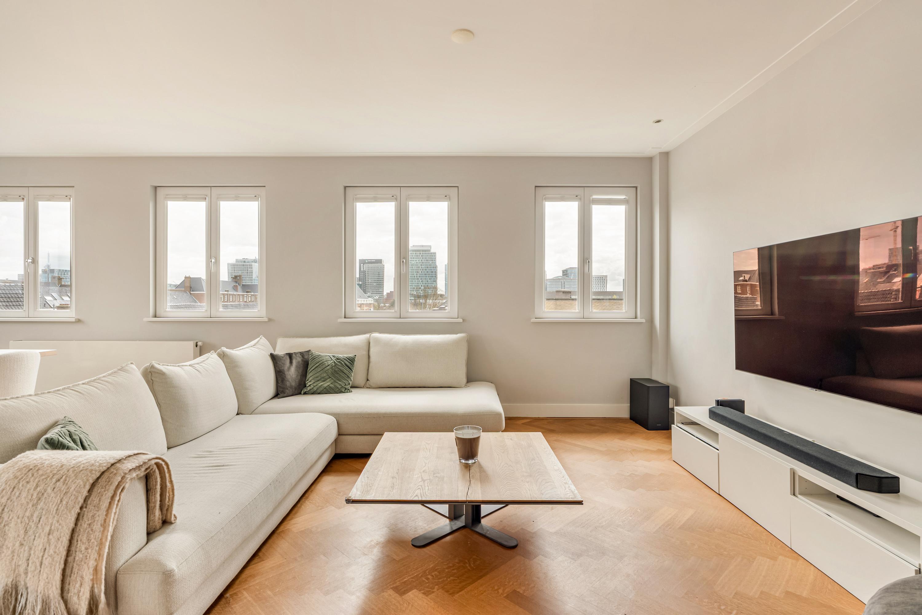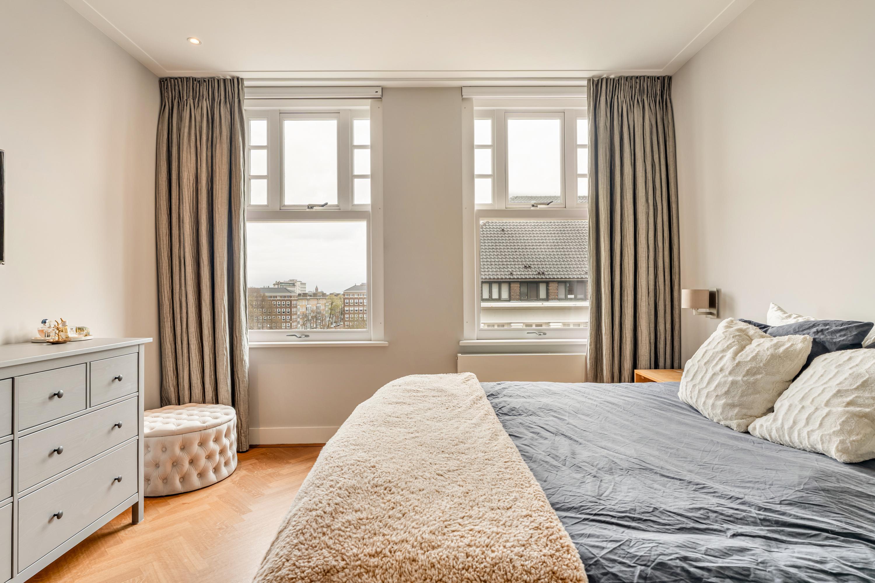 El apartamento dispone de dos dormitorios y una lujosa cocina de estilo abierto, equipada con electrodomésticos Miele de alta gama y una isla de cocina a medida con barra para sentarse. Elegantes suelos de madera en espiga se extienden por toda la vivienda, combinados con marcos de ventanas renovados en madera y doble acristalamiento HR++, manteniendo el sistema corredizo característico. La distribución generosa del salón ofrece perspectivas urbanas espectaculares, cautivadoras tanto de día como bajo las luces de la ciudad en la noche. El dormitorio principal, de aproximadamente 20 m², ofrece un espacio generoso y amplio almacenamiento.