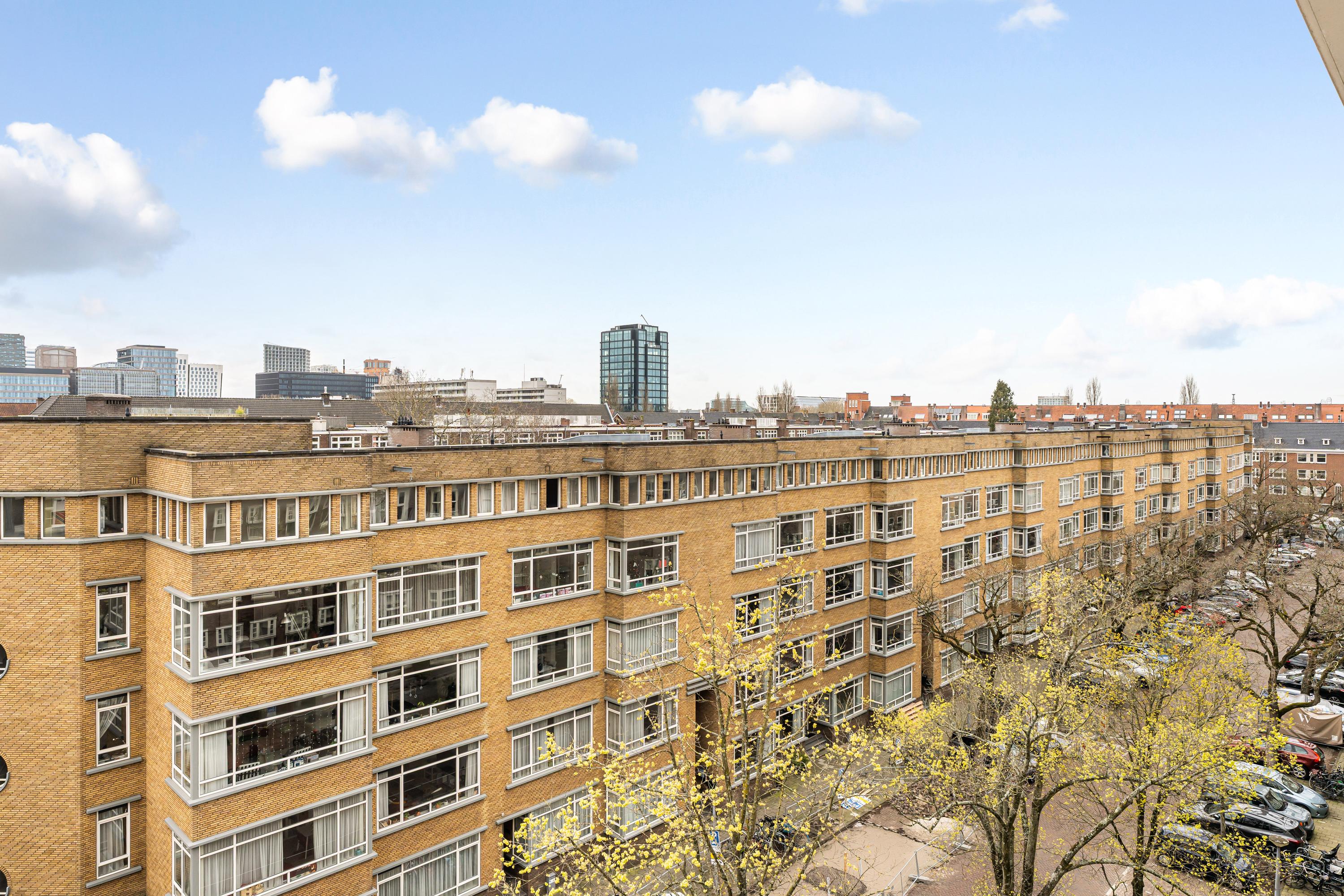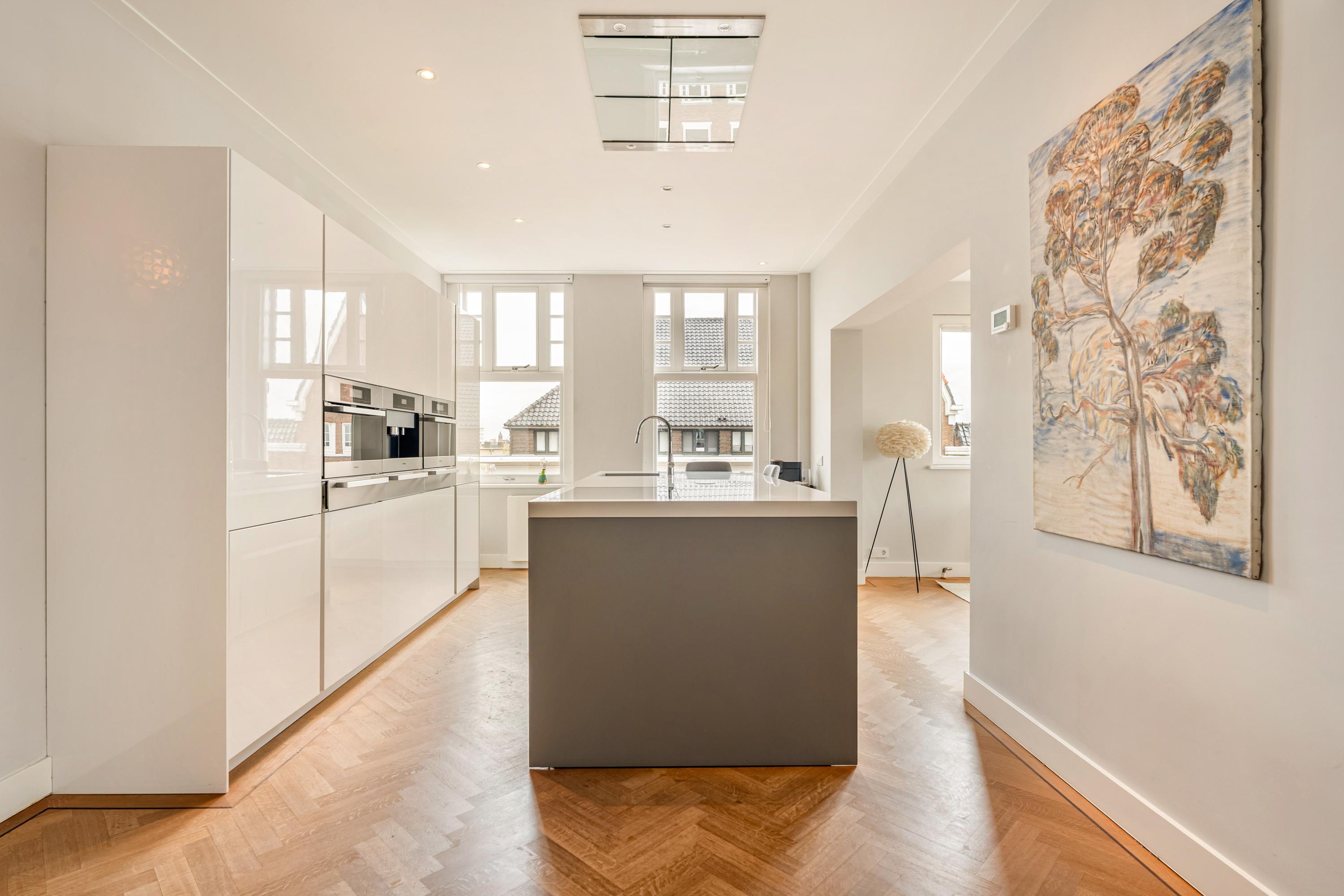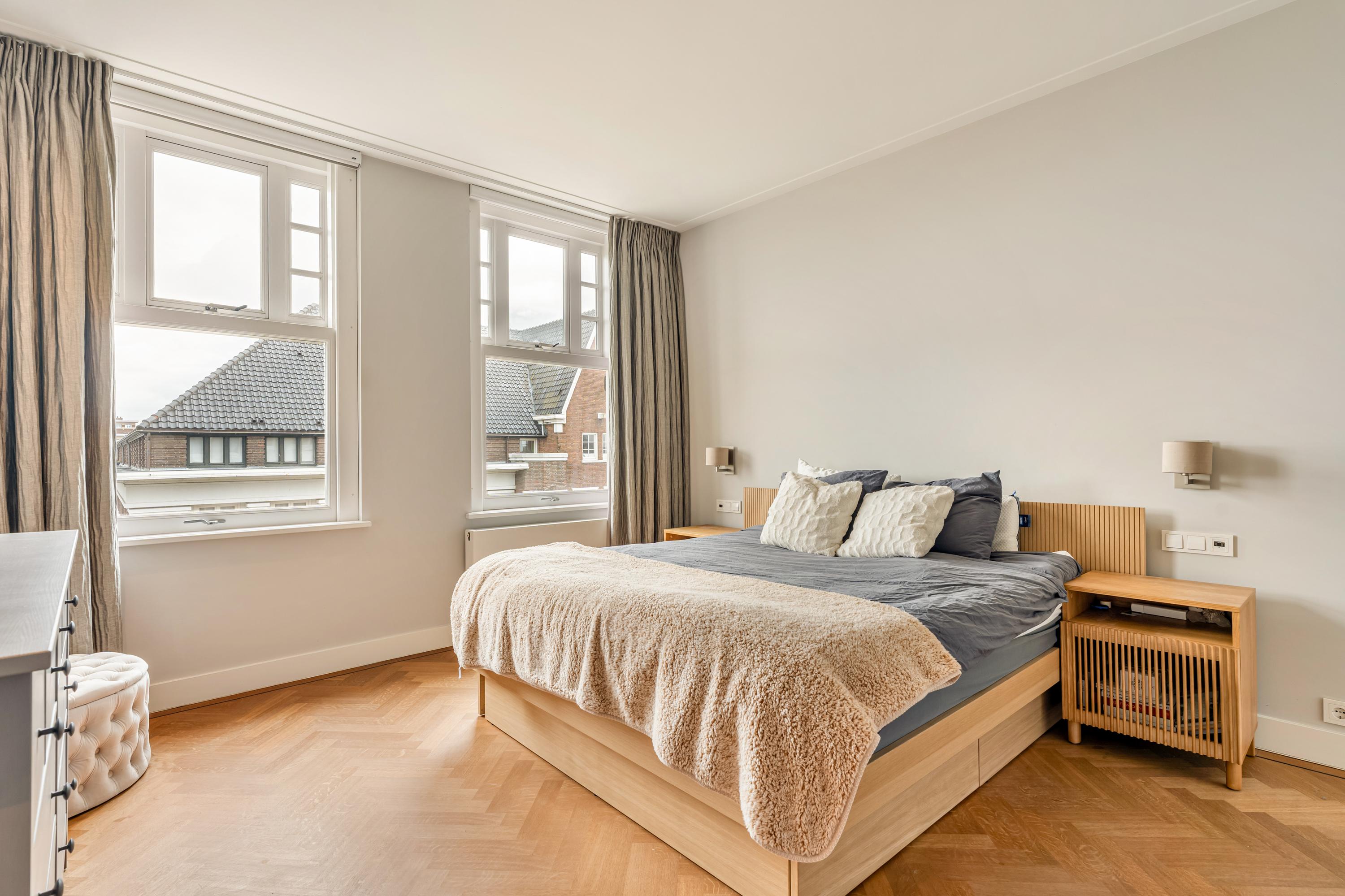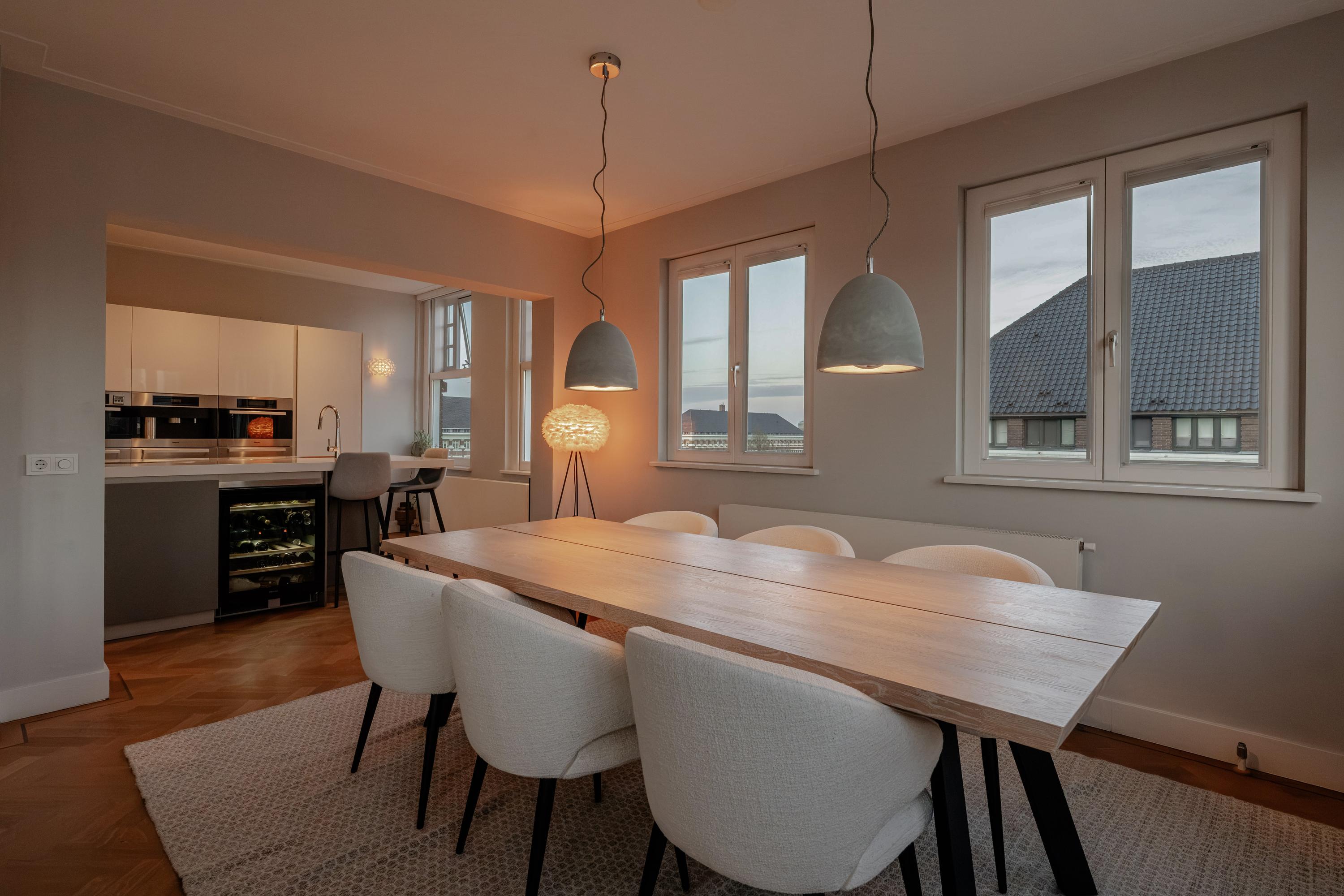 El apartamento dispone de dos dormitorios y una lujosa cocina de estilo abierto, equipada con electrodomésticos Miele de alta gama y una isla de cocina a medida con barra para sentarse. Elegantes suelos de madera en espiga se extienden por toda la vivienda, combinados con marcos de ventanas renovados en madera y doble acristalamiento HR++, manteniendo el sistema corredizo característico. La distribución generosa del salón ofrece perspectivas urbanas espectaculares, cautivadoras tanto de día como bajo las luces de la ciudad en la noche. El dormitorio principal, de aproximadamente 20 m², ofrece un espacio generoso y amplio almacenamiento.