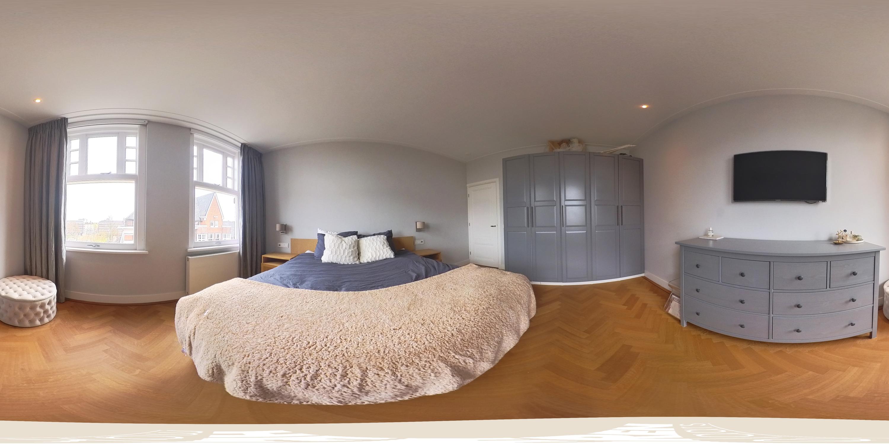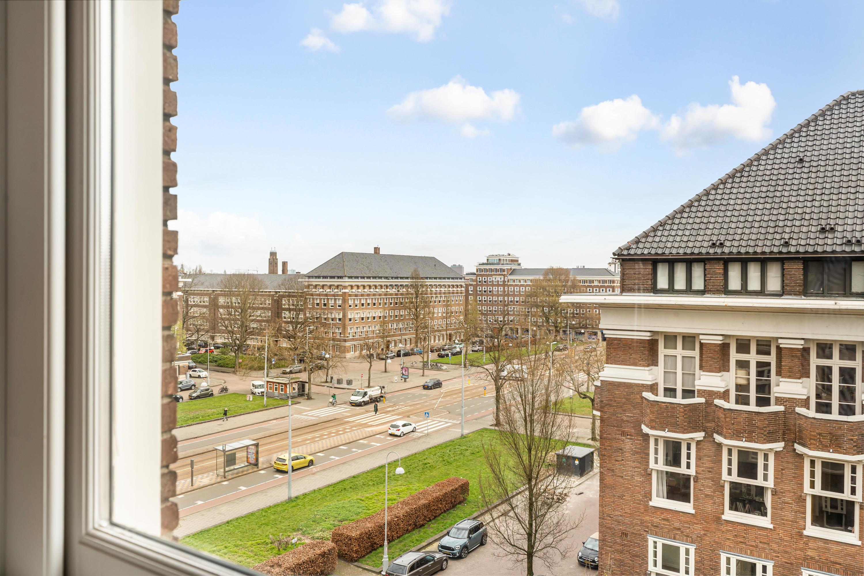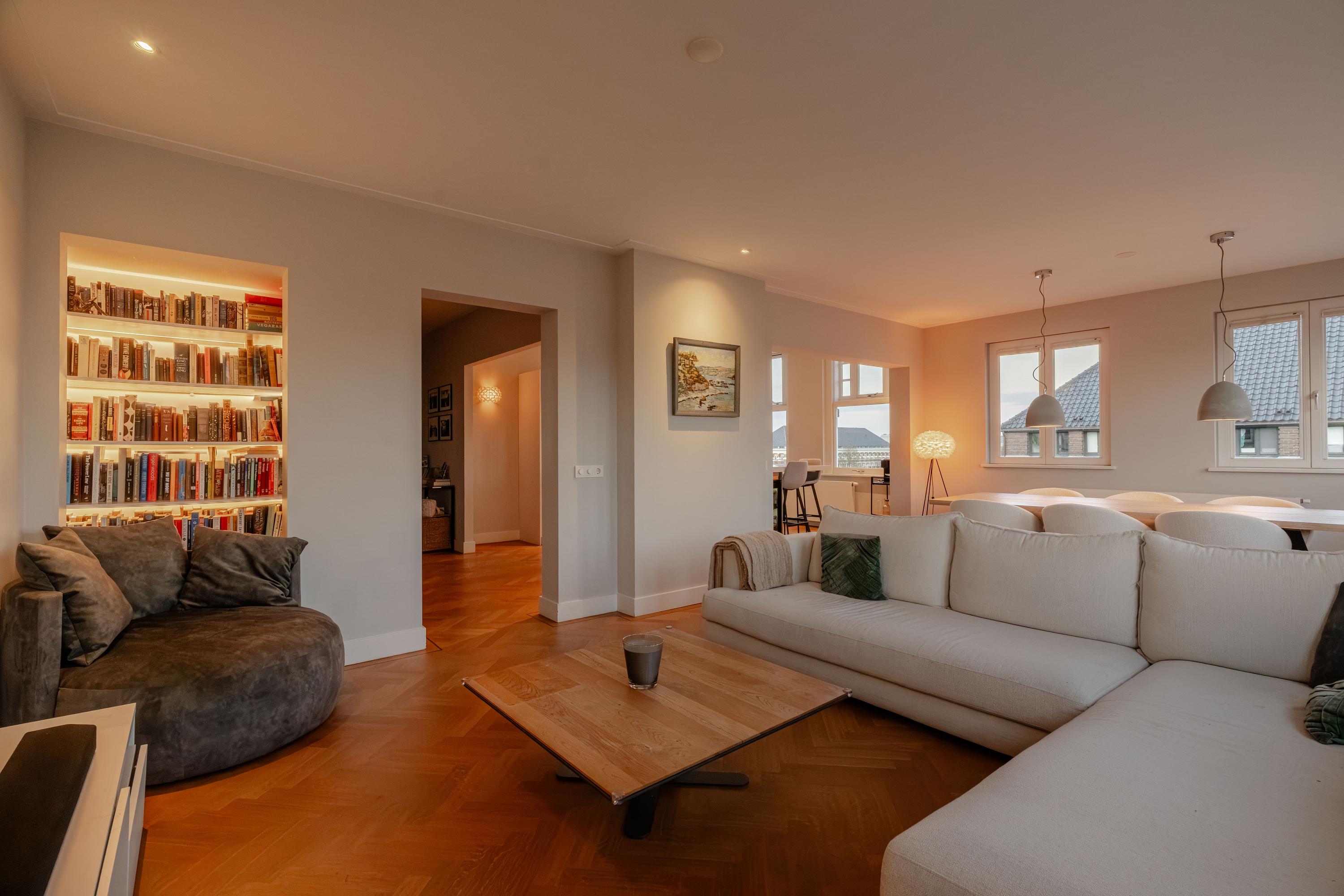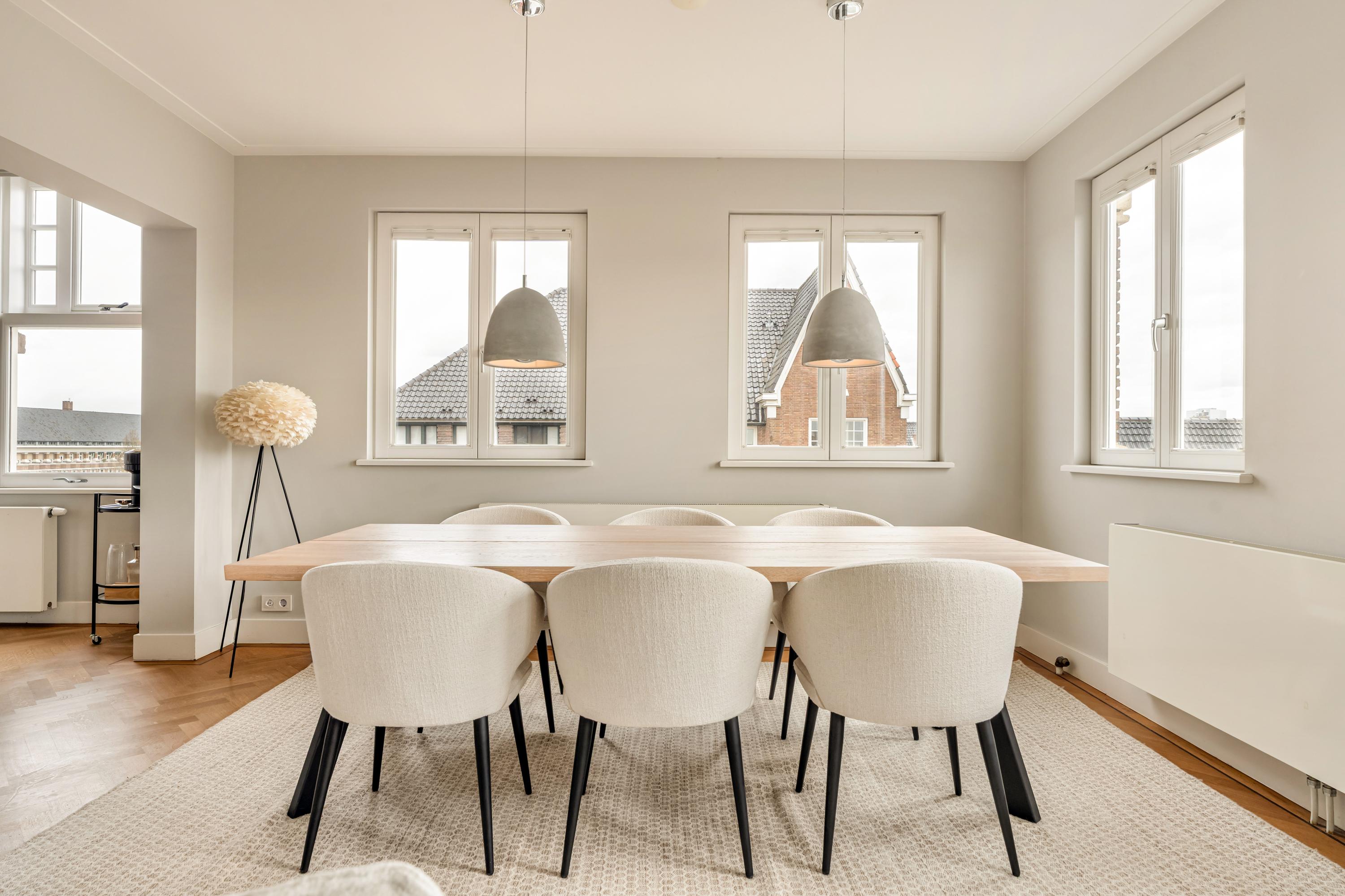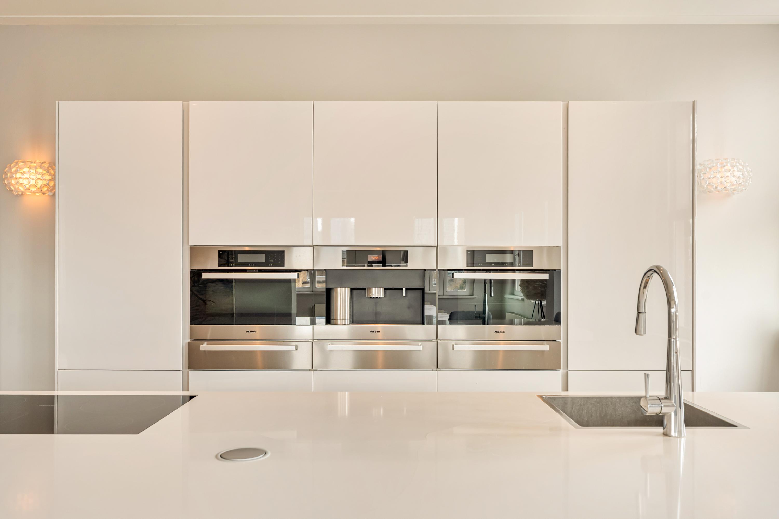 El apartamento dispone de dos dormitorios y una lujosa cocina de estilo abierto, equipada con electrodomésticos Miele de alta gama y una isla de cocina a medida con barra para sentarse. Elegantes suelos de madera en espiga se extienden por toda la vivienda, combinados con marcos de ventanas renovados en madera y doble acristalamiento HR++, manteniendo el sistema corredizo característico. La distribución generosa del salón ofrece perspectivas urbanas espectaculares, cautivadoras tanto de día como bajo las luces de la ciudad en la noche. El dormitorio principal, de aproximadamente 20 m², ofrece un espacio generoso y amplio almacenamiento.