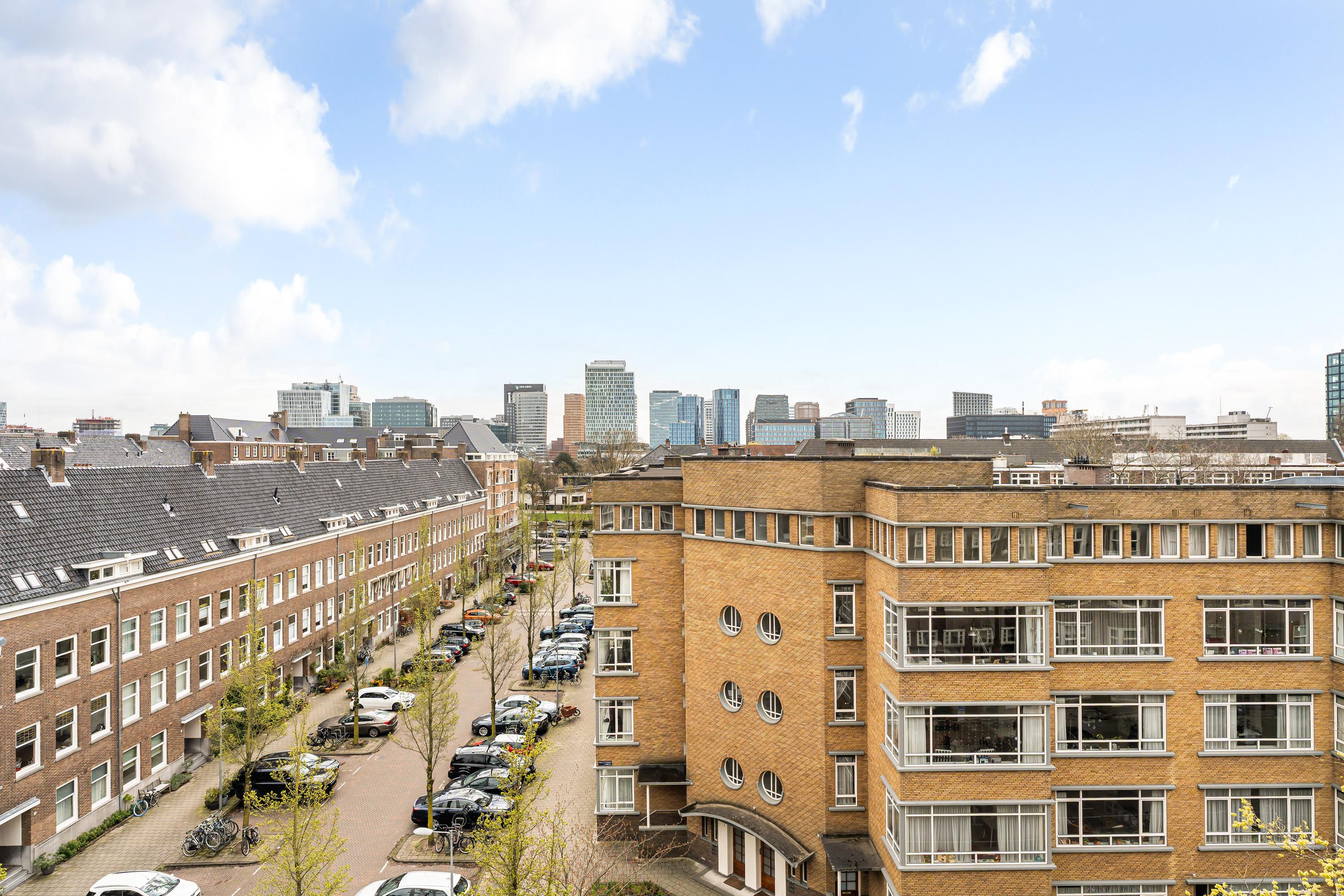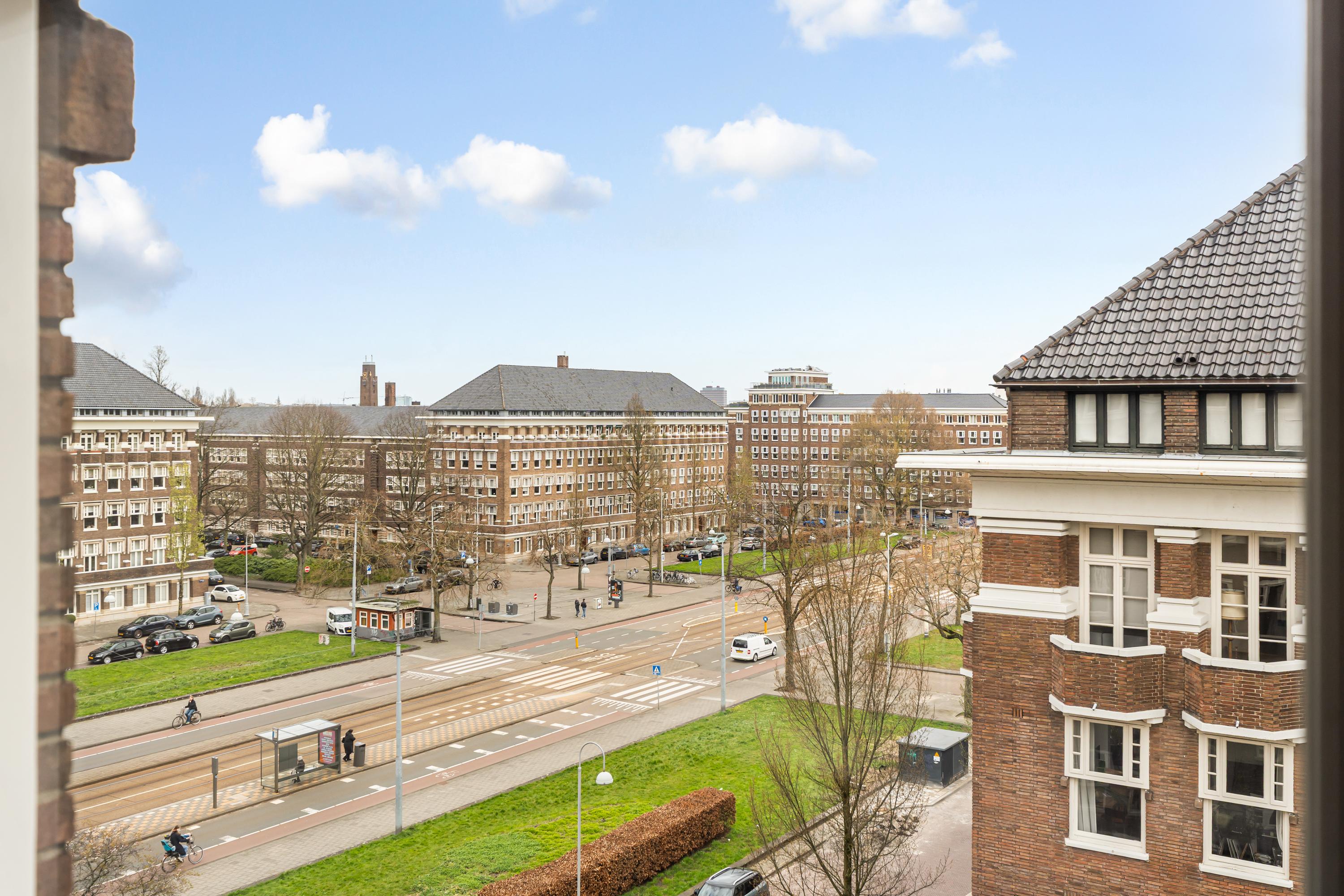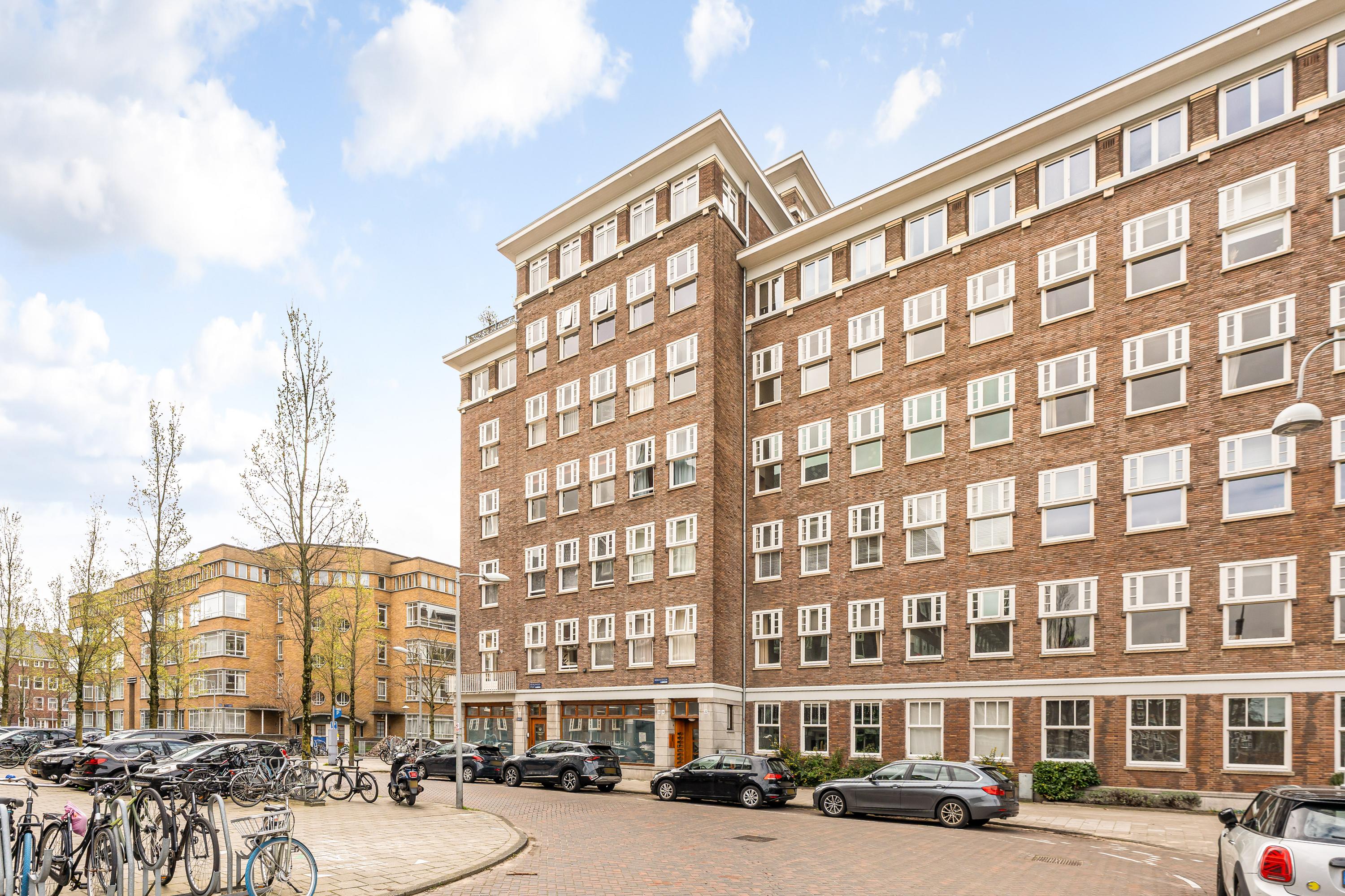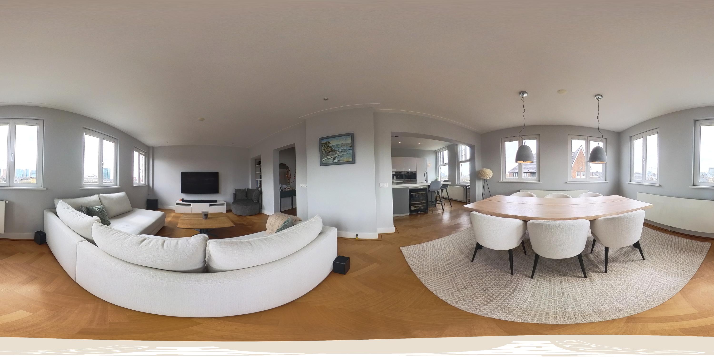 El apartamento dispone de dos dormitorios y una lujosa cocina de estilo abierto, equipada con electrodomésticos Miele de alta gama y una isla de cocina a medida con barra para sentarse. Elegantes suelos de madera en espiga se extienden por toda la vivienda, combinados con marcos de ventanas renovados en madera y doble acristalamiento HR++, manteniendo el sistema corredizo característico. La distribución generosa del salón ofrece perspectivas urbanas espectaculares, cautivadoras tanto de día como bajo las luces de la ciudad en la noche. El dormitorio principal, de aproximadamente 20 m², ofrece un espacio generoso y amplio almacenamiento.