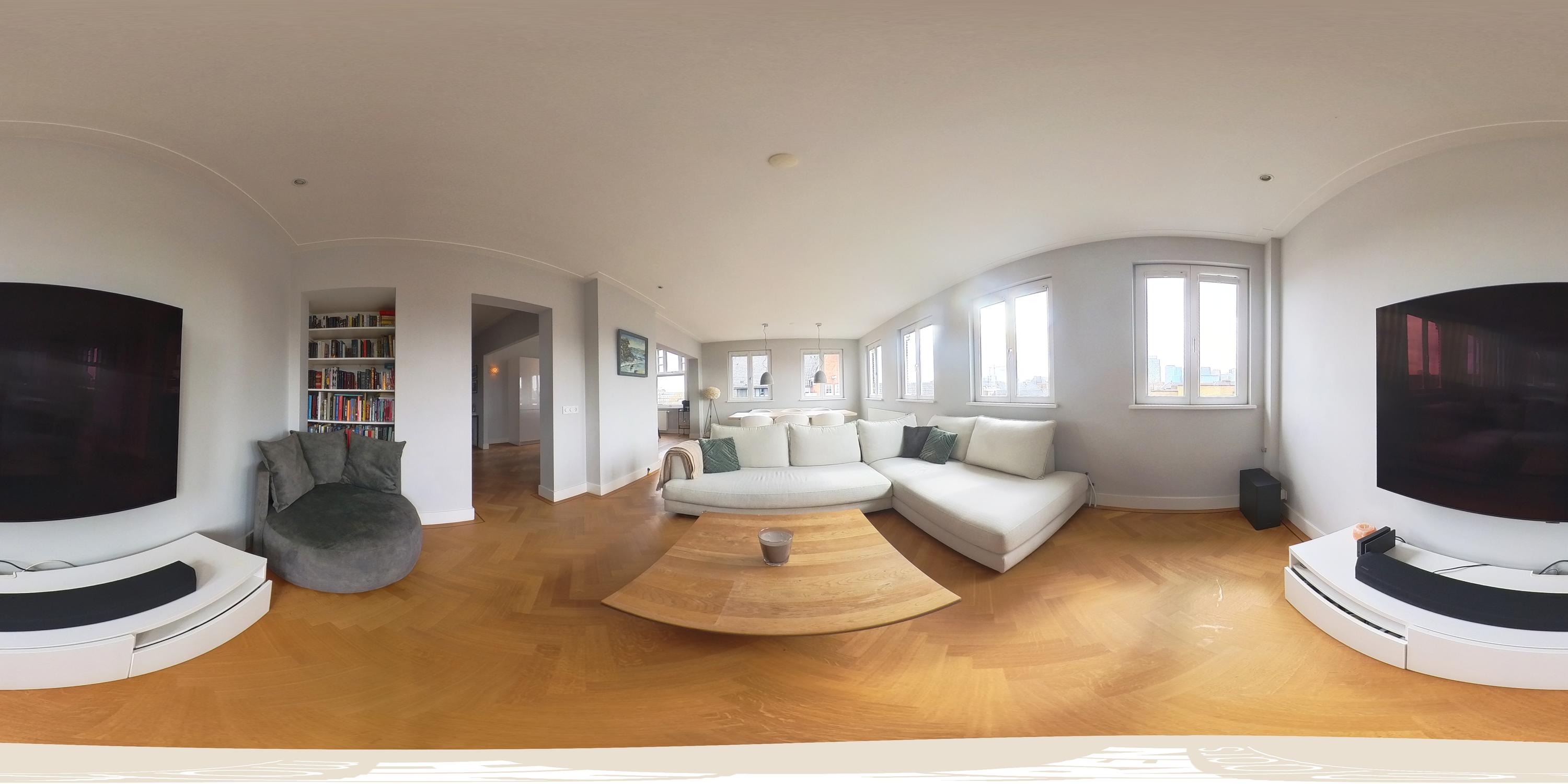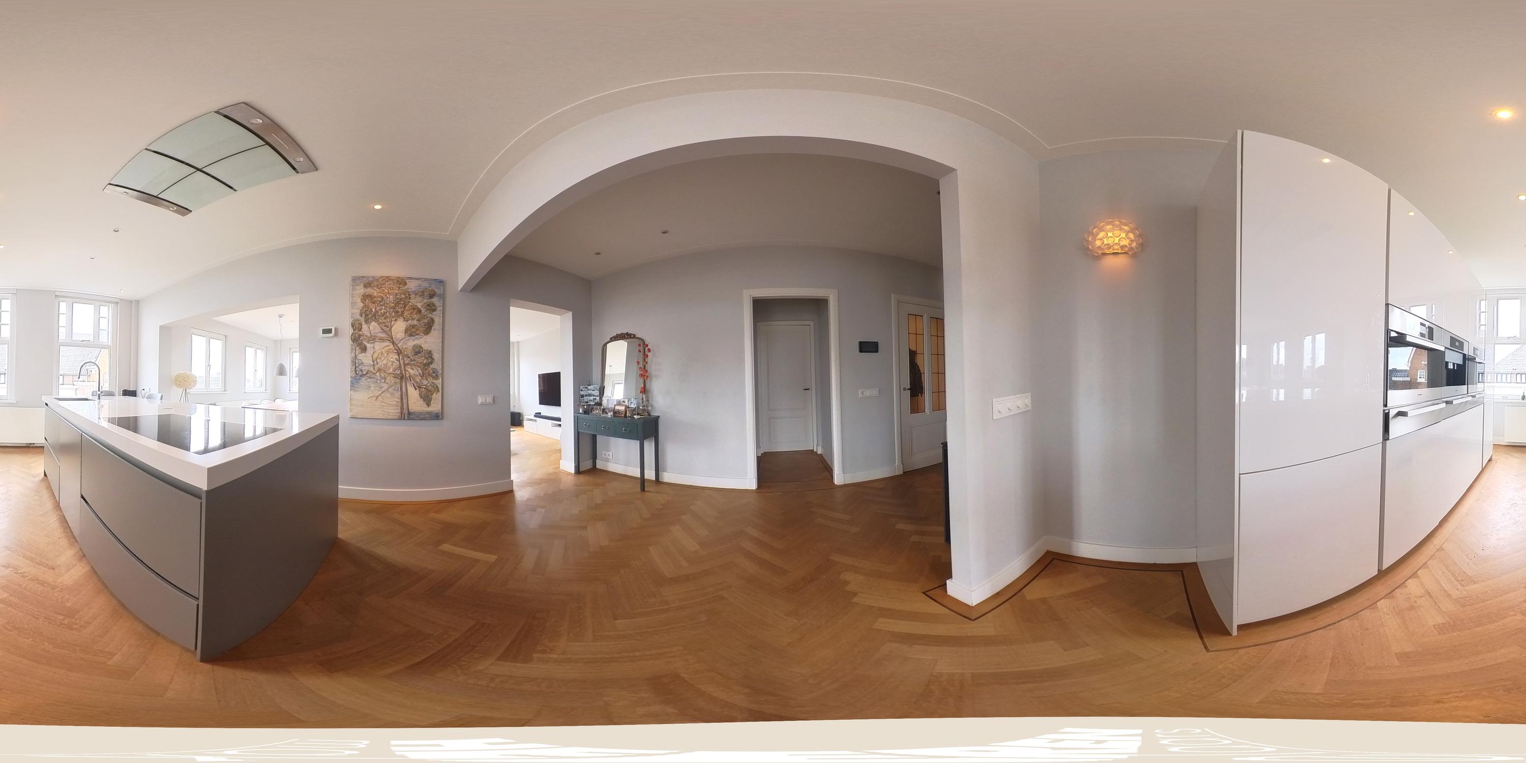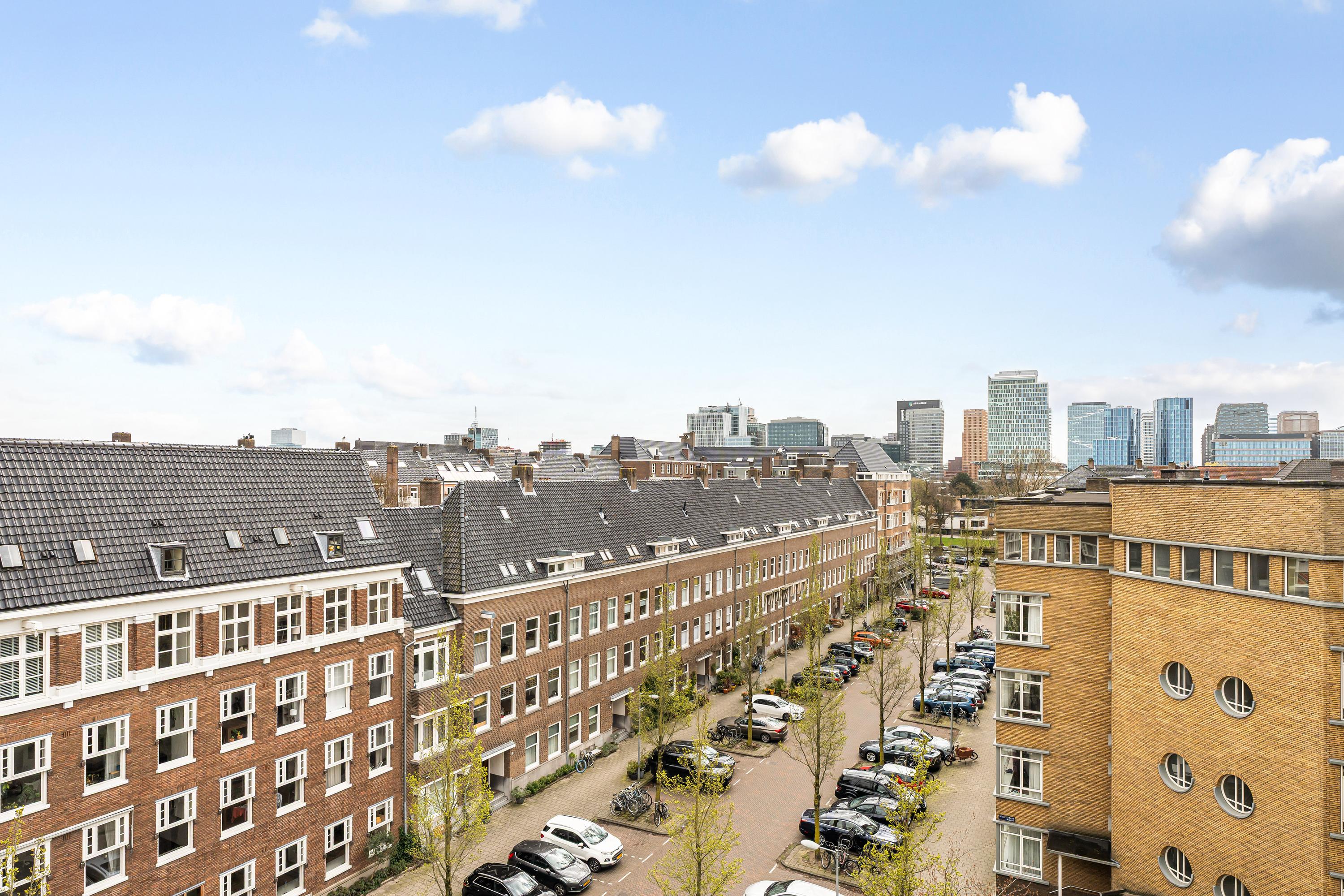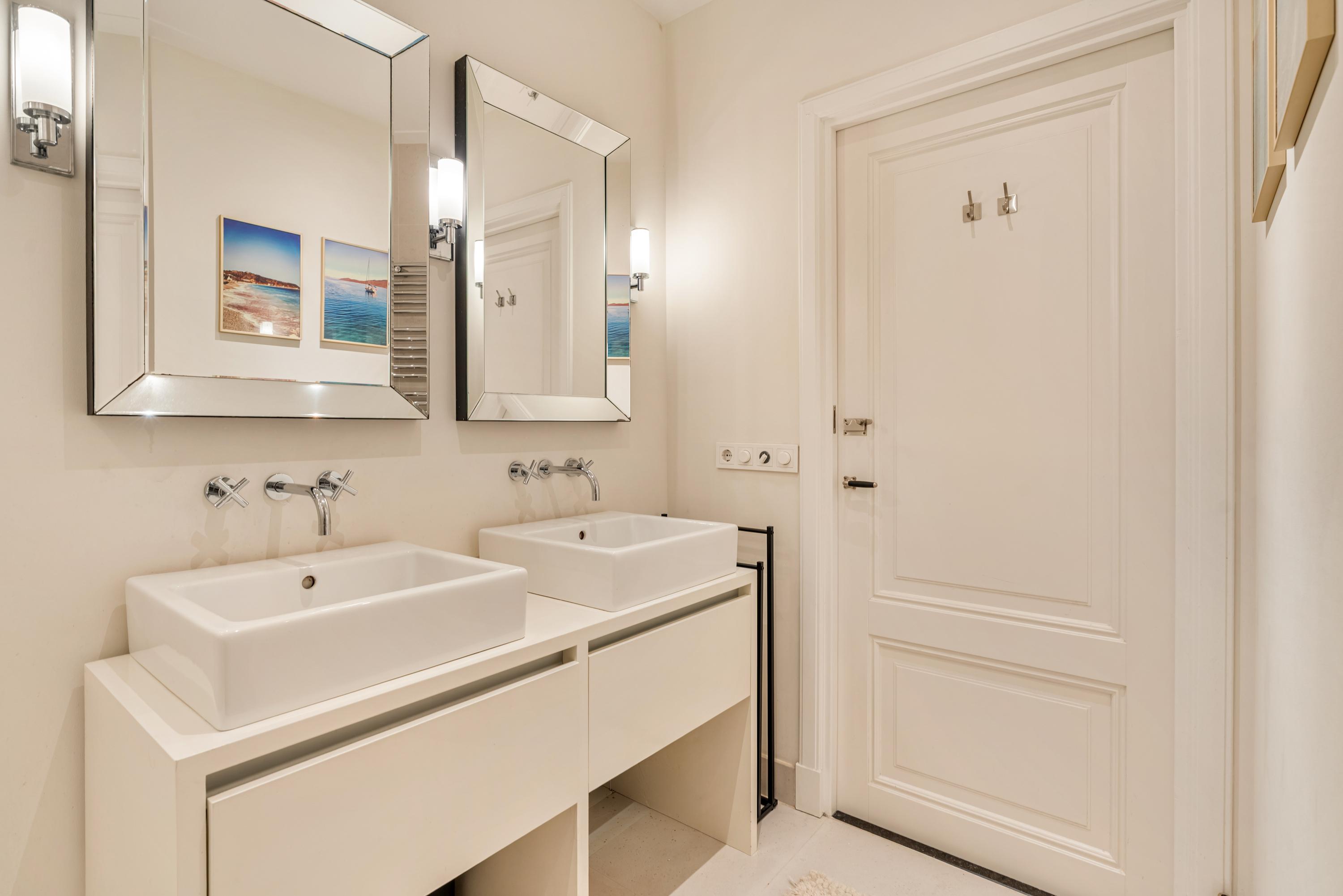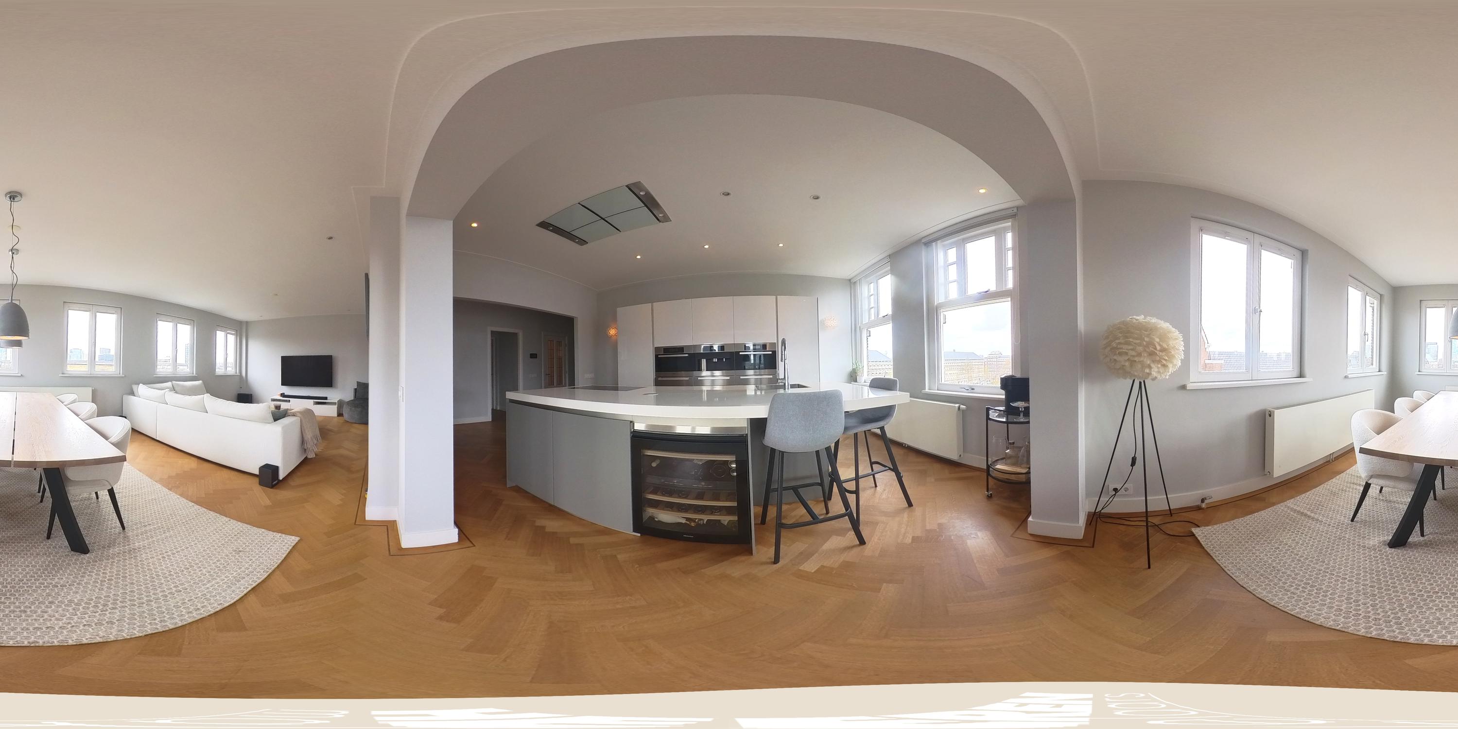 El apartamento dispone de dos dormitorios y una lujosa cocina de estilo abierto, equipada con electrodomésticos Miele de alta gama y una isla de cocina a medida con barra para sentarse. Elegantes suelos de madera en espiga se extienden por toda la vivienda, combinados con marcos de ventanas renovados en madera y doble acristalamiento HR++, manteniendo el sistema corredizo característico. La distribución generosa del salón ofrece perspectivas urbanas espectaculares, cautivadoras tanto de día como bajo las luces de la ciudad en la noche. El dormitorio principal, de aproximadamente 20 m², ofrece un espacio generoso y amplio almacenamiento.