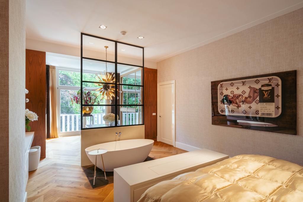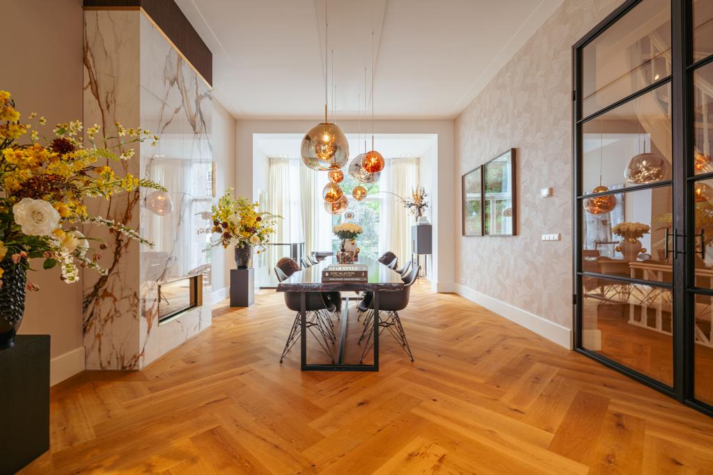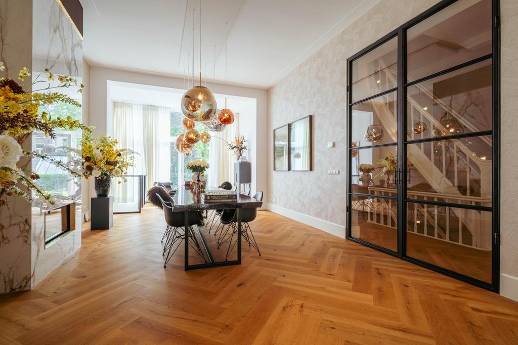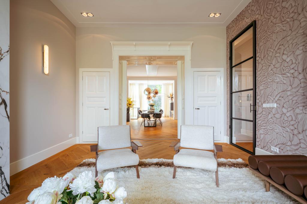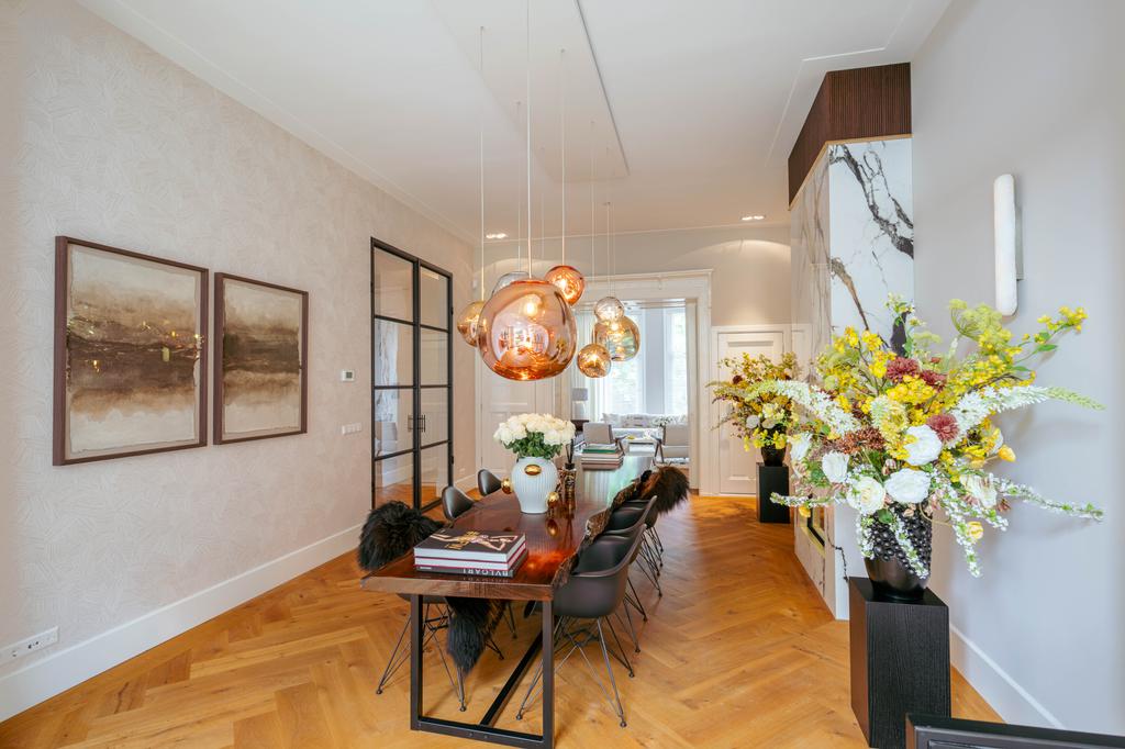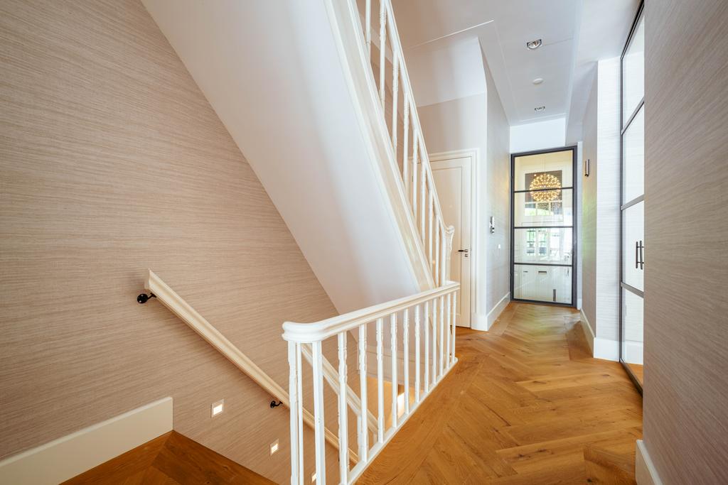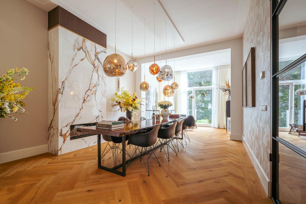 Al entrar por un vestíbulo revestido de mármol, la luz y el ambiente cambian con suelos de madera en espiga, puertas pivotantes de acero y detalles de mármol. El espacio principal, definido por las puertas en suite originales y el mobiliario empotrado, da al Vondelpark y se llena de luz natural. Con seis dormitorios y cuatro baños, incluida una luminosa suite principal y una habitación de invitados o despacho versátil, la propiedad ofrece privacidad conectada al pulso urbano.