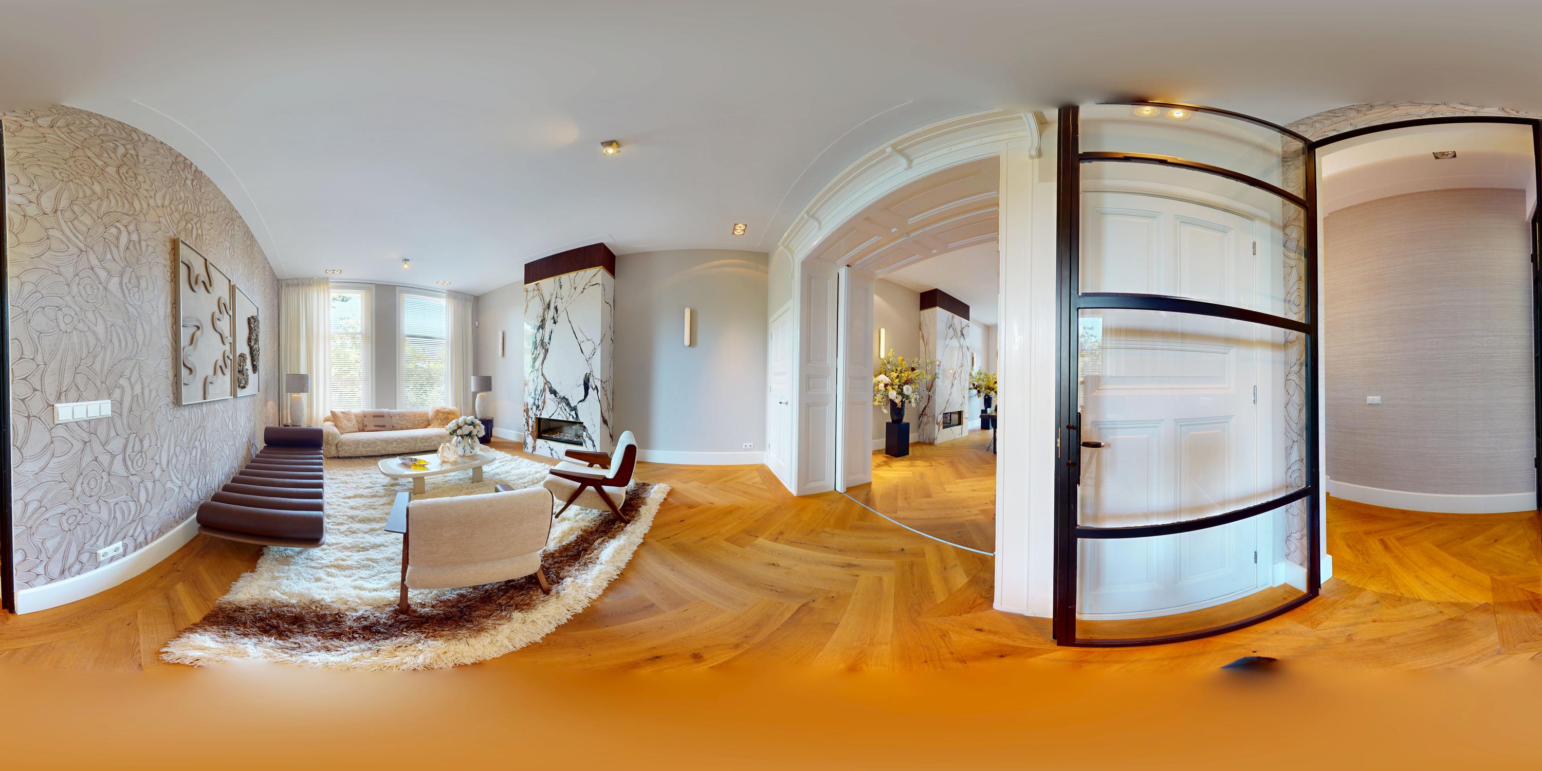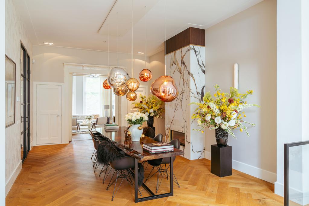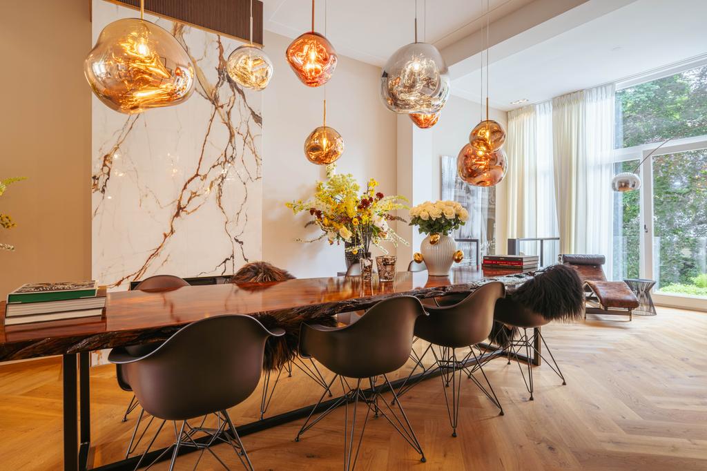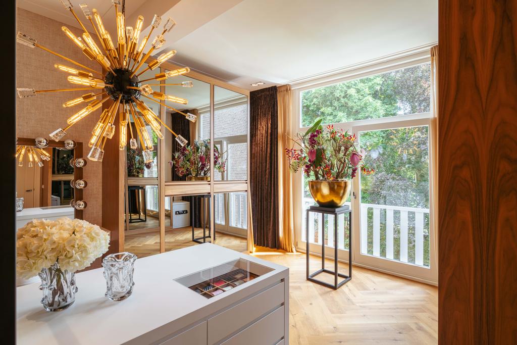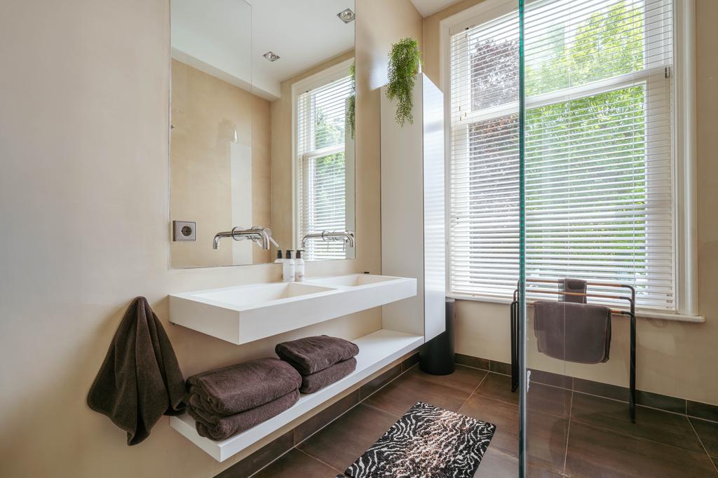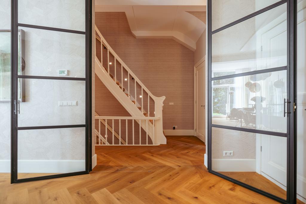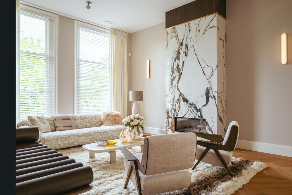 Al entrar por un vestíbulo revestido de mármol, la luz y el ambiente cambian con suelos de madera en espiga, puertas pivotantes de acero y detalles de mármol. El espacio principal, definido por las puertas en suite originales y el mobiliario empotrado, da al Vondelpark y se llena de luz natural. Con seis dormitorios y cuatro baños, incluida una luminosa suite principal y una habitación de invitados o despacho versátil, la propiedad ofrece privacidad conectada al pulso urbano.