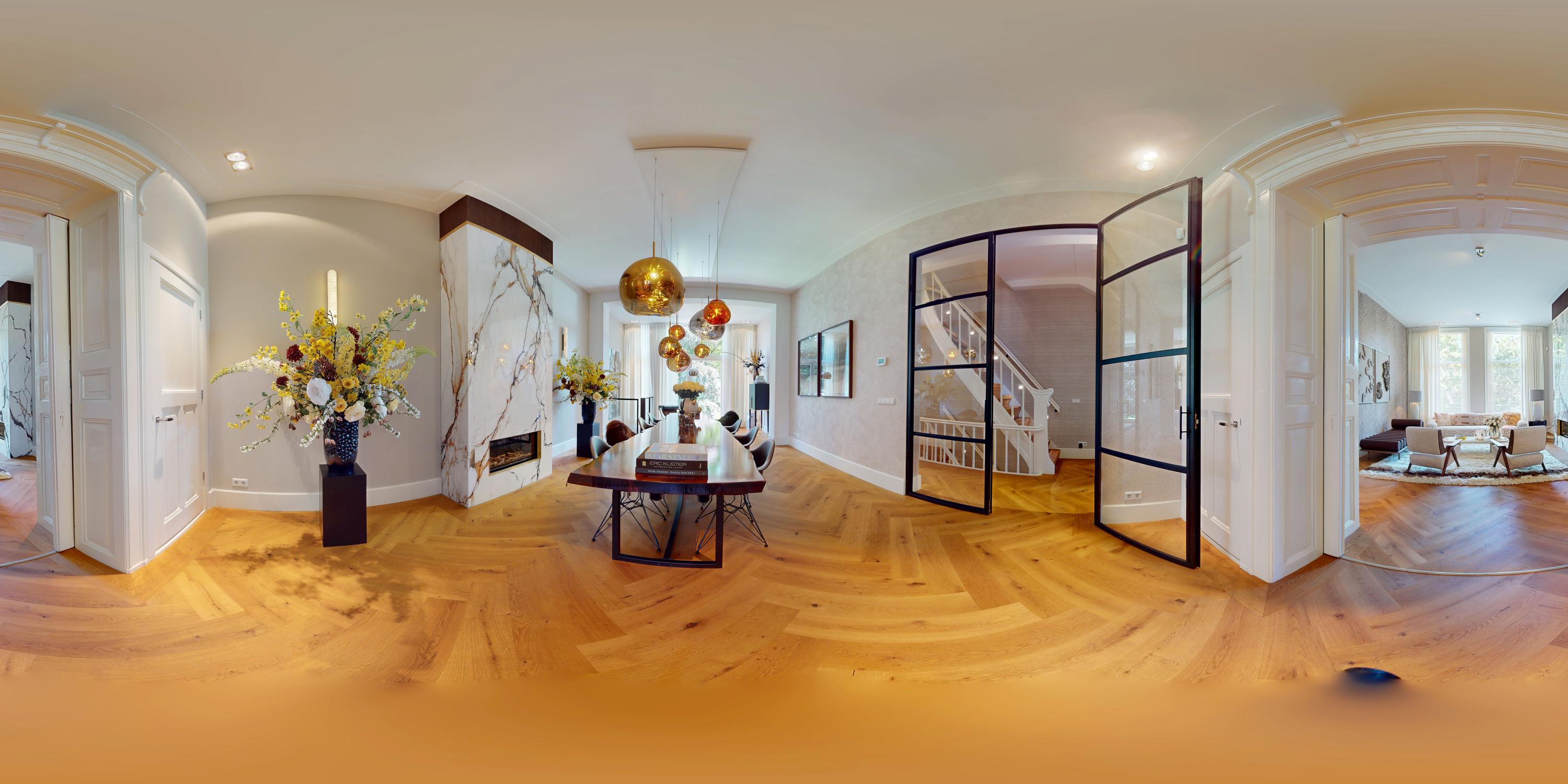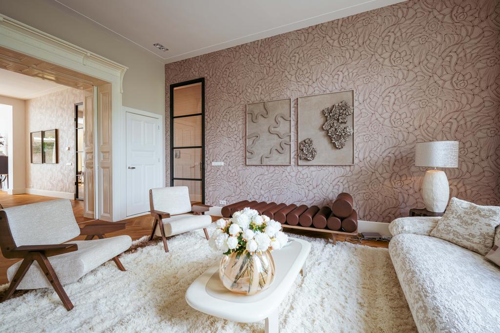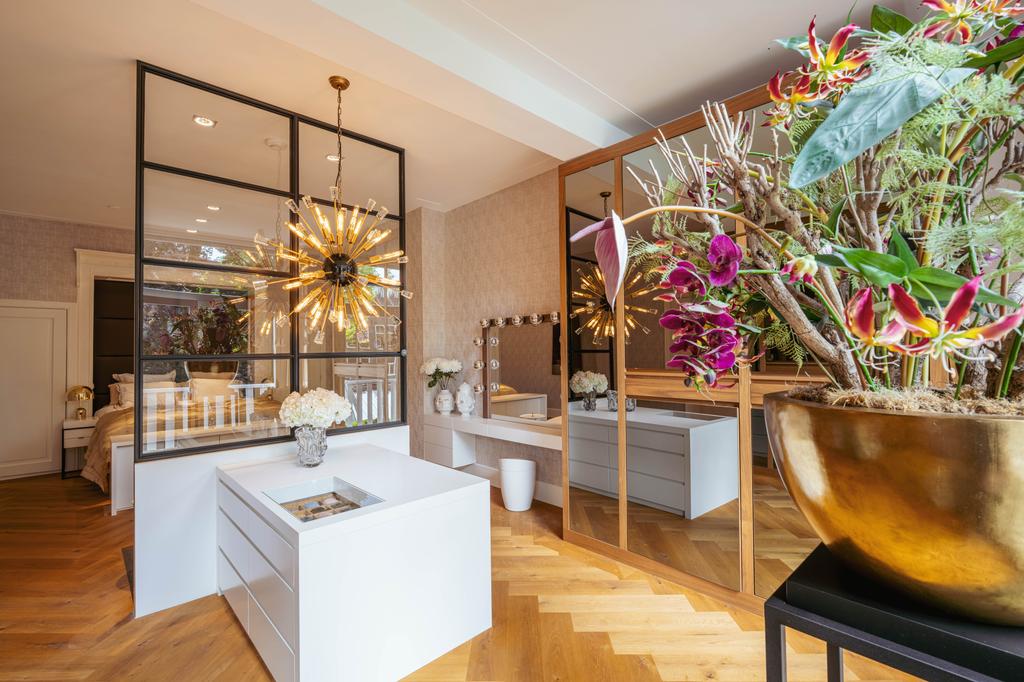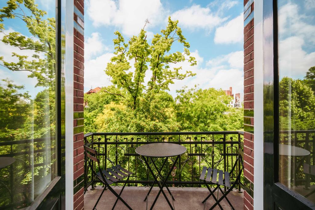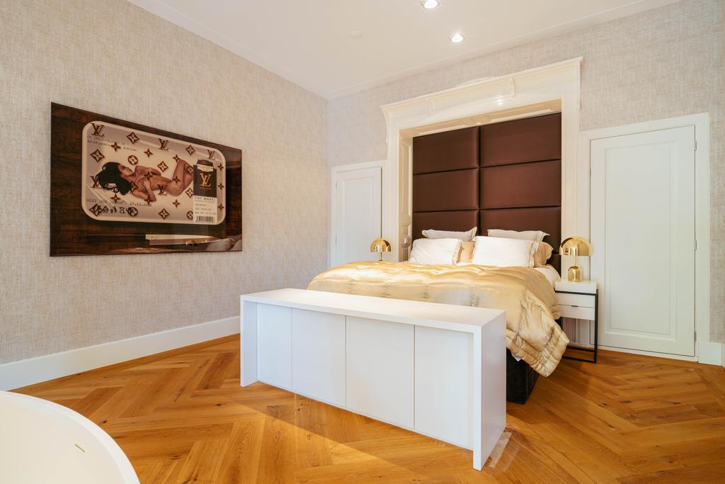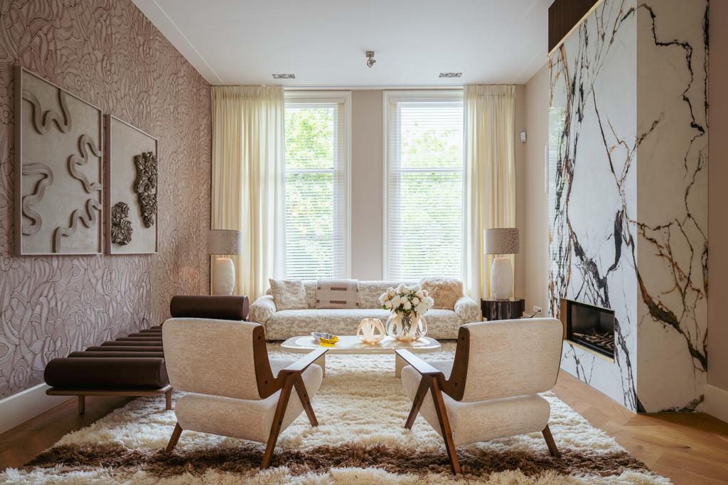 Al entrar por un vestíbulo revestido de mármol, la luz y el ambiente cambian con suelos de madera en espiga, puertas pivotantes de acero y detalles de mármol. El espacio principal, definido por las puertas en suite originales y el mobiliario empotrado, da al Vondelpark y se llena de luz natural. Con seis dormitorios y cuatro baños, incluida una luminosa suite principal y una habitación de invitados o despacho versátil, la propiedad ofrece privacidad conectada al pulso urbano.