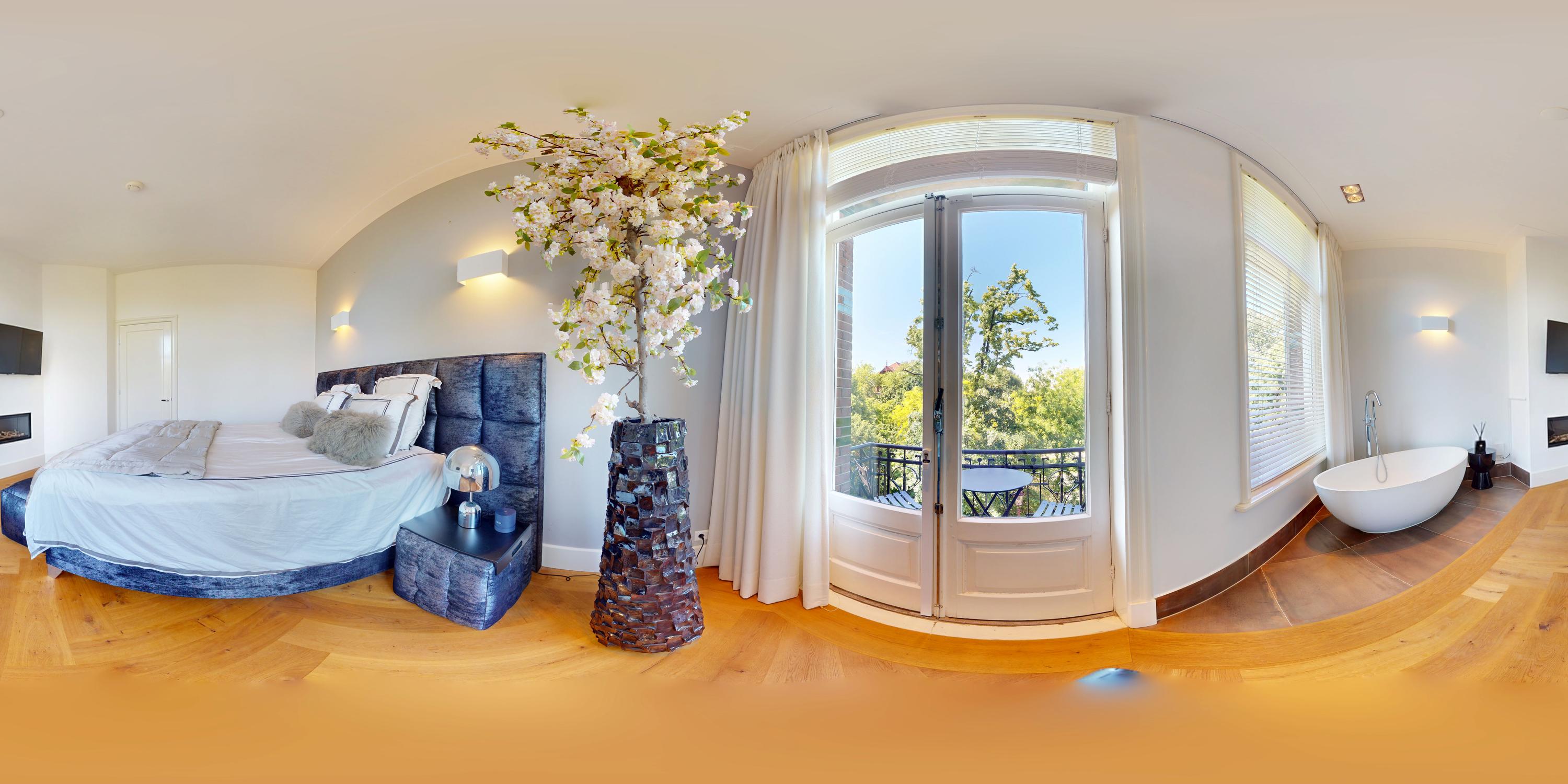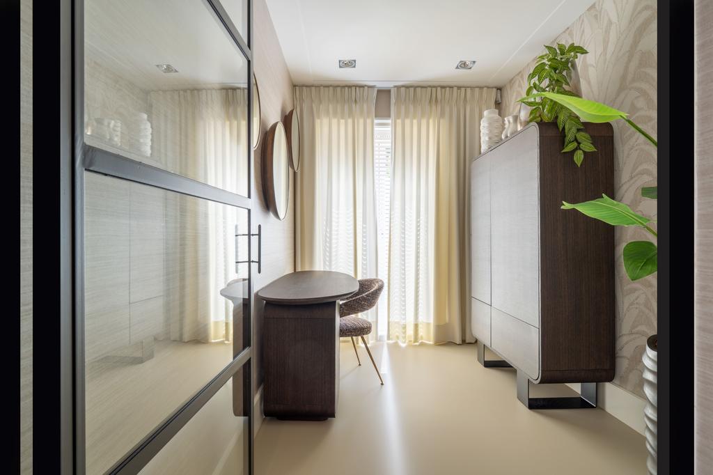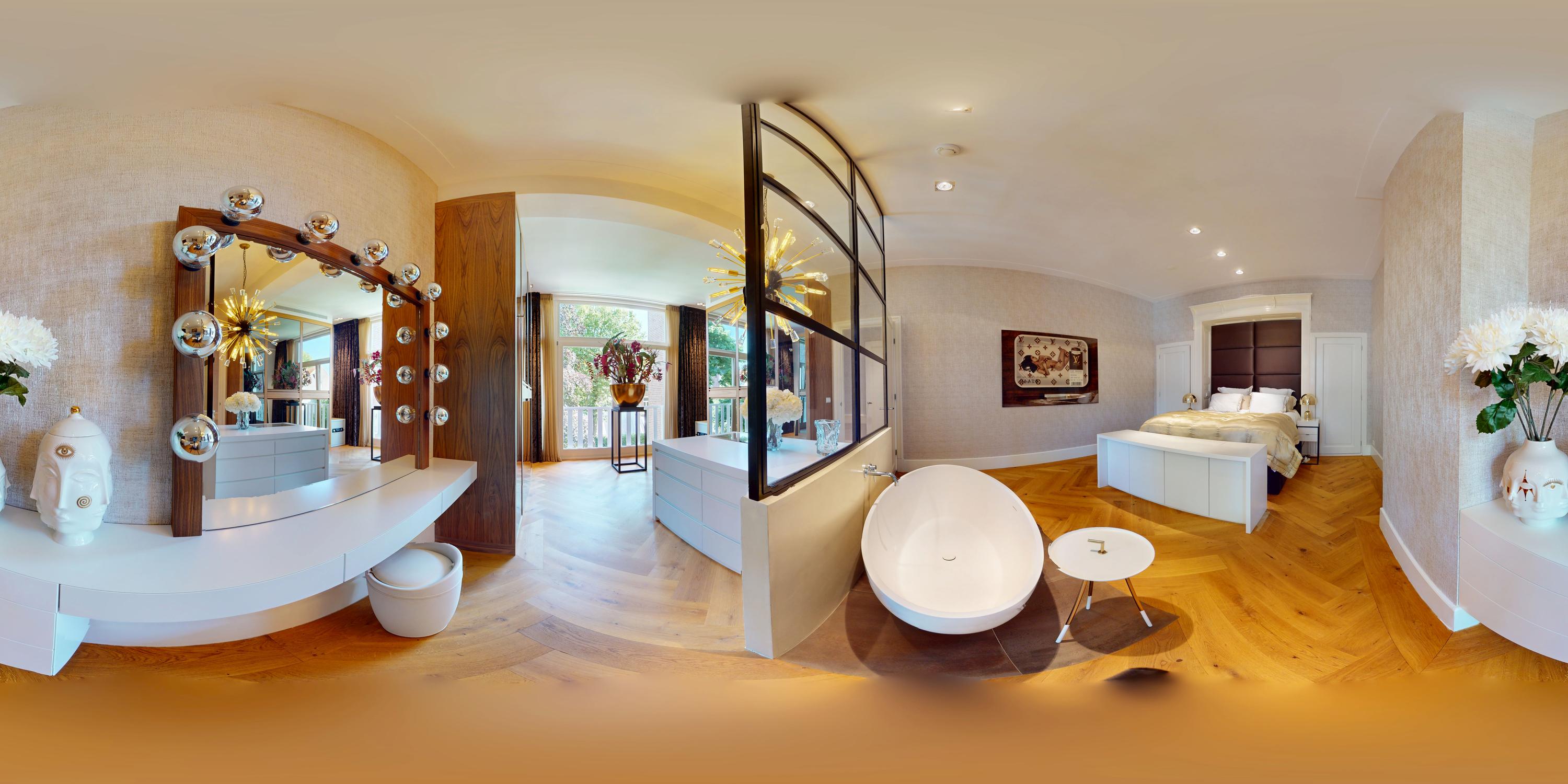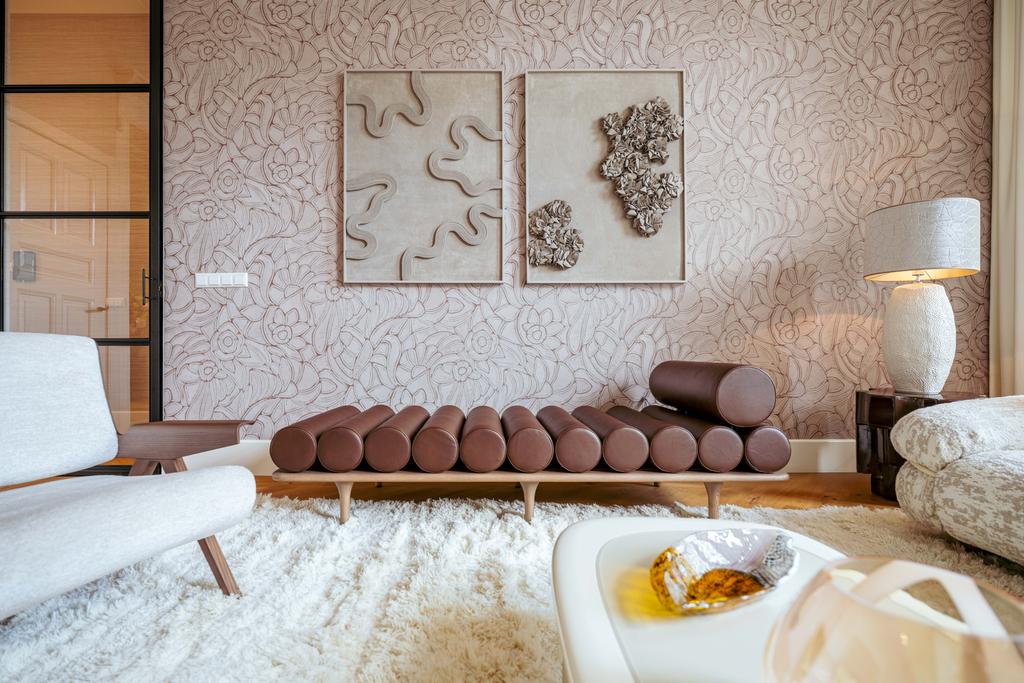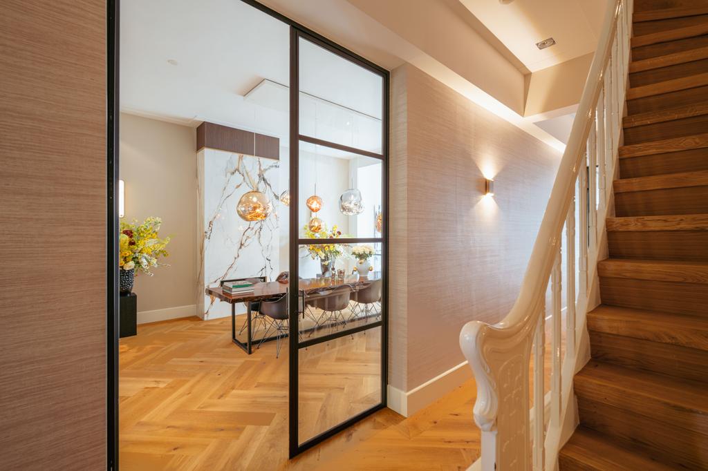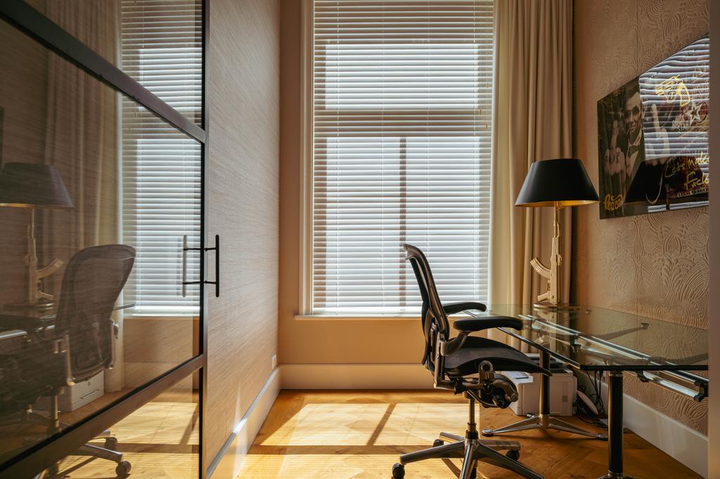 Al entrar por un vestíbulo revestido de mármol, la luz y el ambiente cambian con suelos de madera en espiga, puertas pivotantes de acero y detalles de mármol. El espacio principal, definido por las puertas en suite originales y el mobiliario empotrado, da al Vondelpark y se llena de luz natural. Con seis dormitorios y cuatro baños, incluida una luminosa suite principal y una habitación de invitados o despacho versátil, la propiedad ofrece privacidad conectada al pulso urbano.