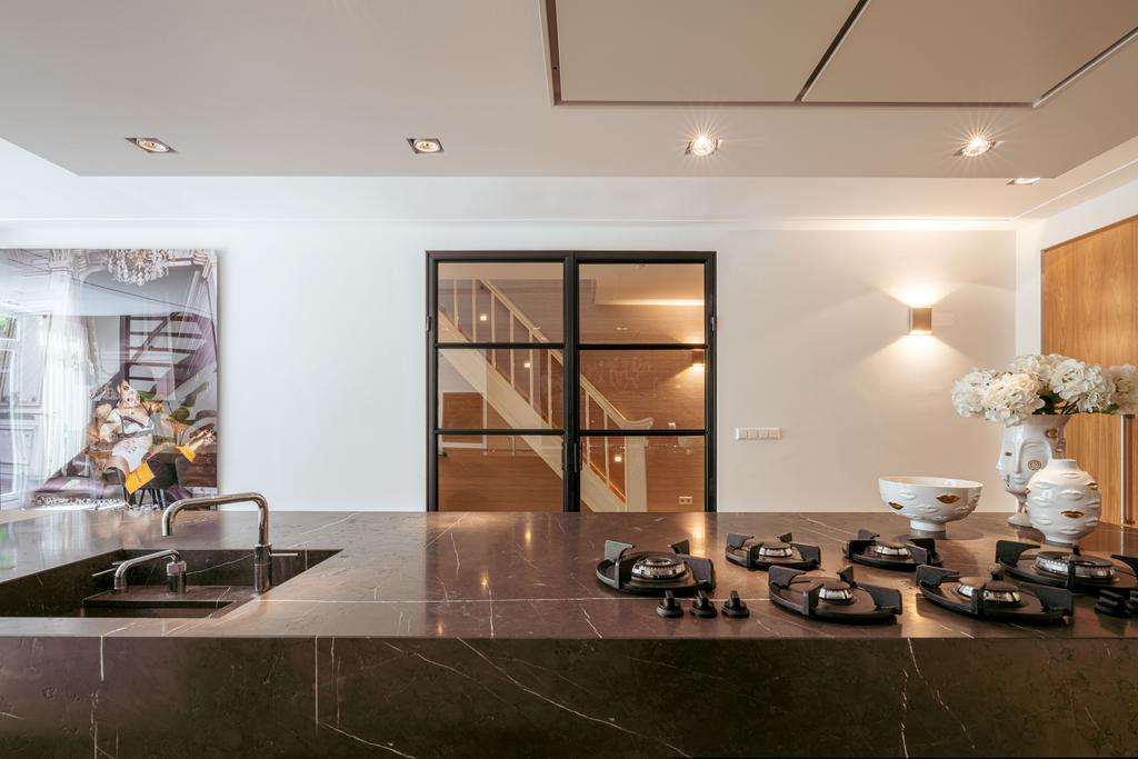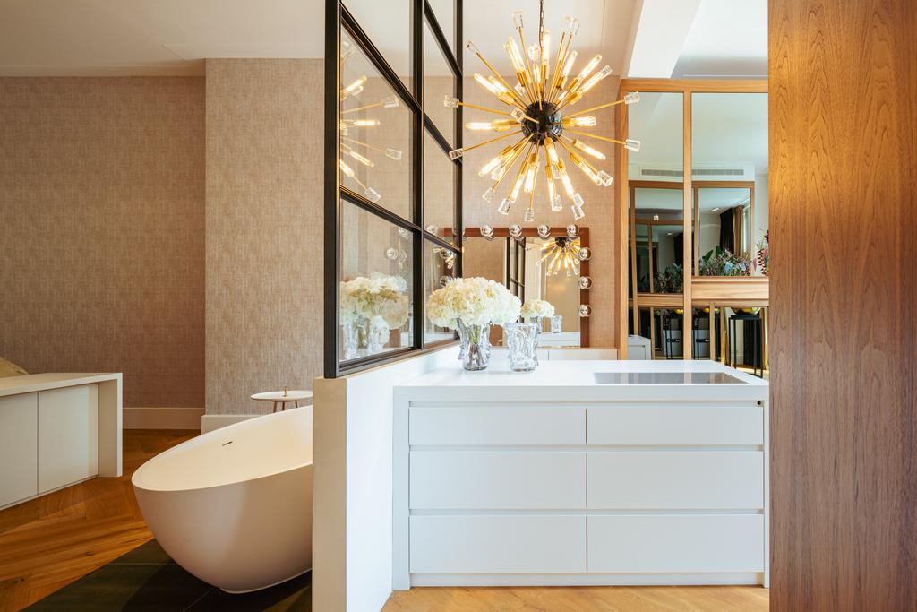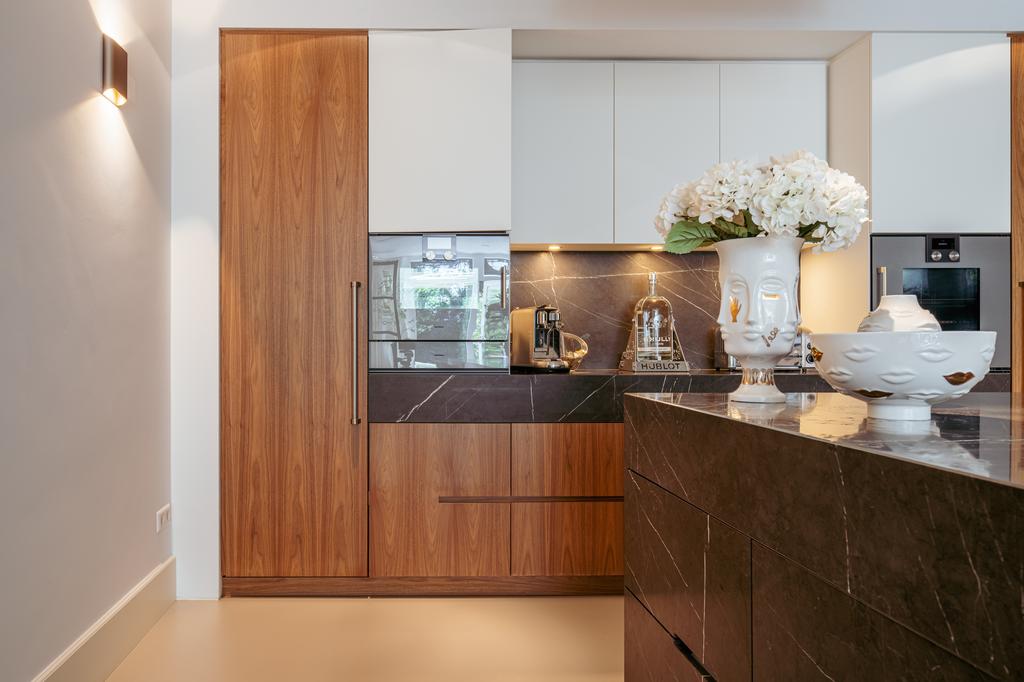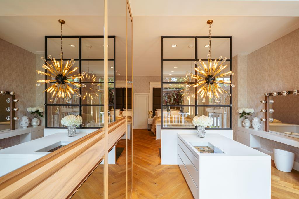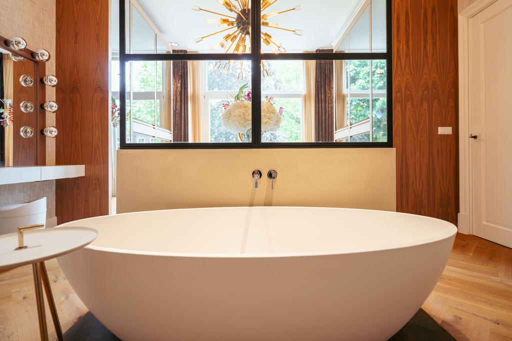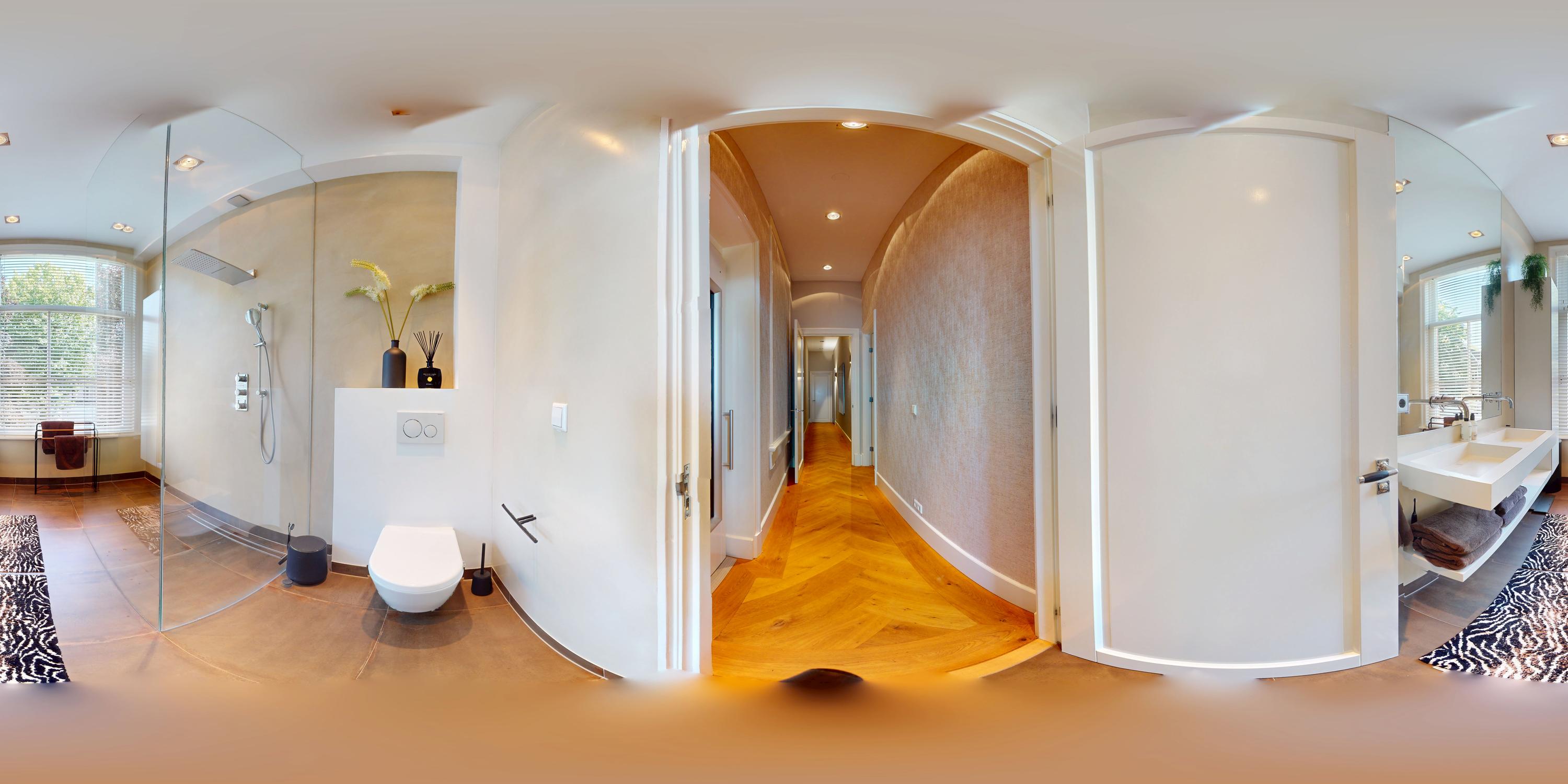 Al entrar por un vestíbulo revestido de mármol, la luz y el ambiente cambian con suelos de madera en espiga, puertas pivotantes de acero y detalles de mármol. El espacio principal, definido por las puertas en suite originales y el mobiliario empotrado, da al Vondelpark y se llena de luz natural. Con seis dormitorios y cuatro baños, incluida una luminosa suite principal y una habitación de invitados o despacho versátil, la propiedad ofrece privacidad conectada al pulso urbano.