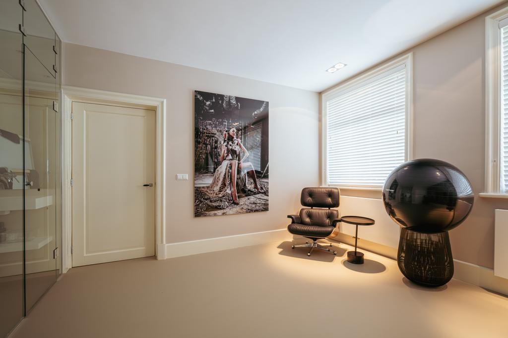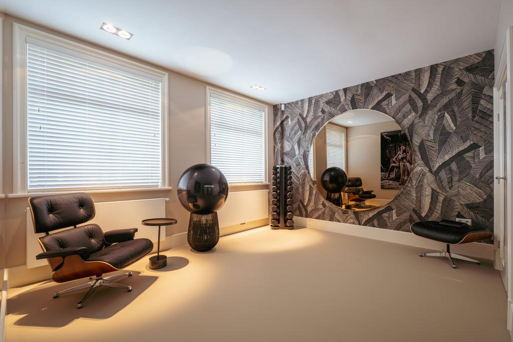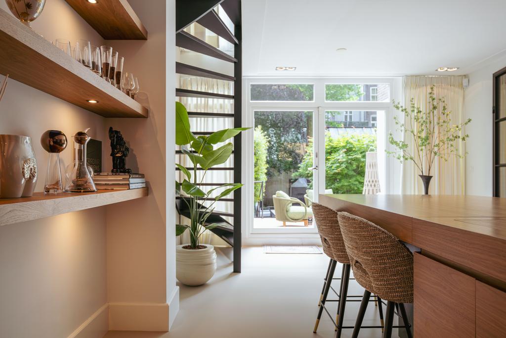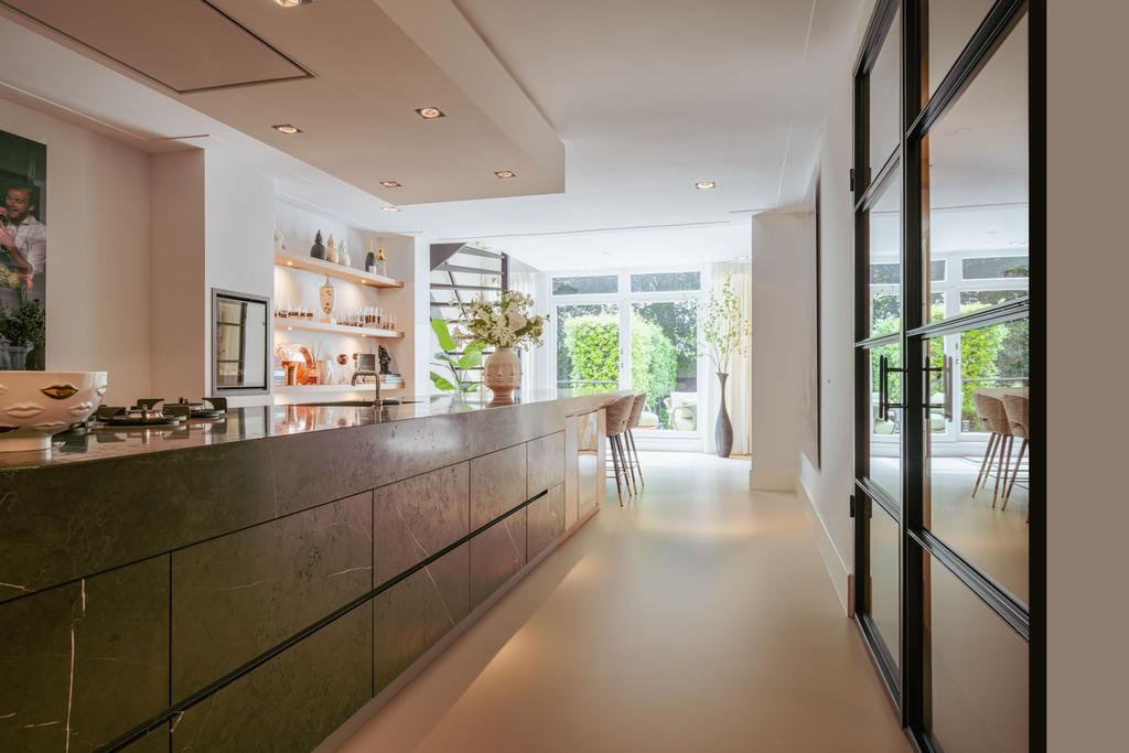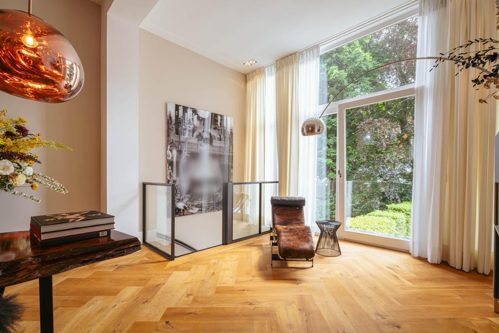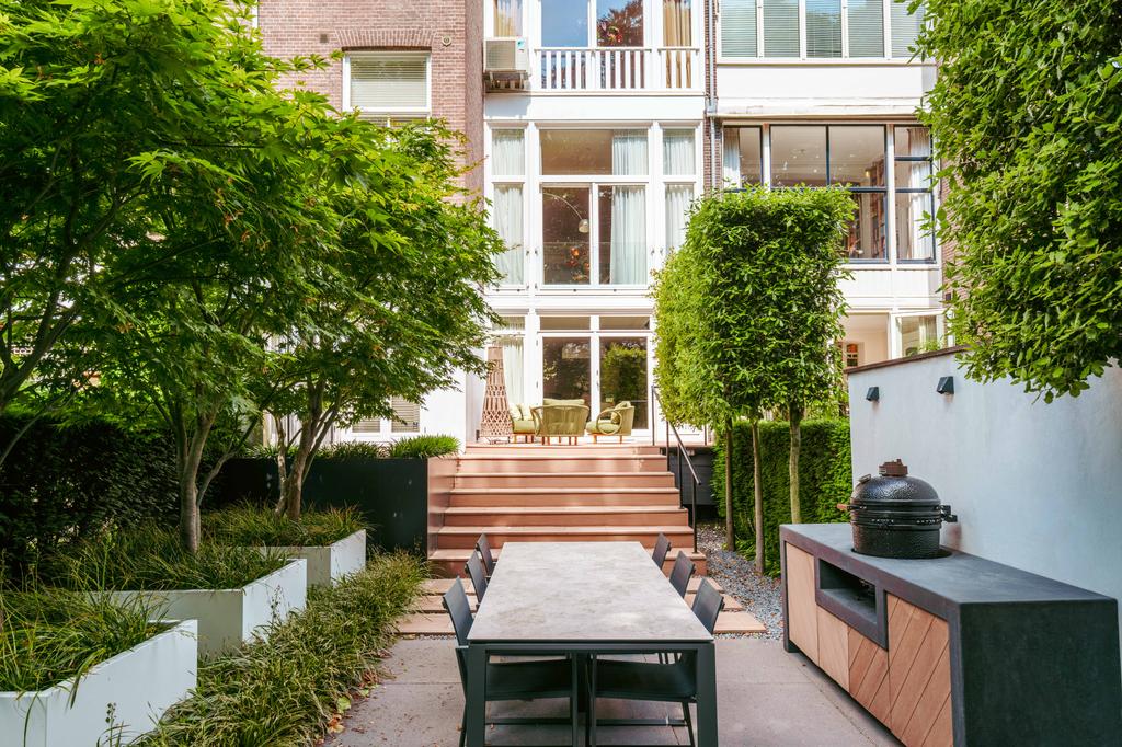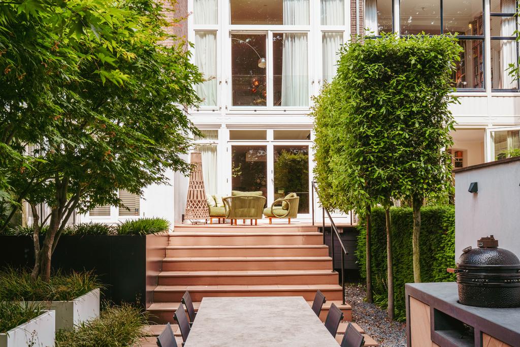 La planta baja acoge una cocina de diseño abierto, equipada con electrodomésticos Gaggenau y una encimera de piedra maciza. Las puertas francesas acceden a una amplia terraza y a un jardín sur de 157 m², diseñado por Erik van Gelder y con una cocina exterior—un refugio único con acceso privado desde Schapenburgerpad. En cada nivel, el diseño pensado lleva la funcionalidad a otro nivel: ascensor, calefacción parcial por suelo radiante y varias chimeneas de gas aseguran confort durante todo el año.