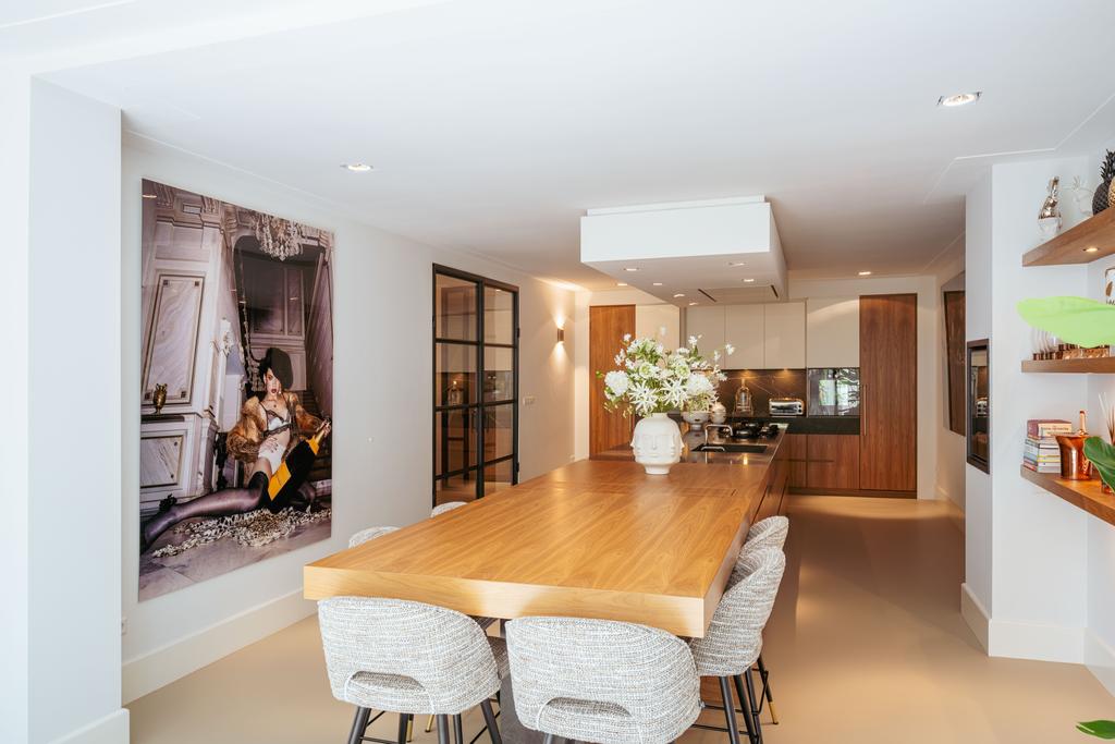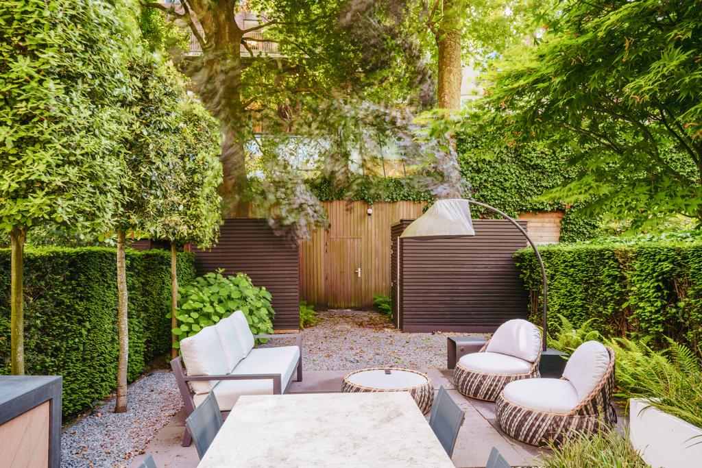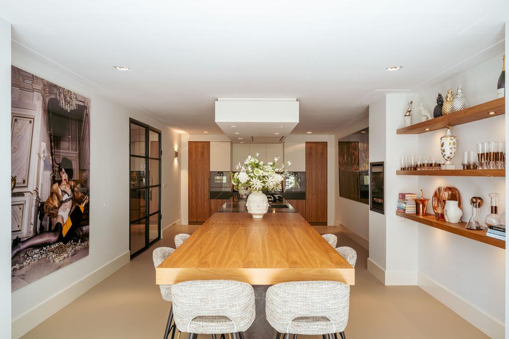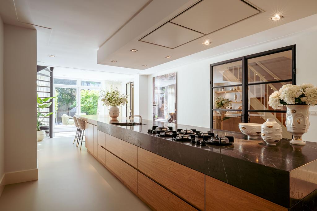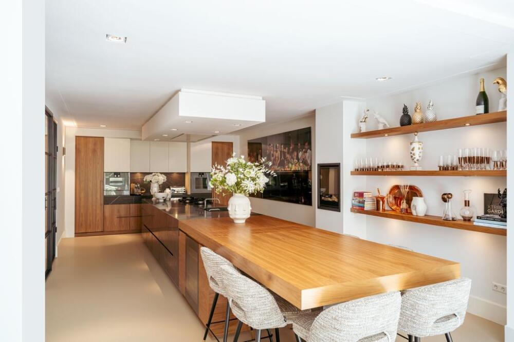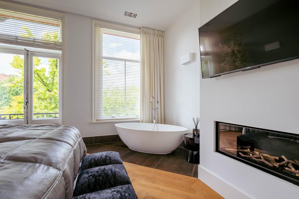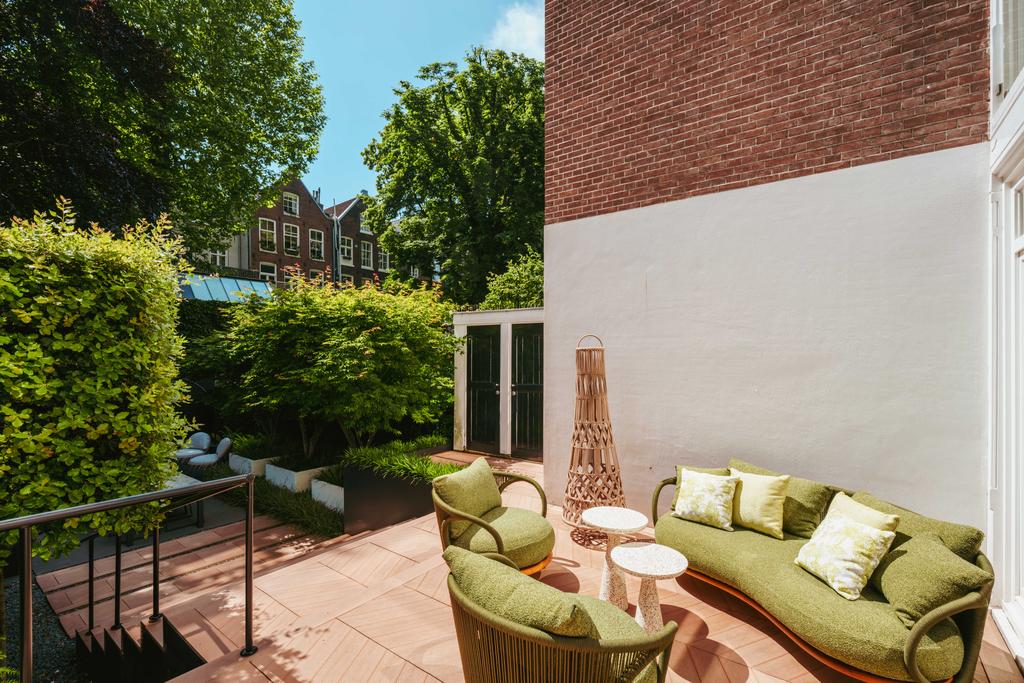 La planta baja acoge una cocina de diseño abierto, equipada con electrodomésticos Gaggenau y una encimera de piedra maciza. Las puertas francesas acceden a una amplia terraza y a un jardín sur de 157 m², diseñado por Erik van Gelder y con una cocina exterior—un refugio único con acceso privado desde Schapenburgerpad. En cada nivel, el diseño pensado lleva la funcionalidad a otro nivel: ascensor, calefacción parcial por suelo radiante y varias chimeneas de gas aseguran confort durante todo el año.