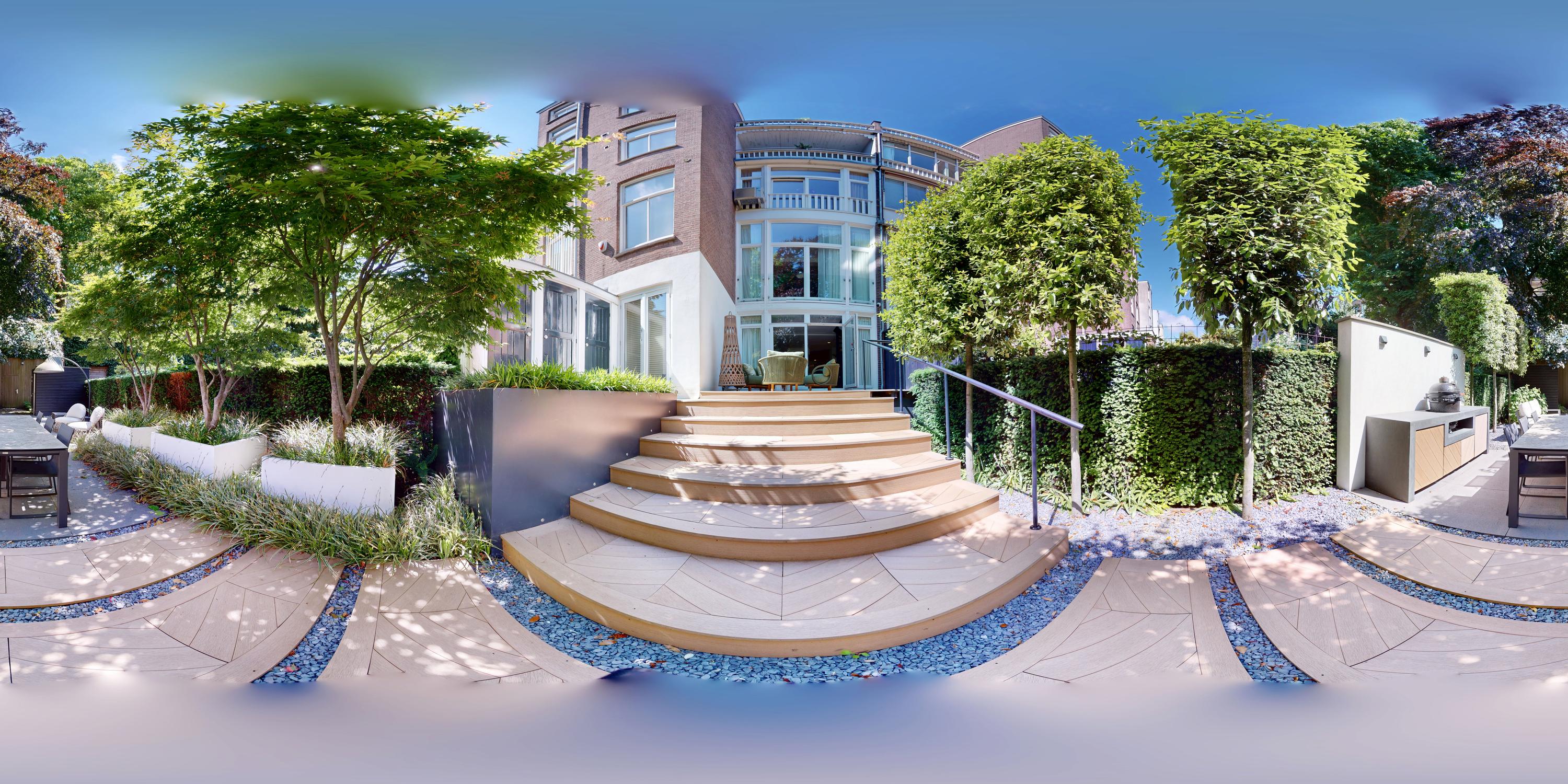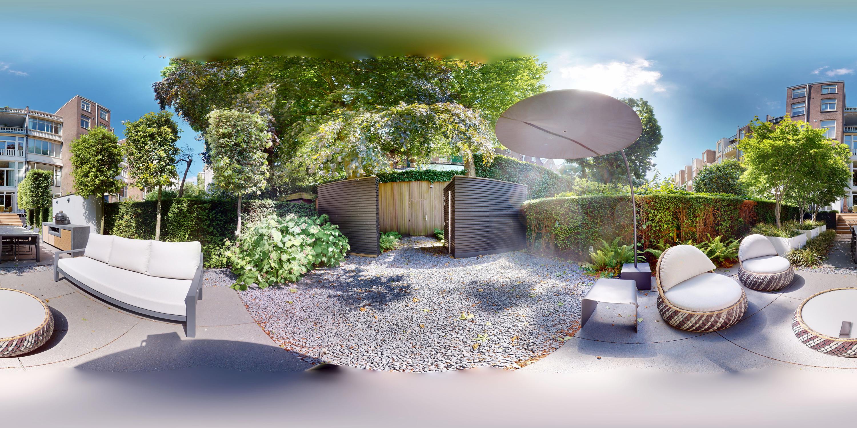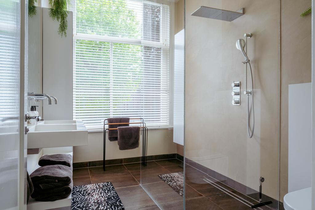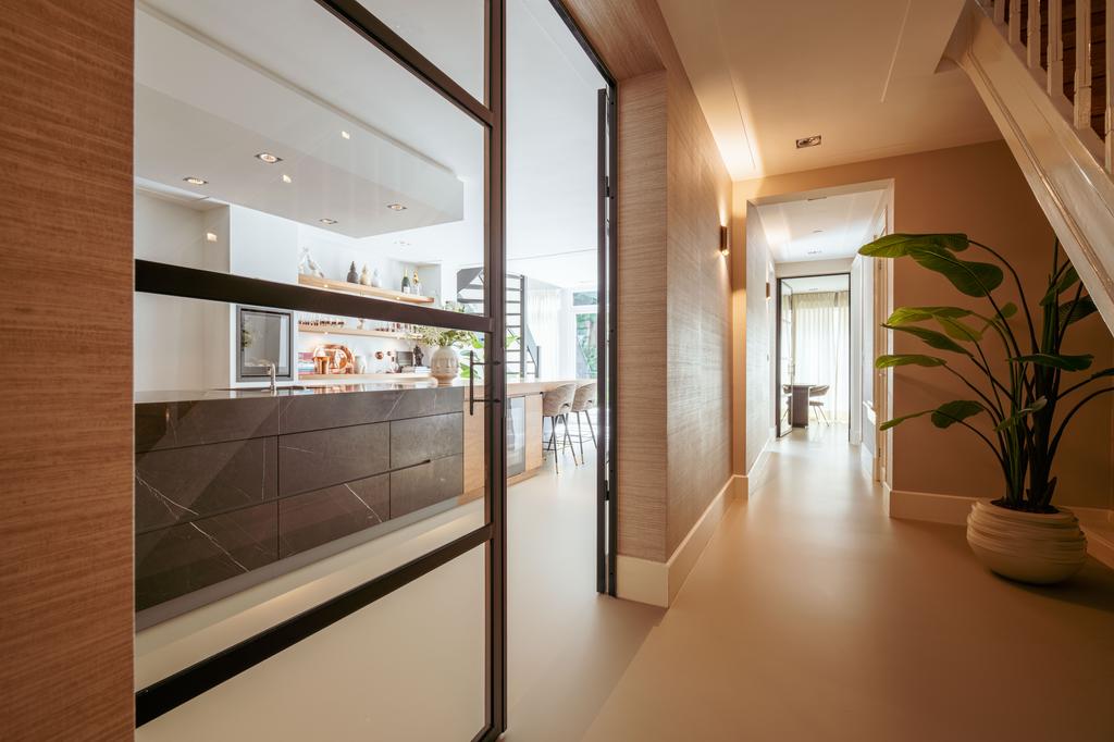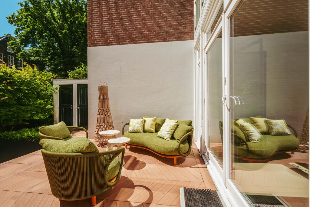 La planta baja acoge una cocina de diseño abierto, equipada con electrodomésticos Gaggenau y una encimera de piedra maciza. Las puertas francesas acceden a una amplia terraza y a un jardín sur de 157 m², diseñado por Erik van Gelder y con una cocina exterior—un refugio único con acceso privado desde Schapenburgerpad. En cada nivel, el diseño pensado lleva la funcionalidad a otro nivel: ascensor, calefacción parcial por suelo radiante y varias chimeneas de gas aseguran confort durante todo el año.