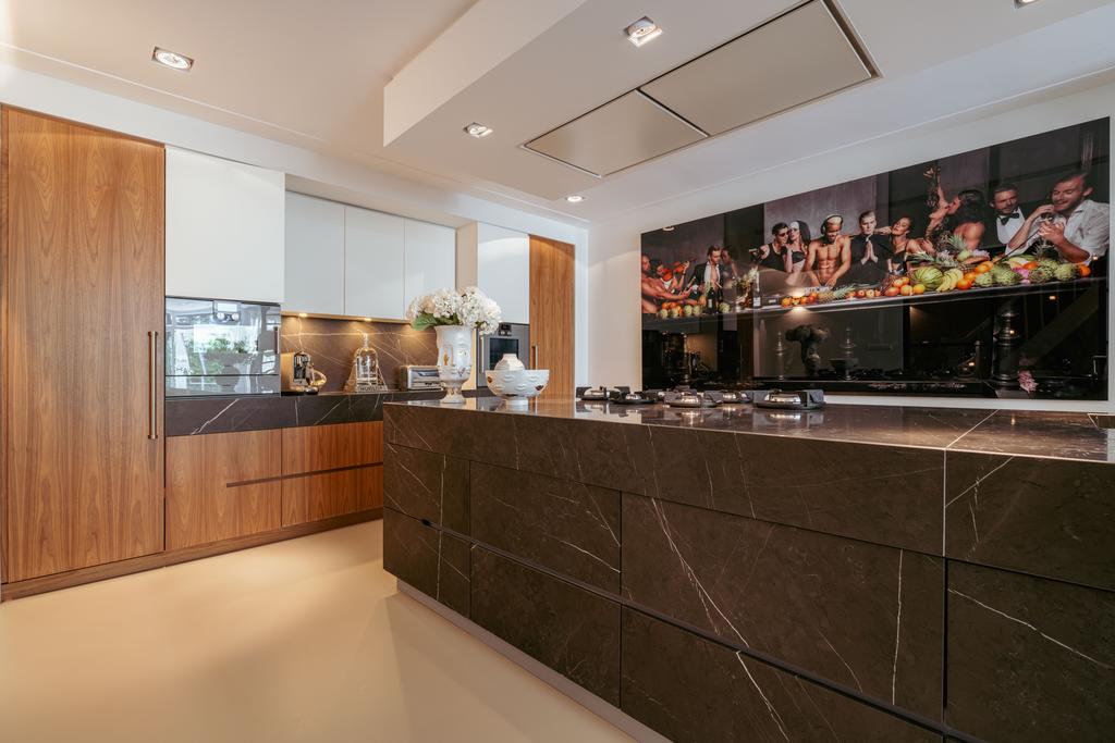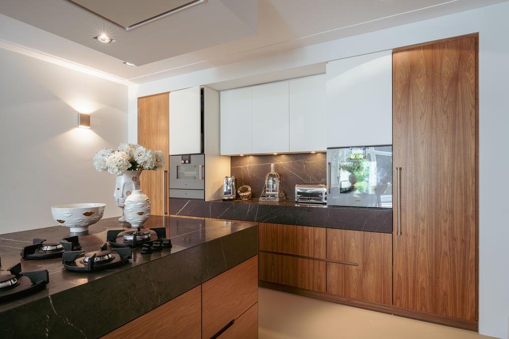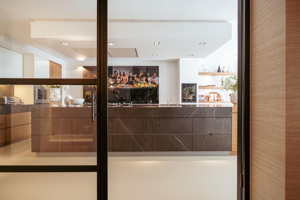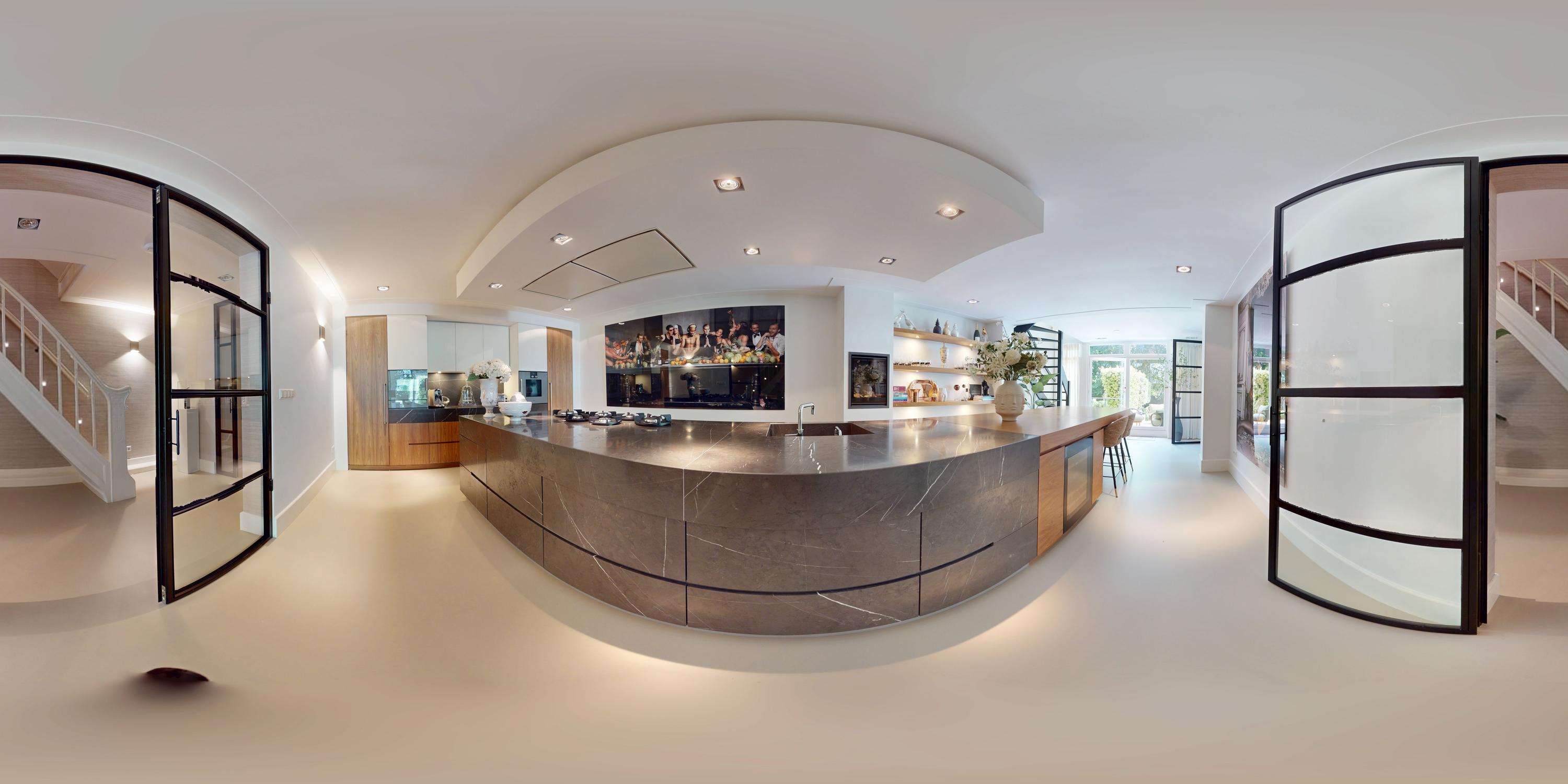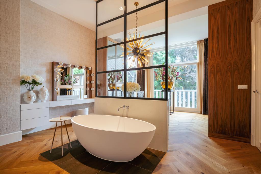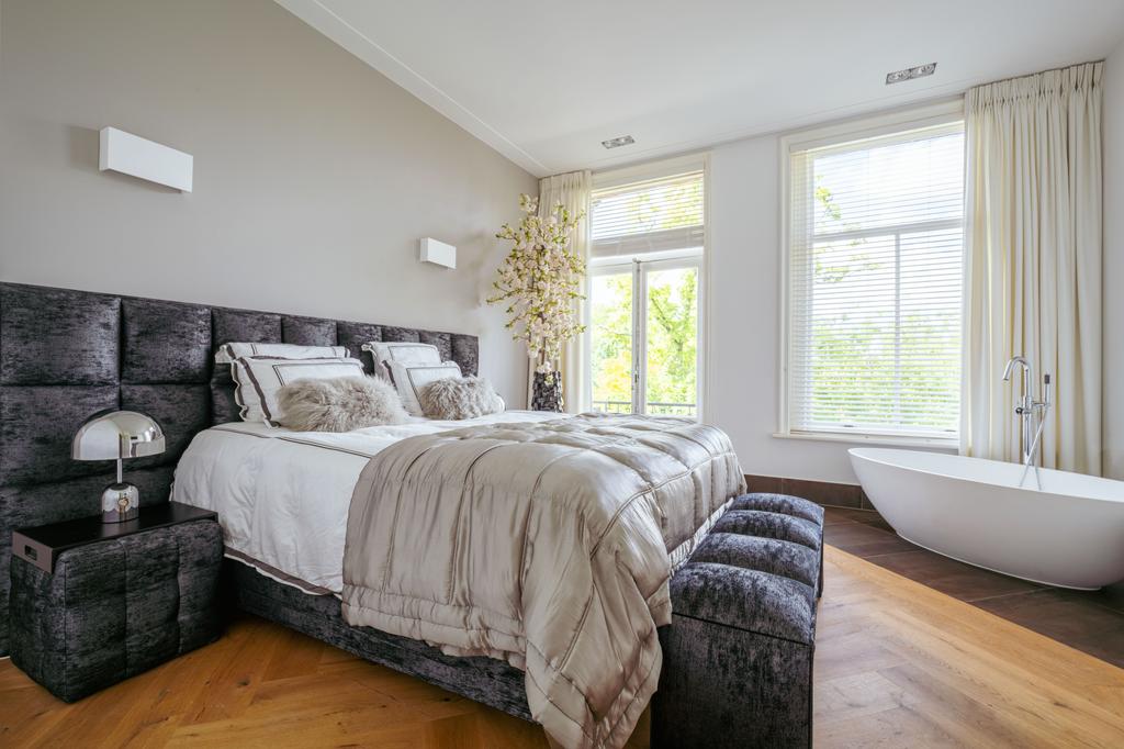 La planta baja acoge una cocina de diseño abierto, equipada con electrodomésticos Gaggenau y una encimera de piedra maciza. Las puertas francesas acceden a una amplia terraza y a un jardín sur de 157 m², diseñado por Erik van Gelder y con una cocina exterior—un refugio único con acceso privado desde Schapenburgerpad. En cada nivel, el diseño pensado lleva la funcionalidad a otro nivel: ascensor, calefacción parcial por suelo radiante y varias chimeneas de gas aseguran confort durante todo el año.