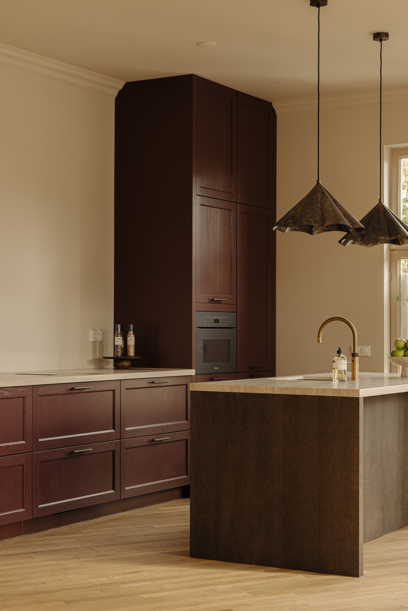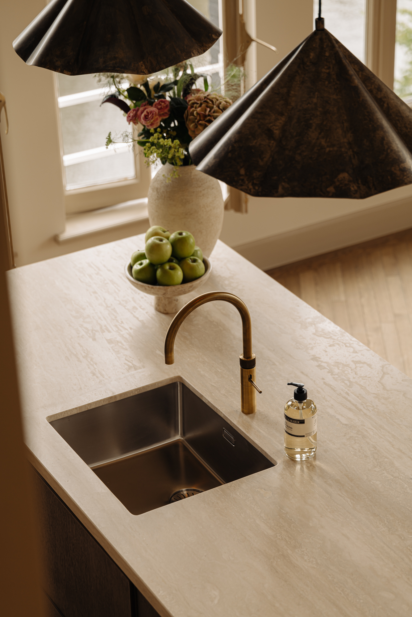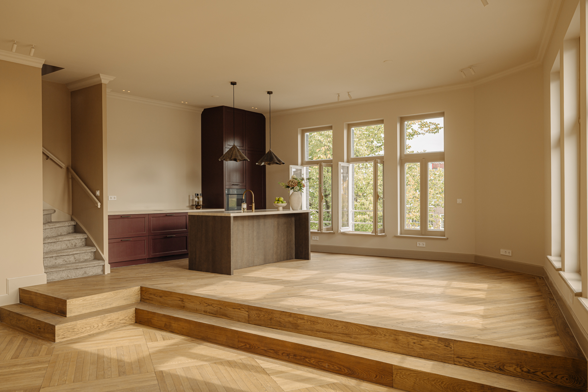 The apartment has been fully renovated to the highest standards, using rare, premium materials such as natural stone. The practical layout includes a spacious living room with ceilings reaching 3.44 metres, a modern open-plan kitchen with integrated appliances, and a private bedroom with en-suite bathroom on the lower level. Large windows flood the space with natural light, allowing the carefully designed interior to shine and enhancing the historic surroundings.
