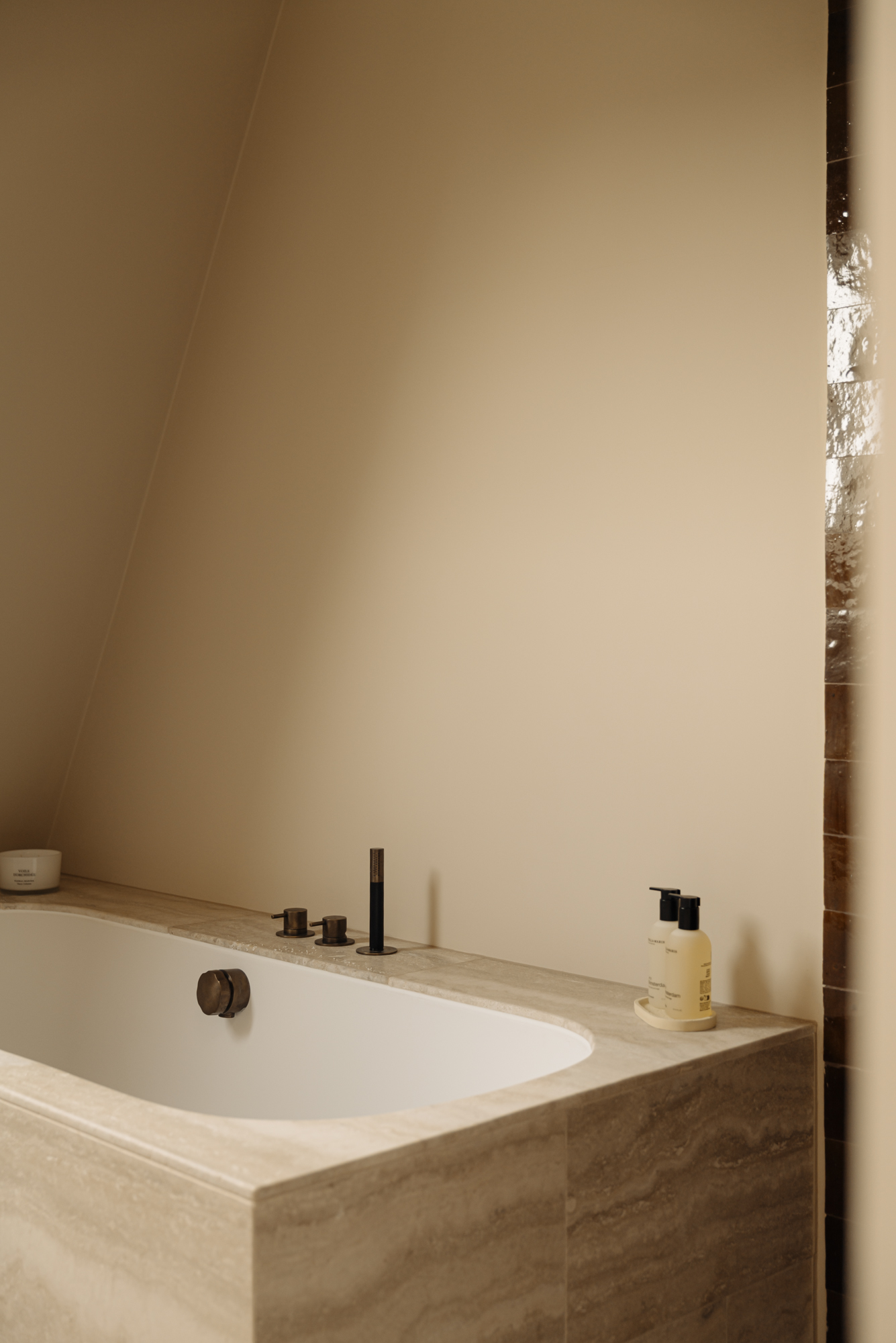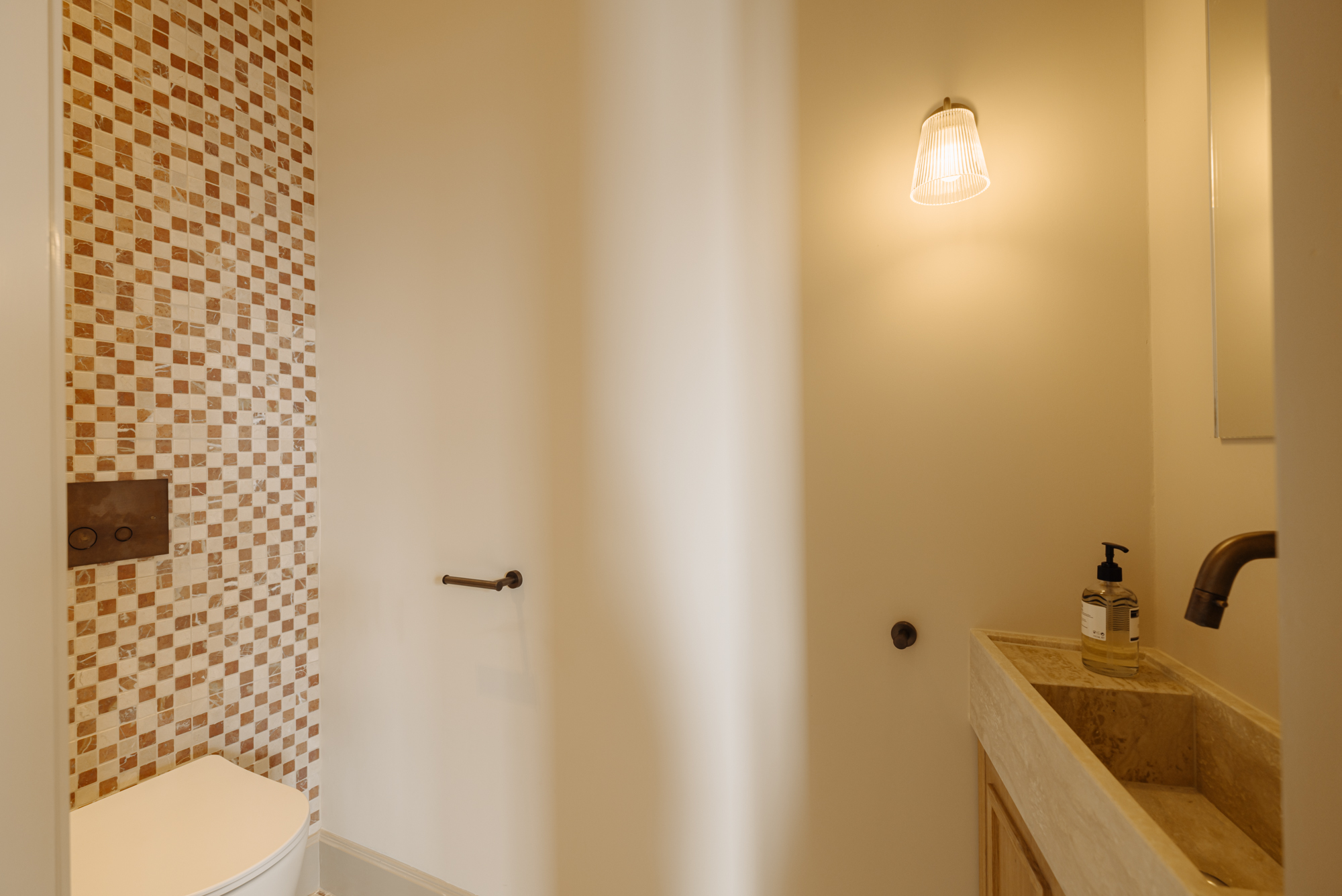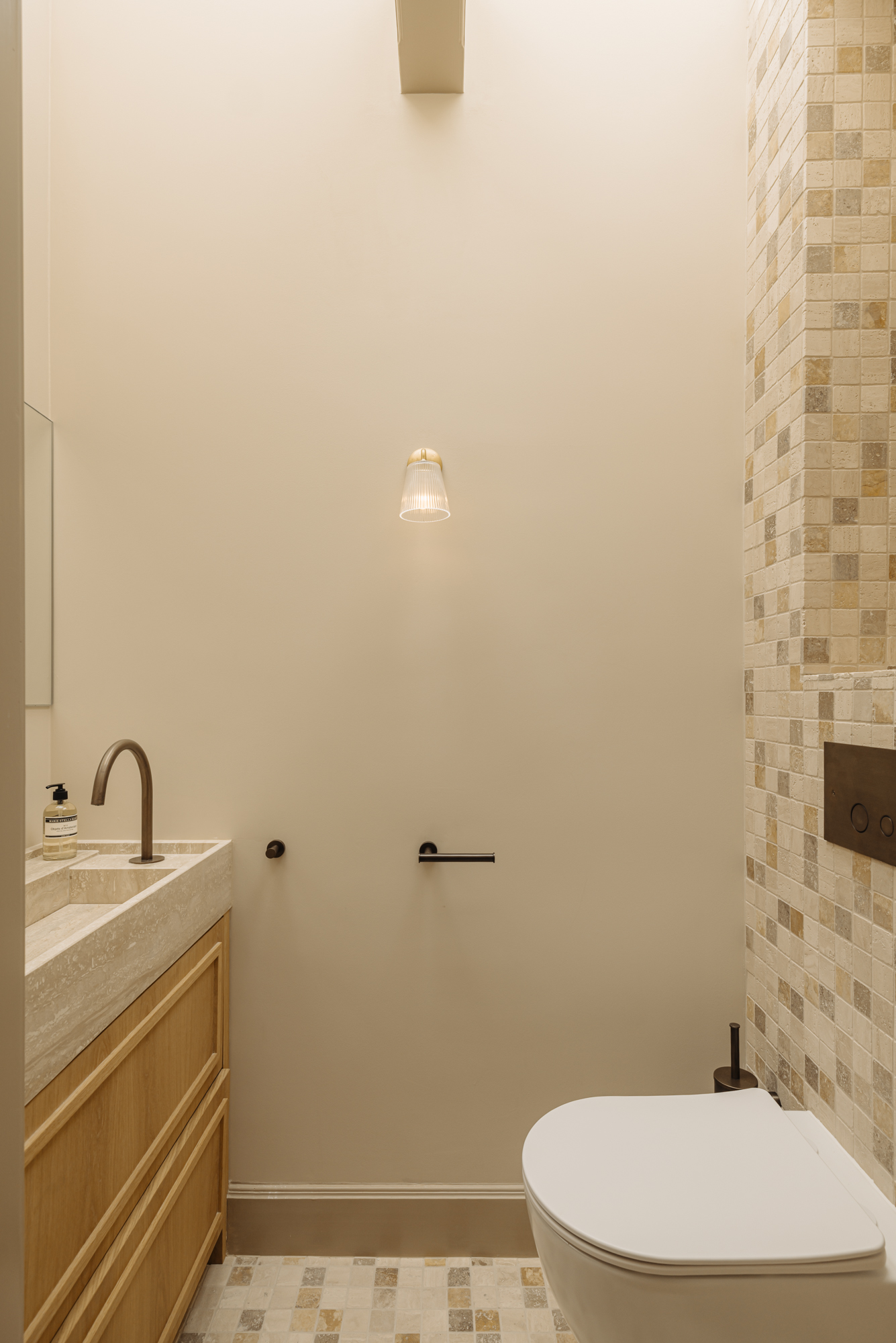 The apartment has been fully renovated to the highest standards, using rare, premium materials such as natural stone. The practical layout includes a spacious living room with ceilings reaching 3.44 metres, a modern open-plan kitchen with integrated appliances, and a private bedroom with en-suite bathroom on the lower level. Large windows flood the space with natural light, allowing the carefully designed interior to shine and enhancing the historic surroundings.