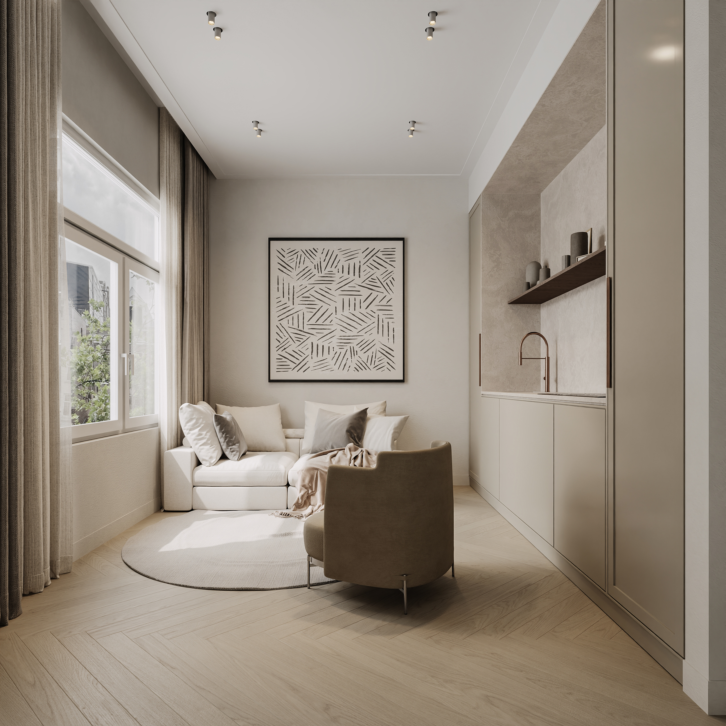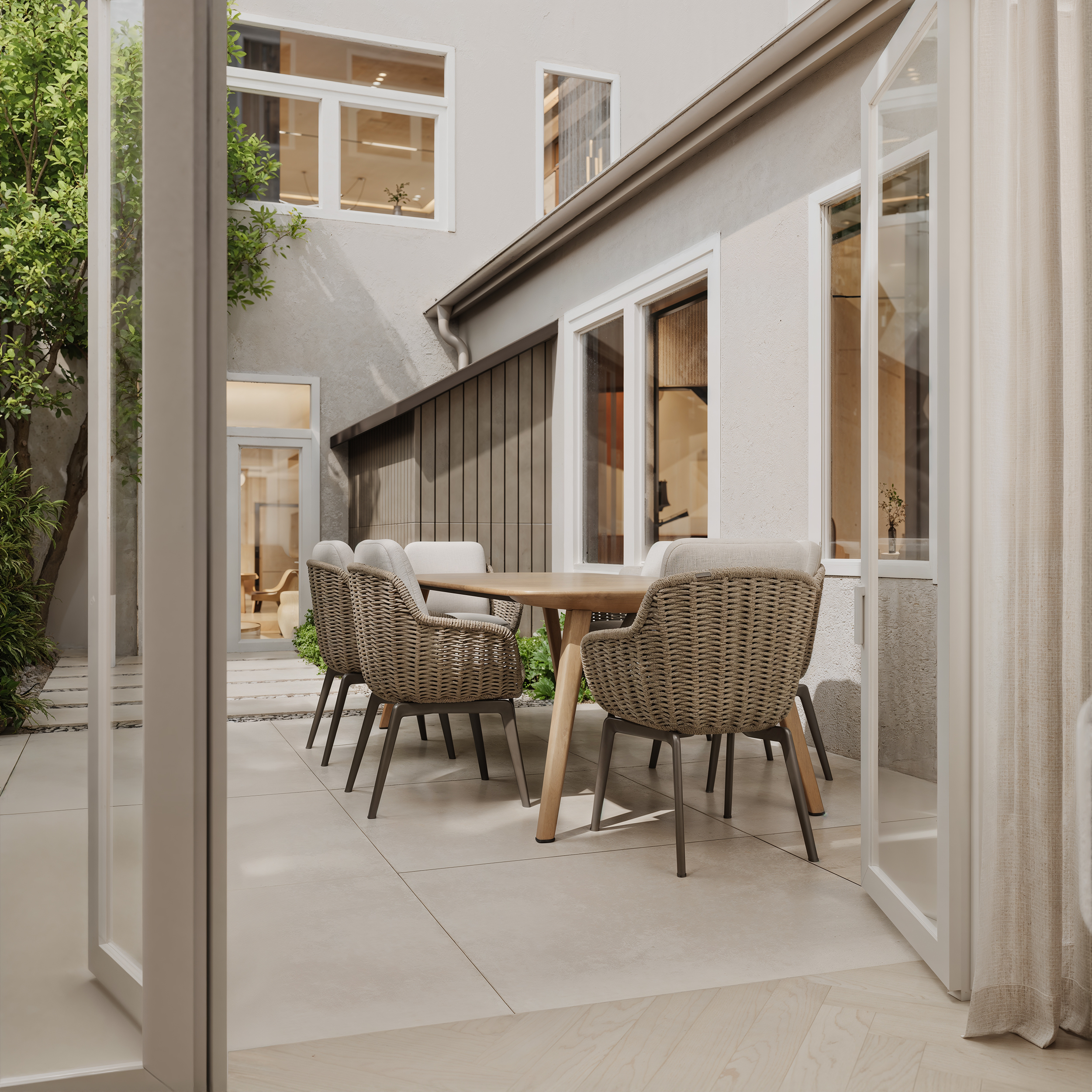 Al acceder por la planta principal, una amplia zona de estar se integra con el comedor, presidido por una moderna cocina abierta con una isla central destacada y electrodomésticos integrados de alta calidad. Unas puertas francesas se abren a un patio interior resguardado, que aporta serenidad frente al dinamismo de Ámsterdam. El salón trasero, que también permite acceso directo desde el jardín, dispone de una segunda cocina, ideal como suite de invitados, oficina o estudio.