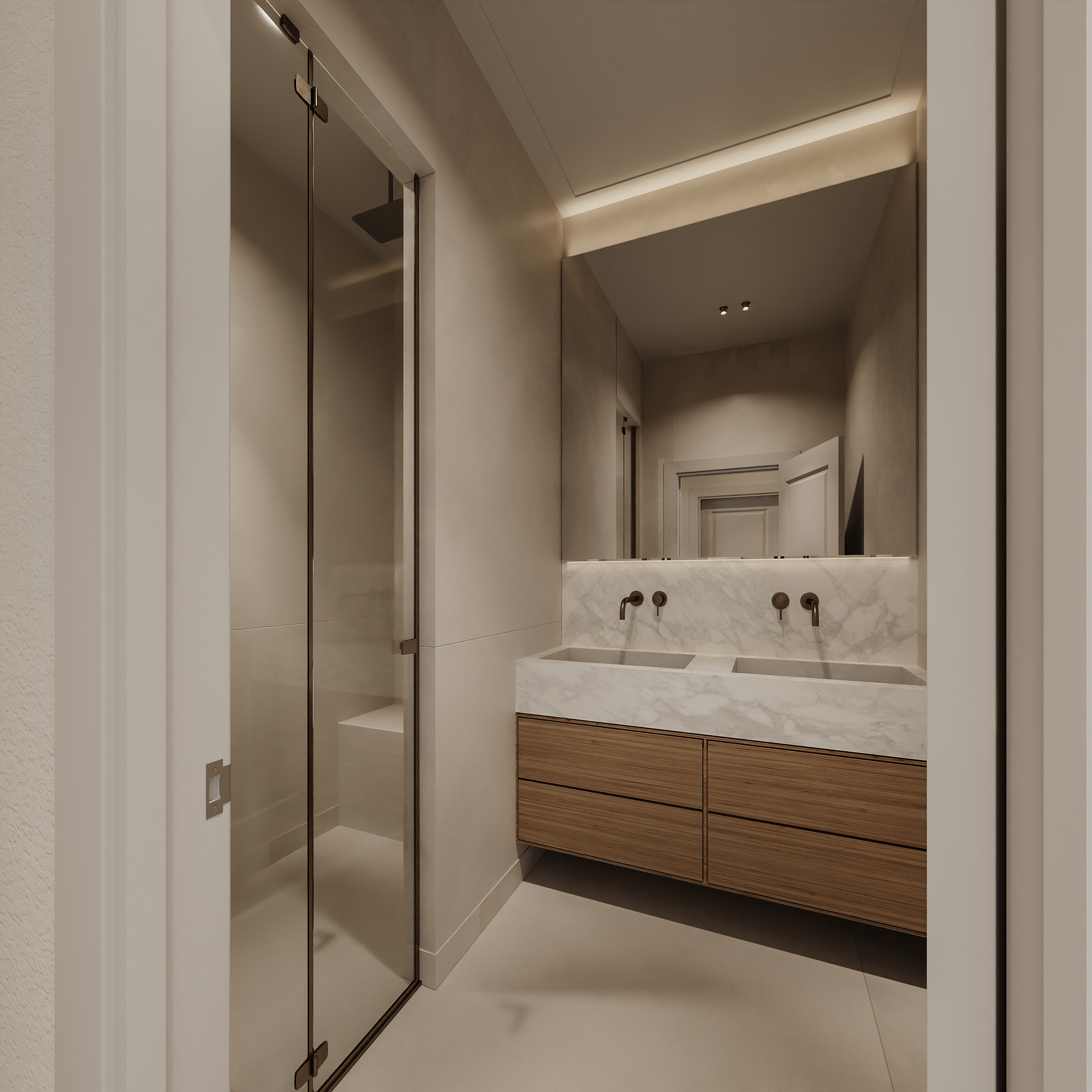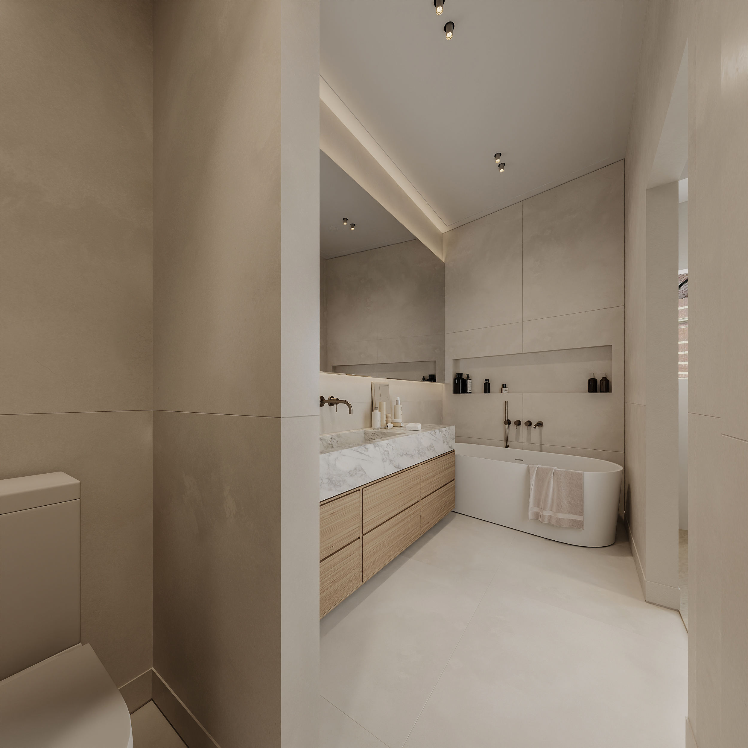 La planta inferior alberga tres dormitorios y dos baños, ambos con duchas de obra y lavabos dobles; uno de los baños dispone también de bañera. La luz natural abunda y se ha cuidado cada detalle de almacenamiento. Las plantas superiores aportan mayor independencia con un baño y dormitorio adicionales en la vivienda trasera.