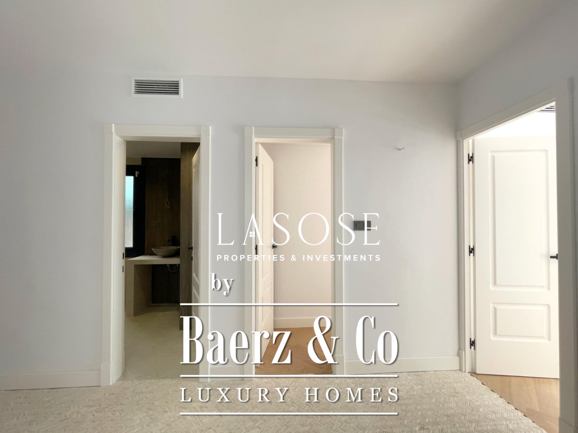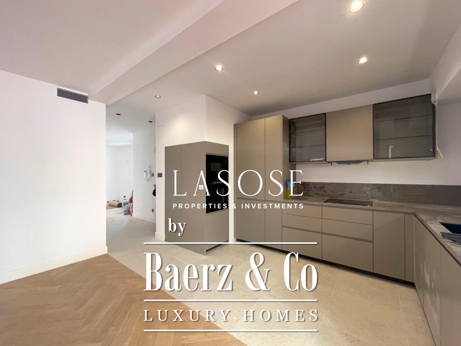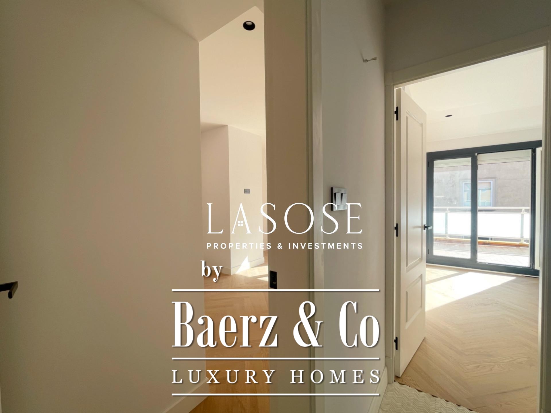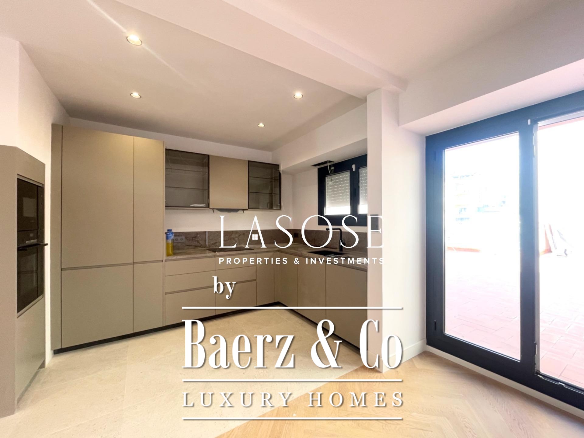 El recibidor da acceso a dos dormitorios dobles, incluyendo una amplia suite principal con un baño en suite de generosas dimensiones. Ambos dormitorios ofrecen acceso directo a la terraza bañada por el sol, lo que aporta luz natural y una agradable sensación de privacidad. La zona de día abarca una moderna cocina office y un comedor, ambos orientados hacia la gran terraza que constituye el corazón de la vivienda.