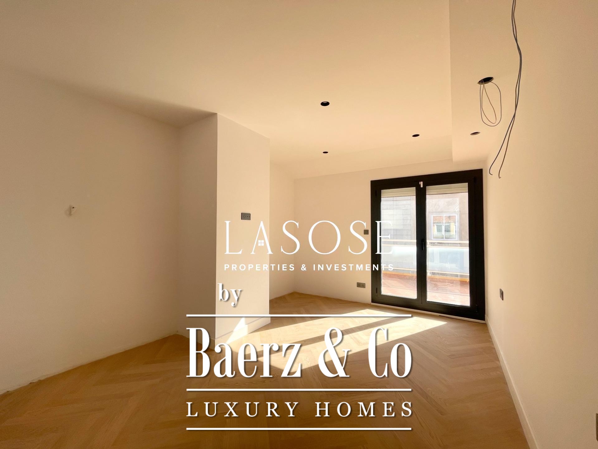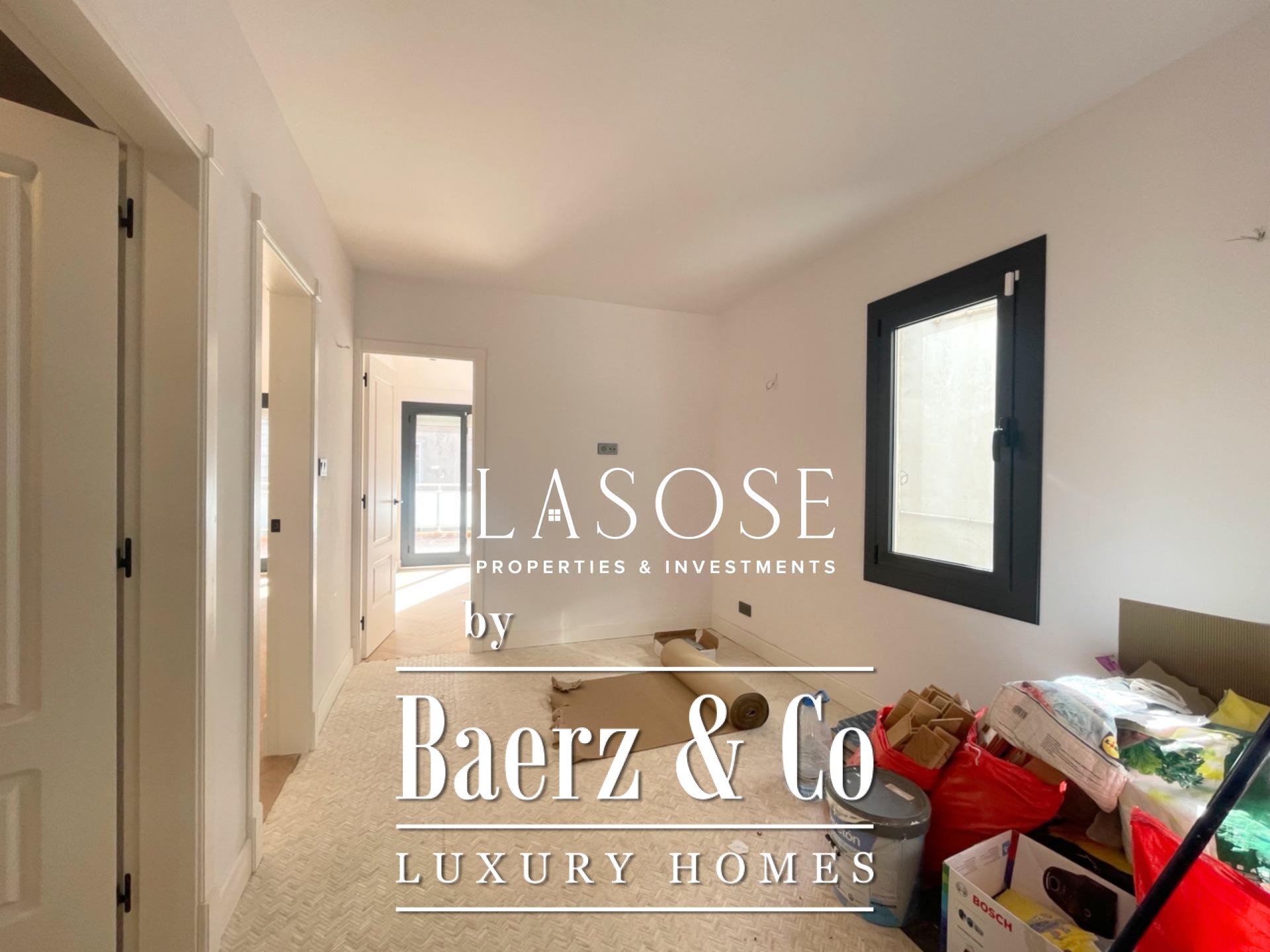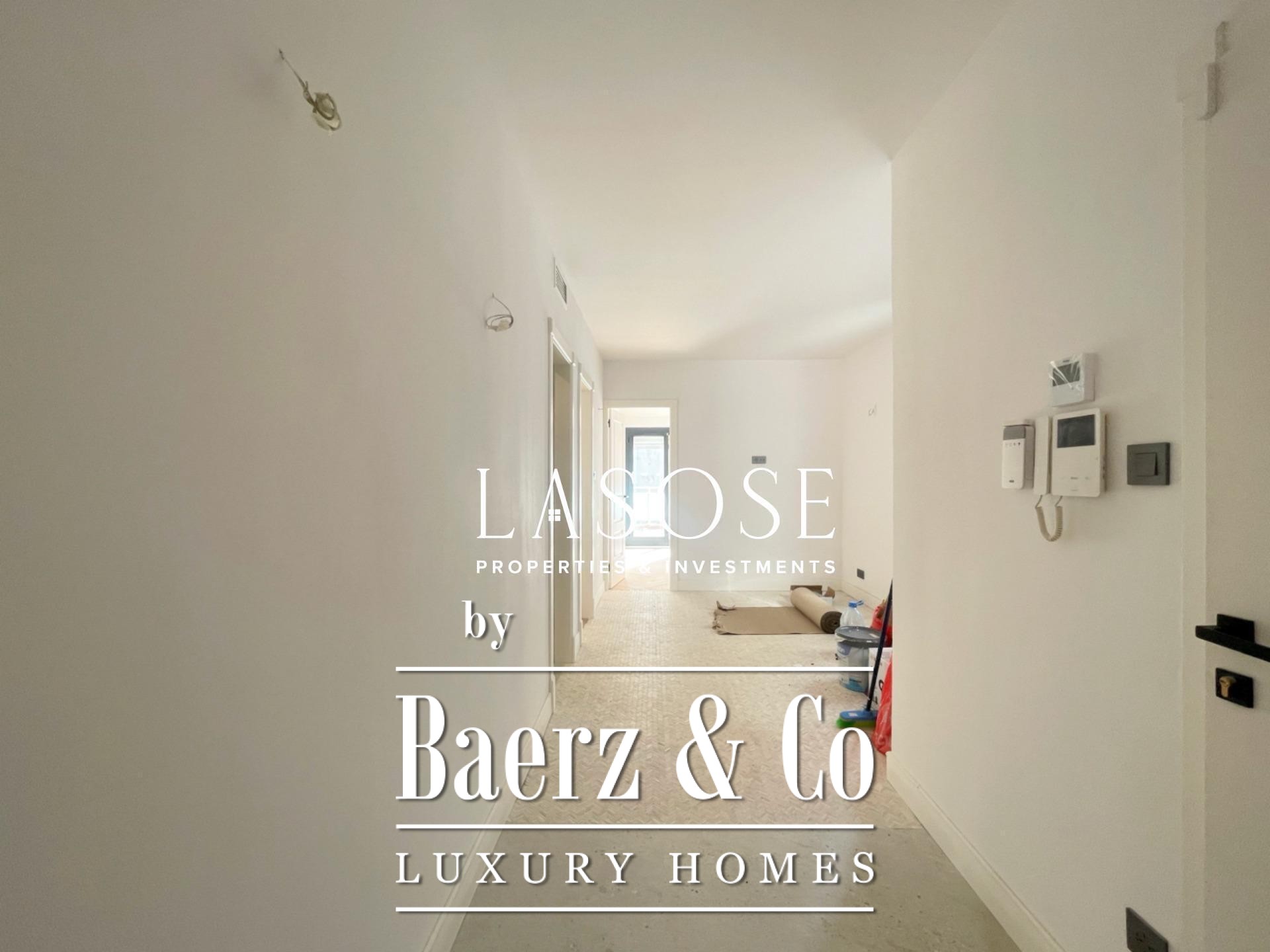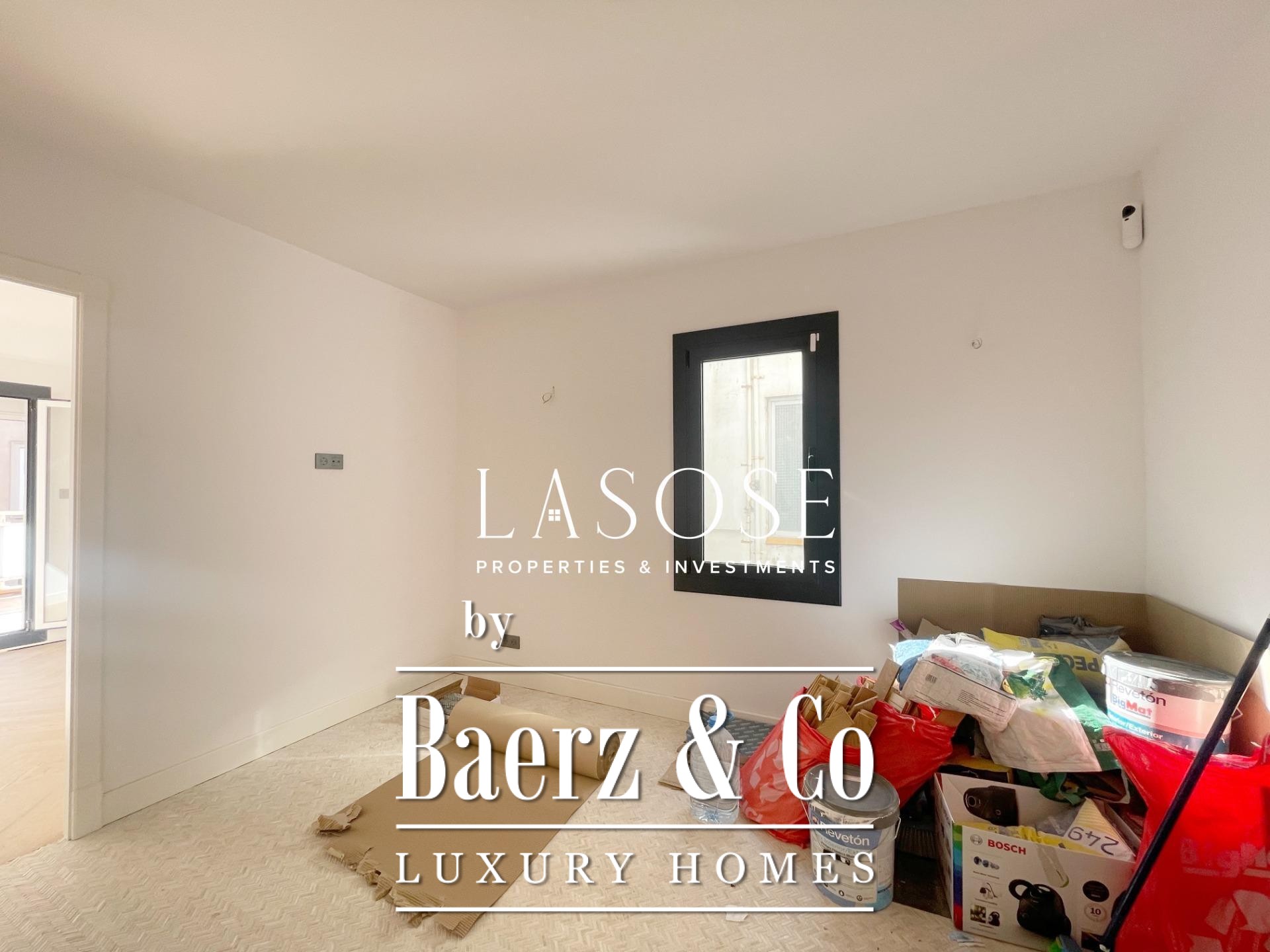 El recibidor da acceso a dos dormitorios dobles, incluyendo una amplia suite principal con un baño en suite de generosas dimensiones. Ambos dormitorios ofrecen acceso directo a la terraza bañada por el sol, lo que aporta luz natural y una agradable sensación de privacidad. La zona de día abarca una moderna cocina office y un comedor, ambos orientados hacia la gran terraza que constituye el corazón de la vivienda.
