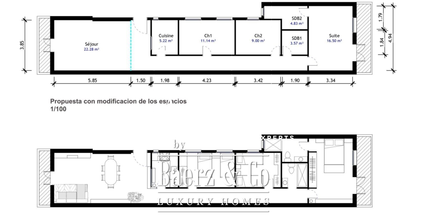 El salón-comedor se distingue por sus techos altos apoyados en vigas reforzadas, suelos de porcelánico e iluminación cuidadosamente planificada. Se abre a un balcón que da a una tranquila calle peatonal, generando un ambiente sereno y claramente urbano. La cocina independiente, completamente equipada y amueblada, combina utilidad y estilo. La zona de noche, tranquila, alberga tres dormitorios dobles. La suite principal dispone de baño en suite, complementada por un segundo baño completo con ducha a ras de suelo, ideal para invitados o la familia.