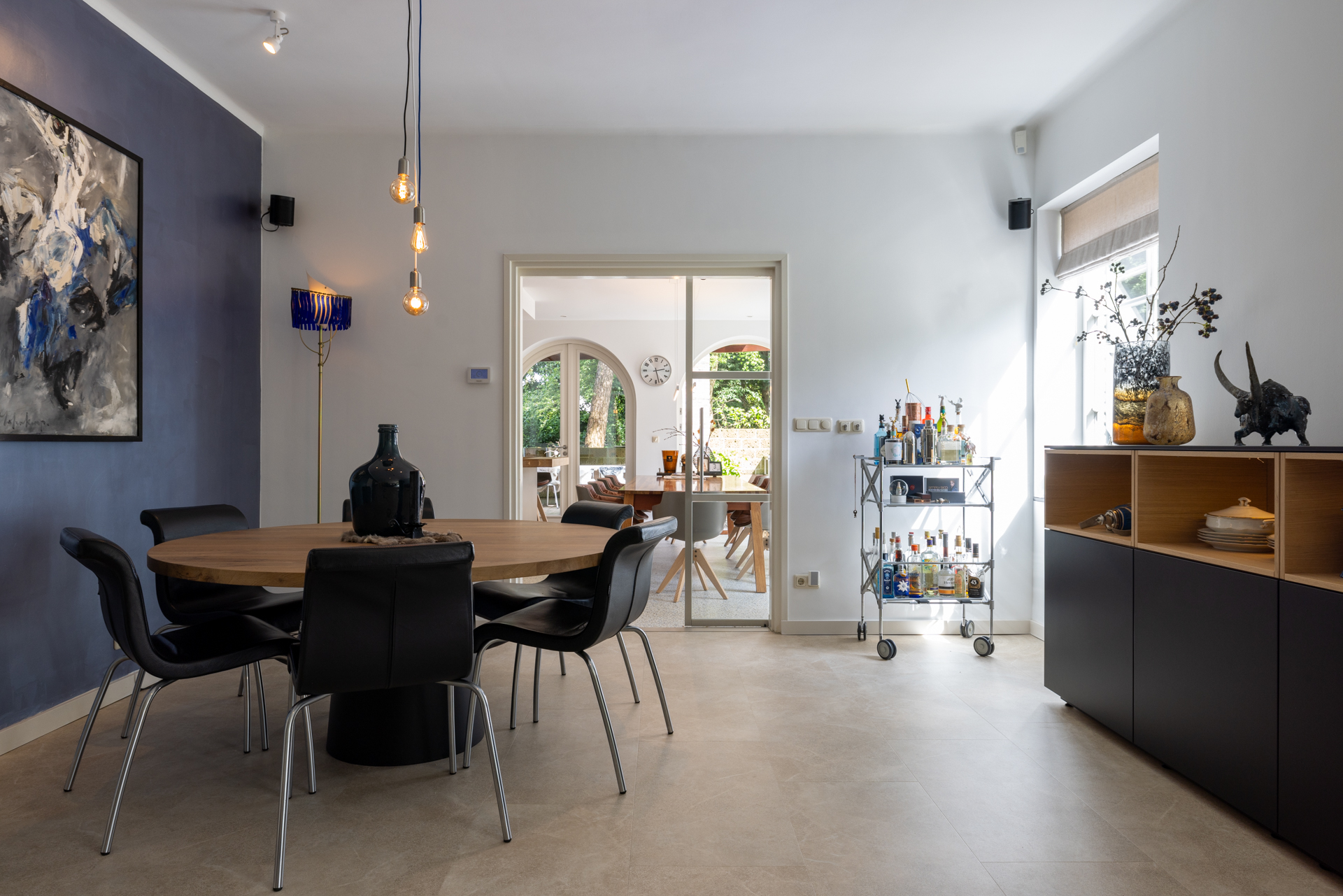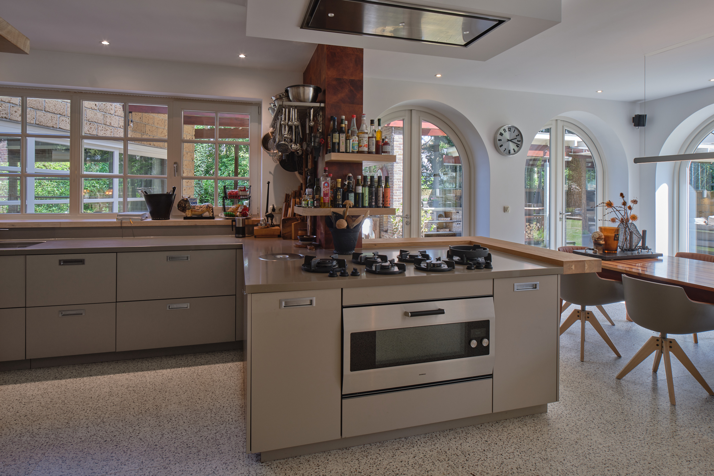 El amplio salón se abre al jardín paisajístico a través de grandes puertas de patio, dejando que la luz natural y las vistas definan el ambiente interior. La cocina, diseñada por Antonissen y equipada con electrodomésticos Gaggenau, es el corazón de los rituales diarios y celebraciones, y se conecta sin interrupciones con una cocina exterior y zona de estar bajo una veranda cubierta con chimenea de gas. El área de bienestar independiente incluye piscina interior climatizada, sauna, ducha de lluvia y amplios espacios para relajarse.