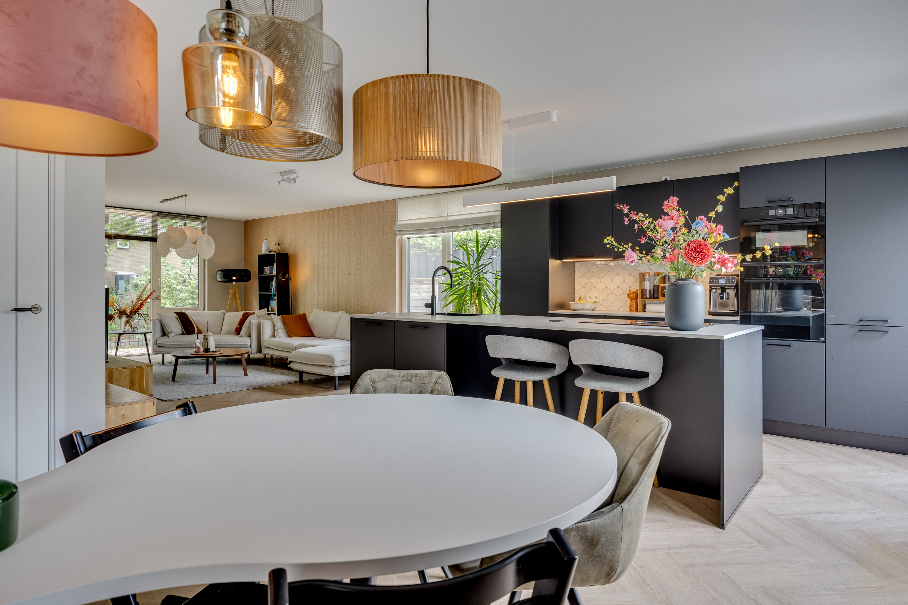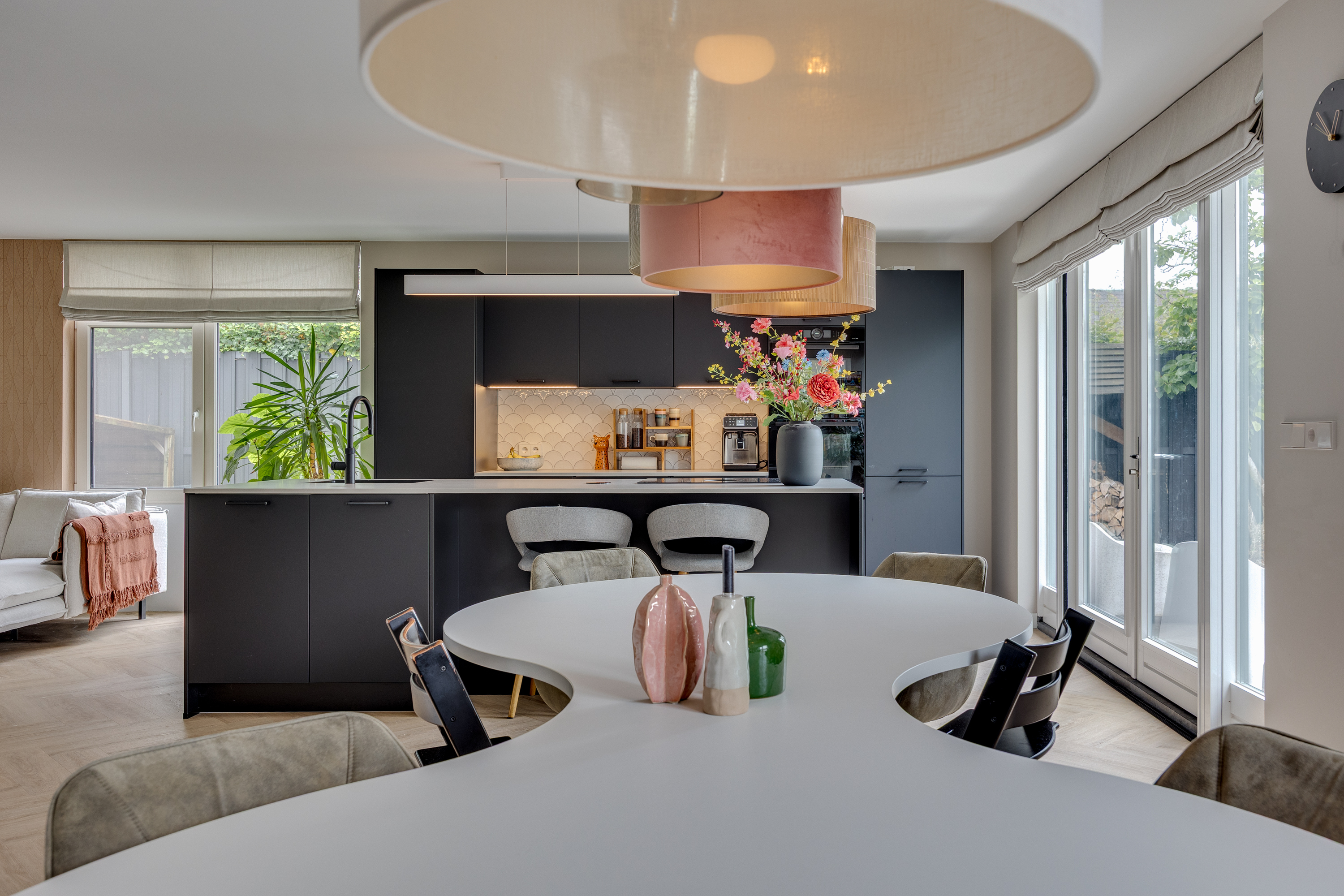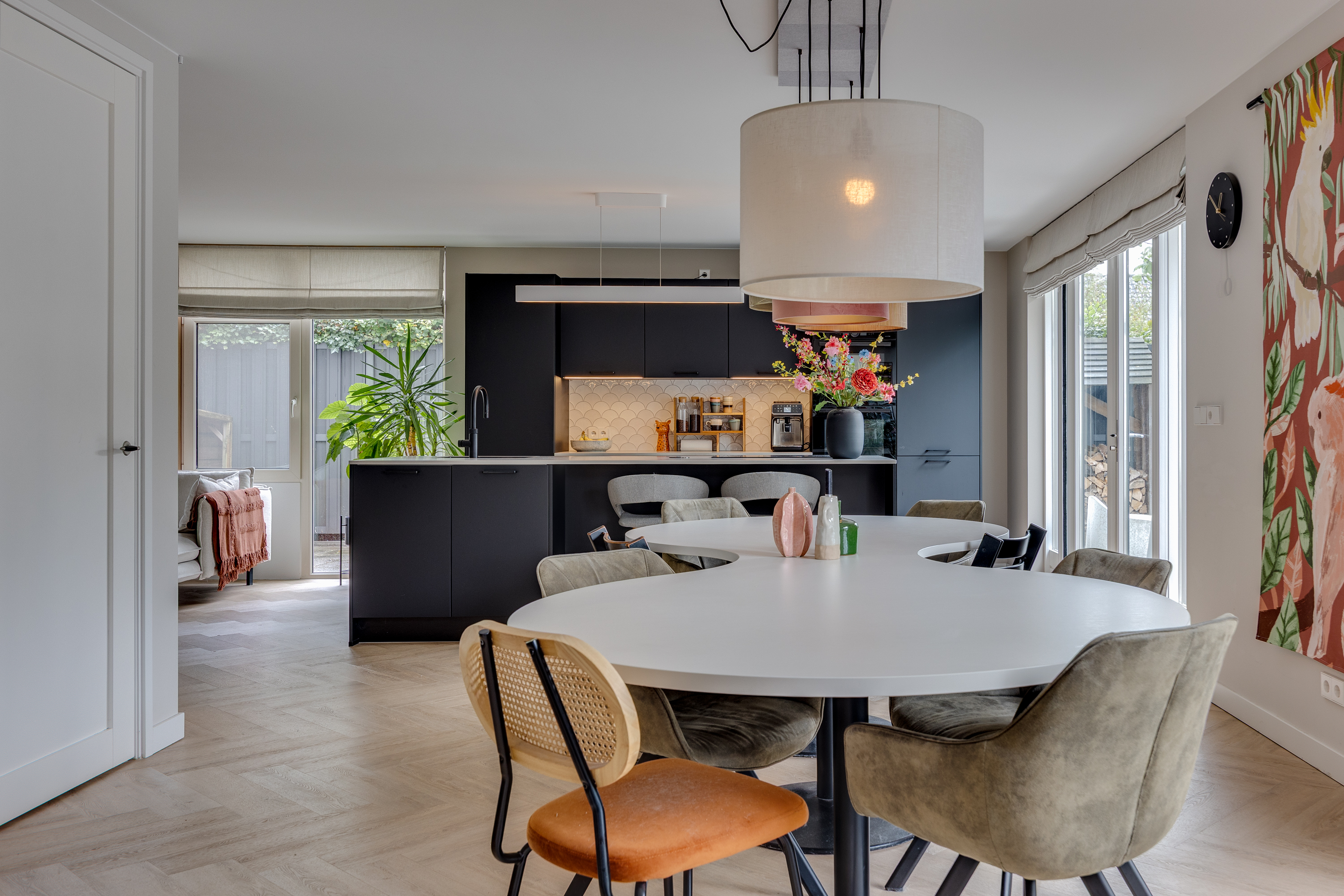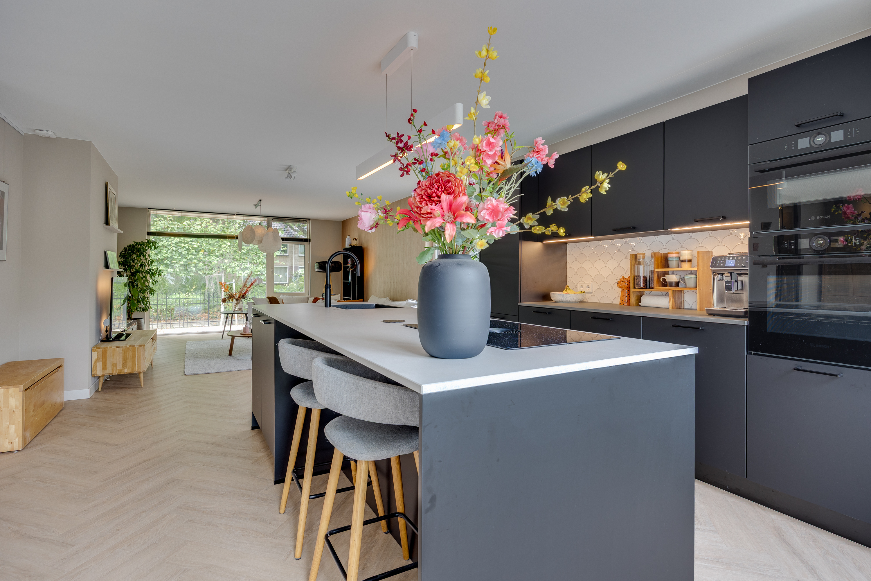 The spacious dining room flows seamlessly into the open-plan designer kitchen. This luxurious black kitchen by Enka is equipped with top-of-the-range appliances and combines sleek design with functionality. The generous cooking/sink island features an electric Bora hob with integrated extractor, a Quooker, dishwasher, and plenty of cupboard space. The cupboard wall incorporates a large Bosch refrigerator, separate freezer, combi-oven/microwave, and a self-cleaning oven.