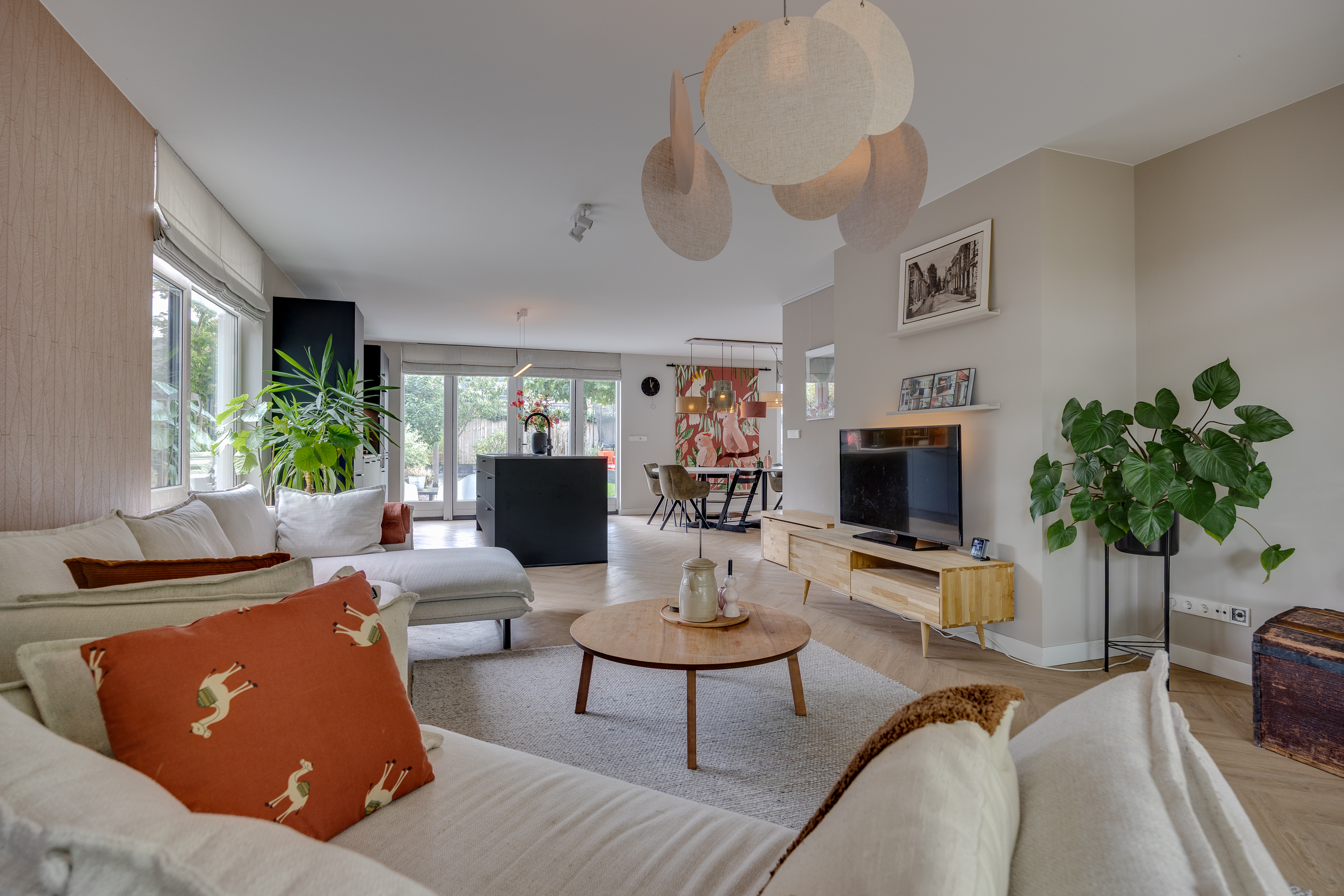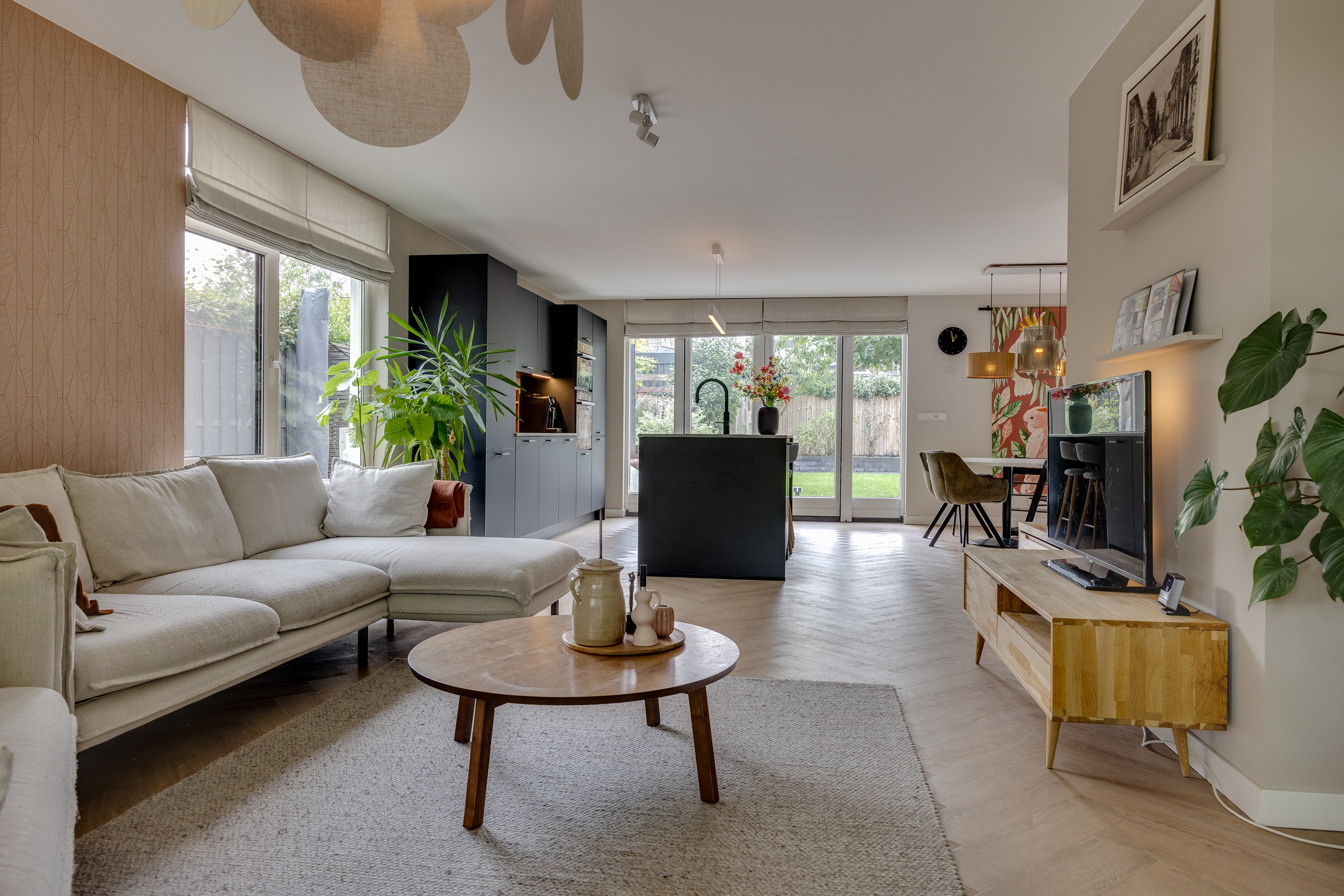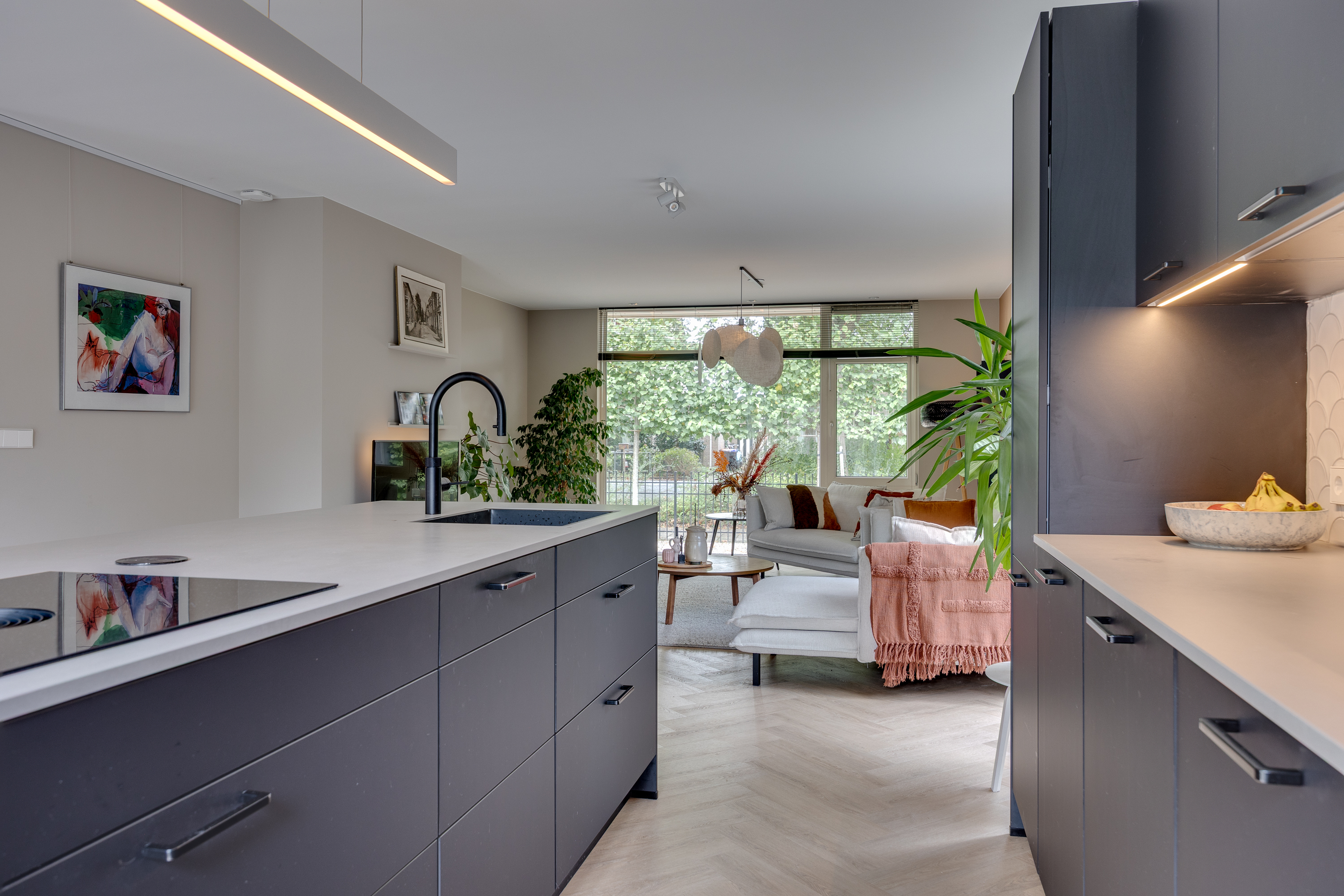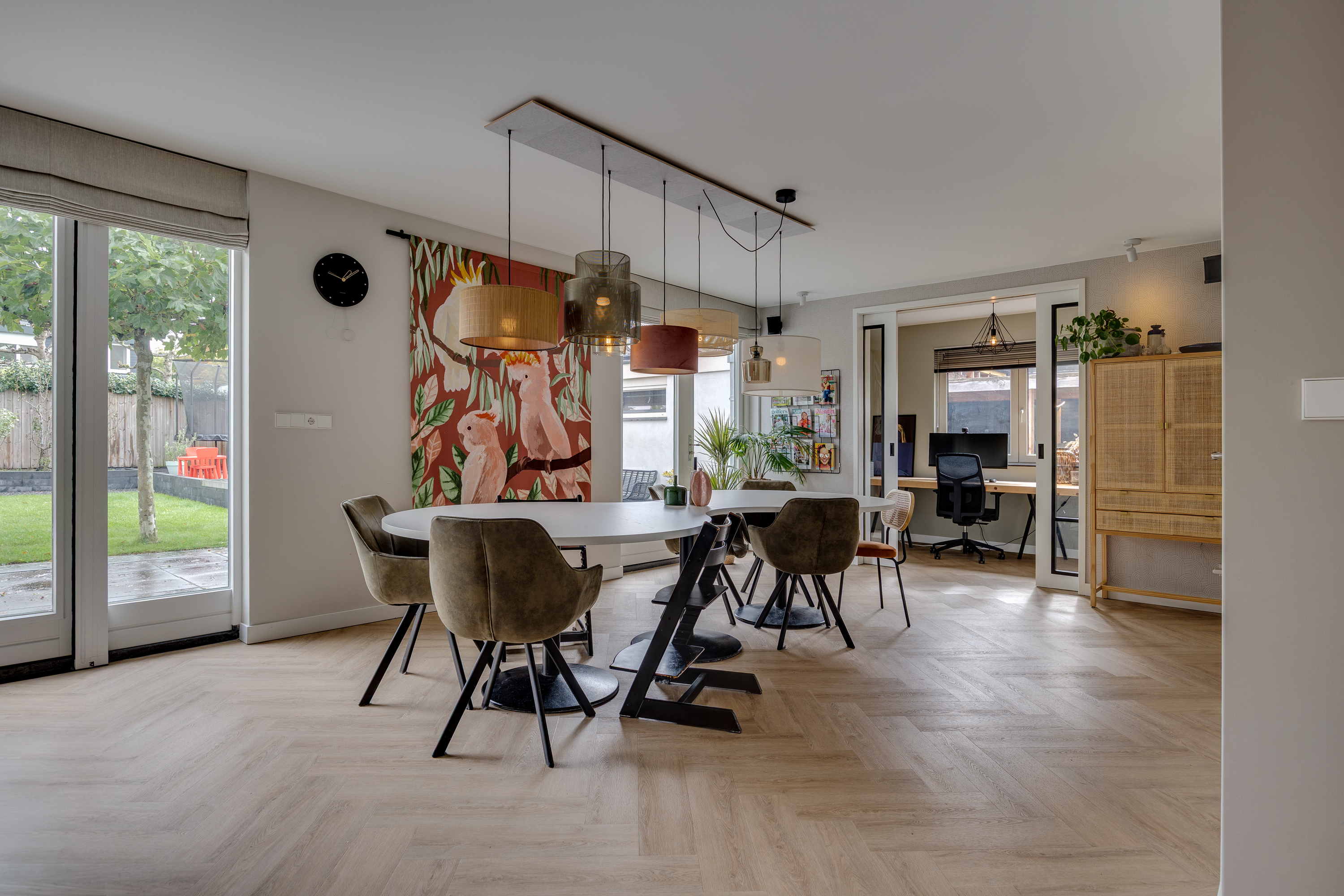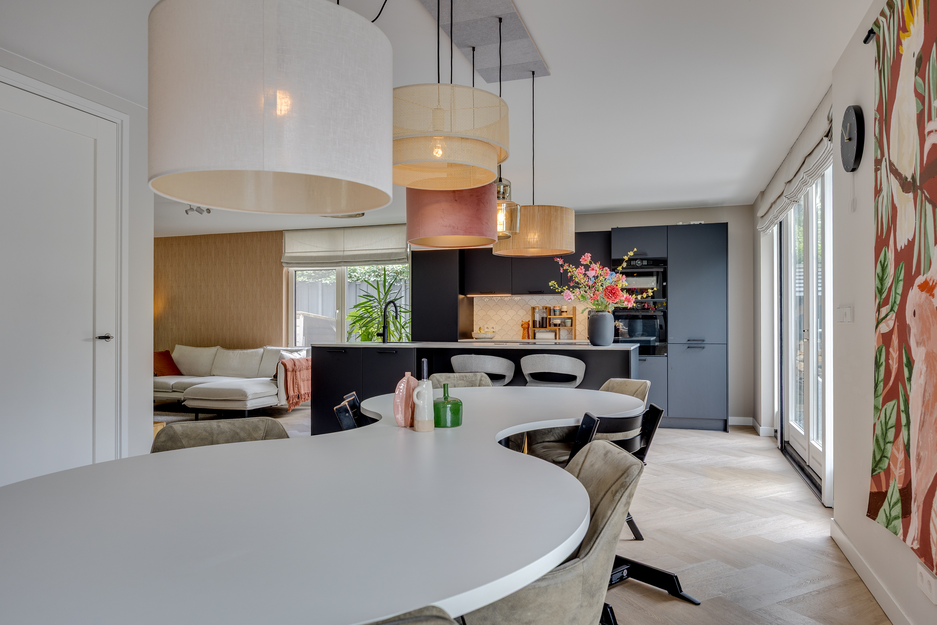 The spacious dining room flows seamlessly into the open-plan designer kitchen. This luxurious black kitchen by Enka is equipped with top-of-the-range appliances and combines sleek design with functionality. The generous cooking/sink island features an electric Bora hob with integrated extractor, a Quooker, dishwasher, and plenty of cupboard space. The cupboard wall incorporates a large Bosch refrigerator, separate freezer, combi-oven/microwave, and a self-cleaning oven.