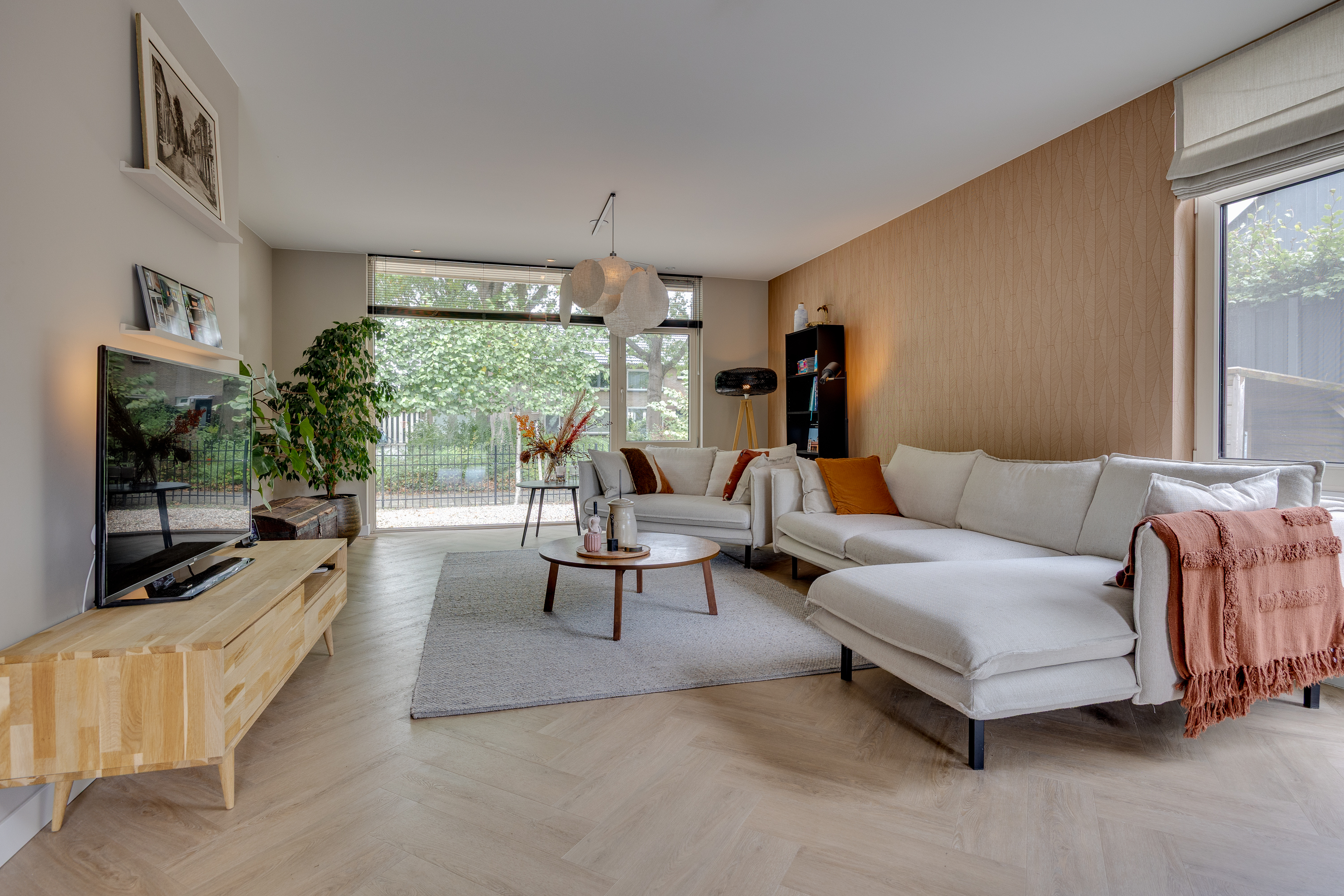 The adjoining living room has a light and spacious feel thanks to the large window at the front. The entire ground floor and first floor feature stylish, light PVC herringbone flooring from Cavallo Floors.