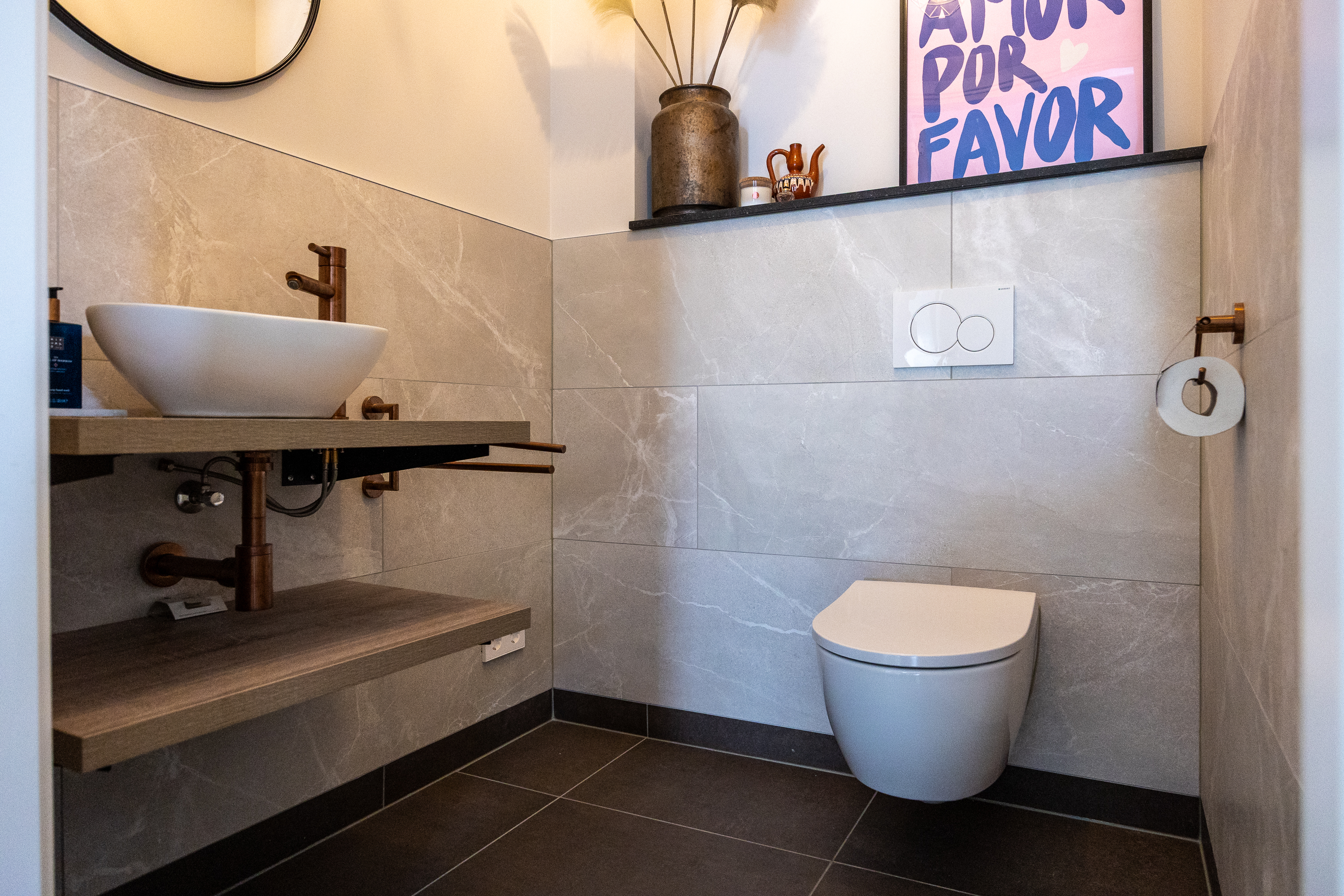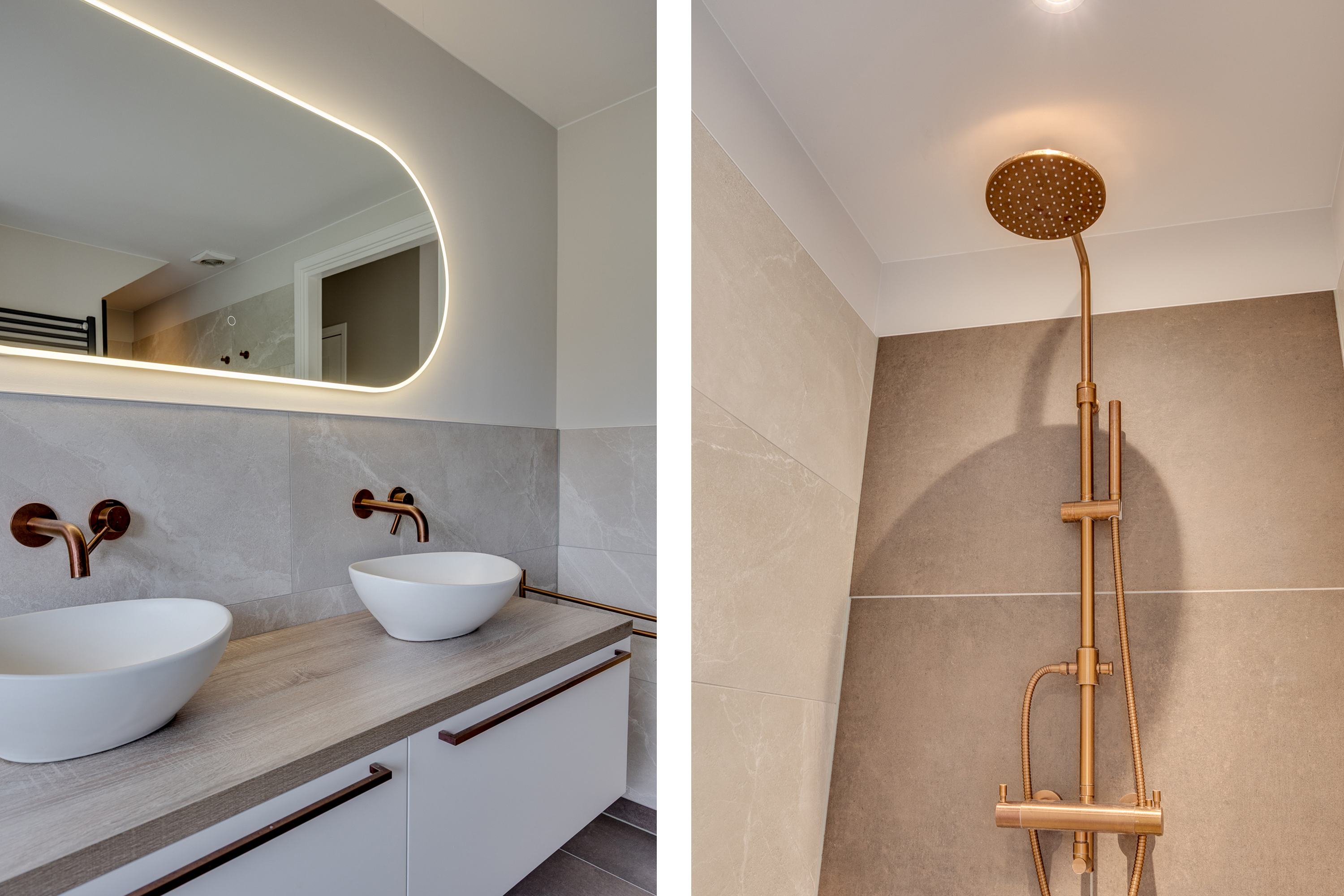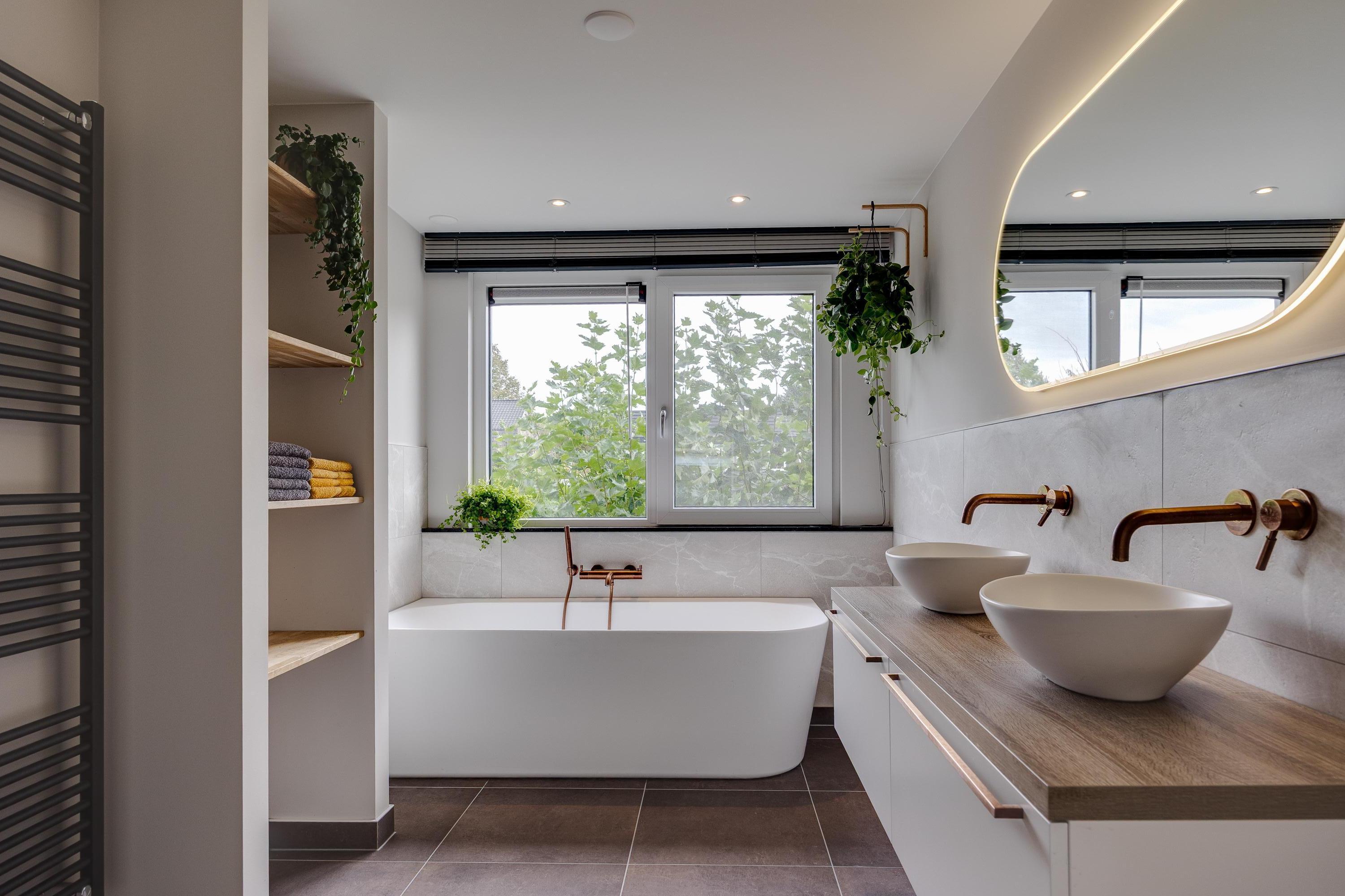 The luxurious master bathroom exudes a serene hotel atmosphere and is equipped with a freestanding bathtub, walk-in shower, and double sink with stylish bronze-colored faucets. Taupe-colored floor tiles and marble-look wall tiles create a warm, modern look, while a built-in niche with wooden shelves offers practical and attractive storage space.