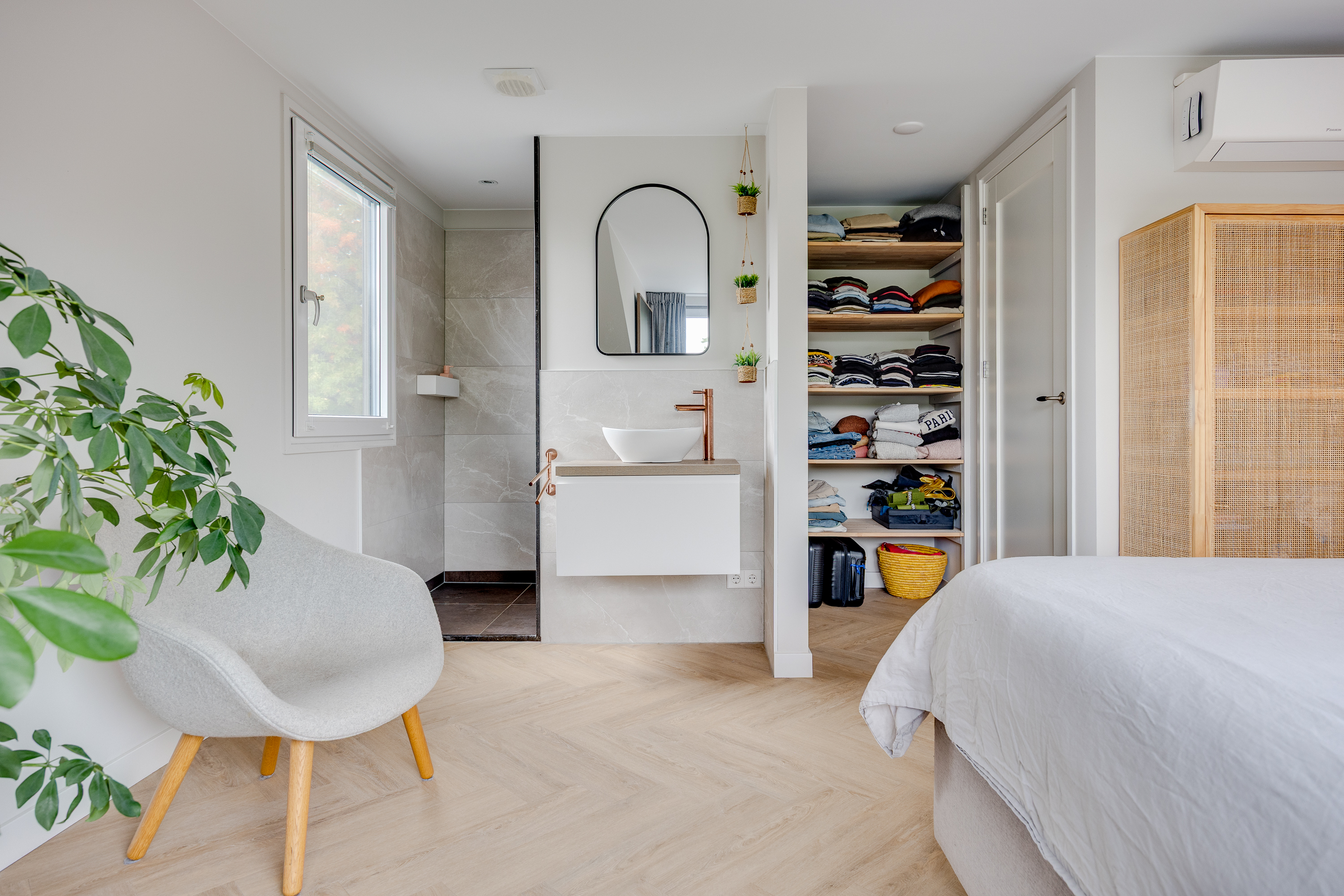 The master bedroom also has its own en-suite bathroom with shower and sink, a nice addition that offers extra privacy and comfort.