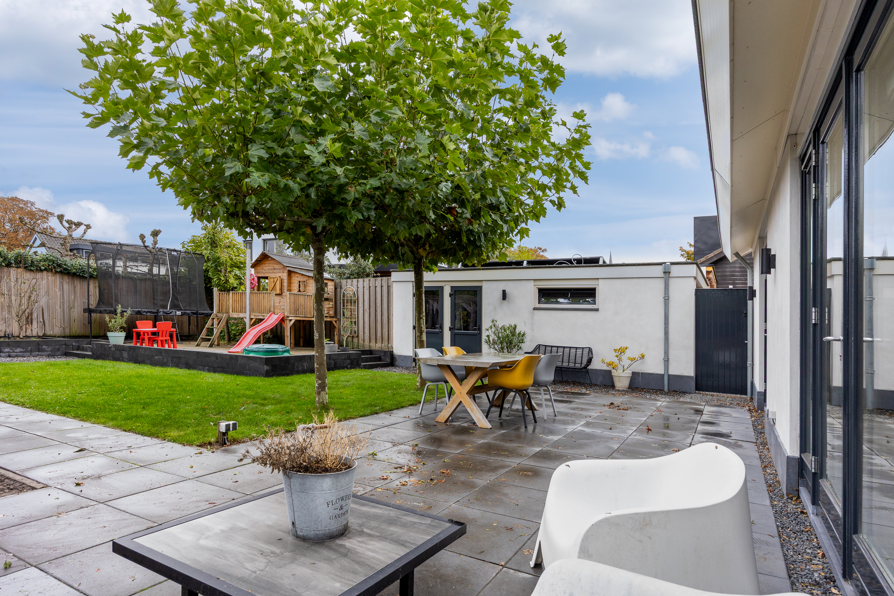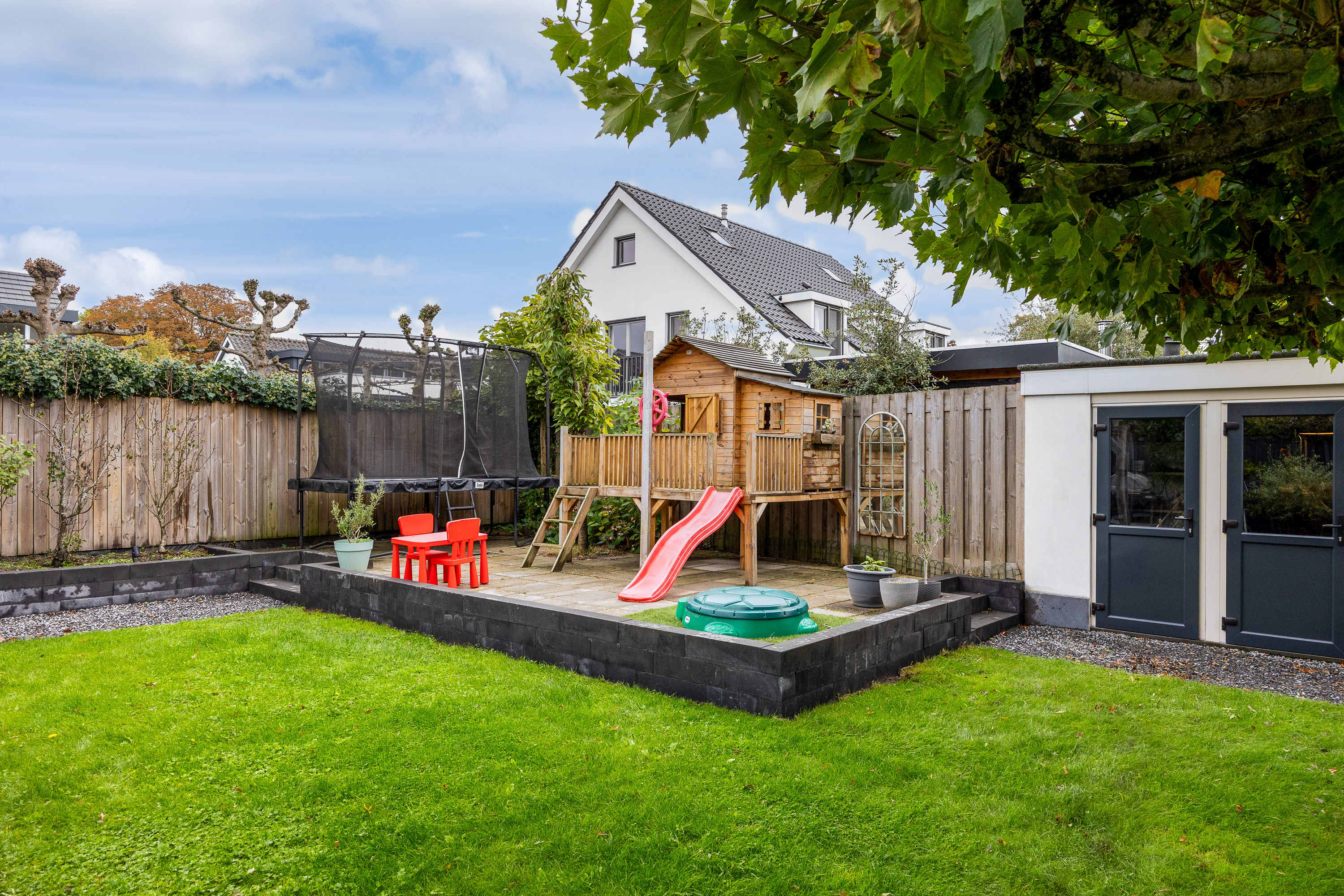 The garden provides access to the spacious garage, equipped with electricity and water connections, perfect as storage space or a hobby room. On the side of the house, there is also a spacious strip measuring 4 meters wide and 10 meters long, which can be arranged entirely according to your own wishes.