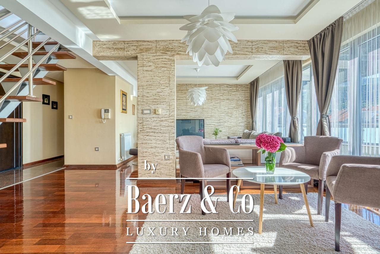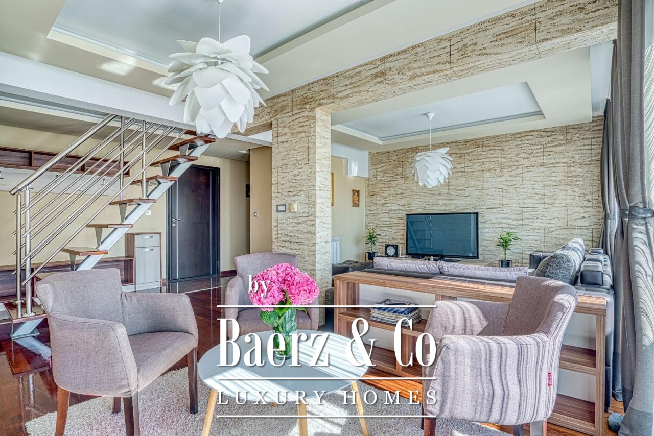 Ocupando los dos pisos superiores de un edificio contemporáneo de siete plantas, el ático de 188 m² ofrece privacidad y vistas despejadas al mar y a la montaña. Una plaza de garaje asignada en el sótano, conectada directamente por ascensor, proporciona seguridad y discreción en sus llegadas diarias.