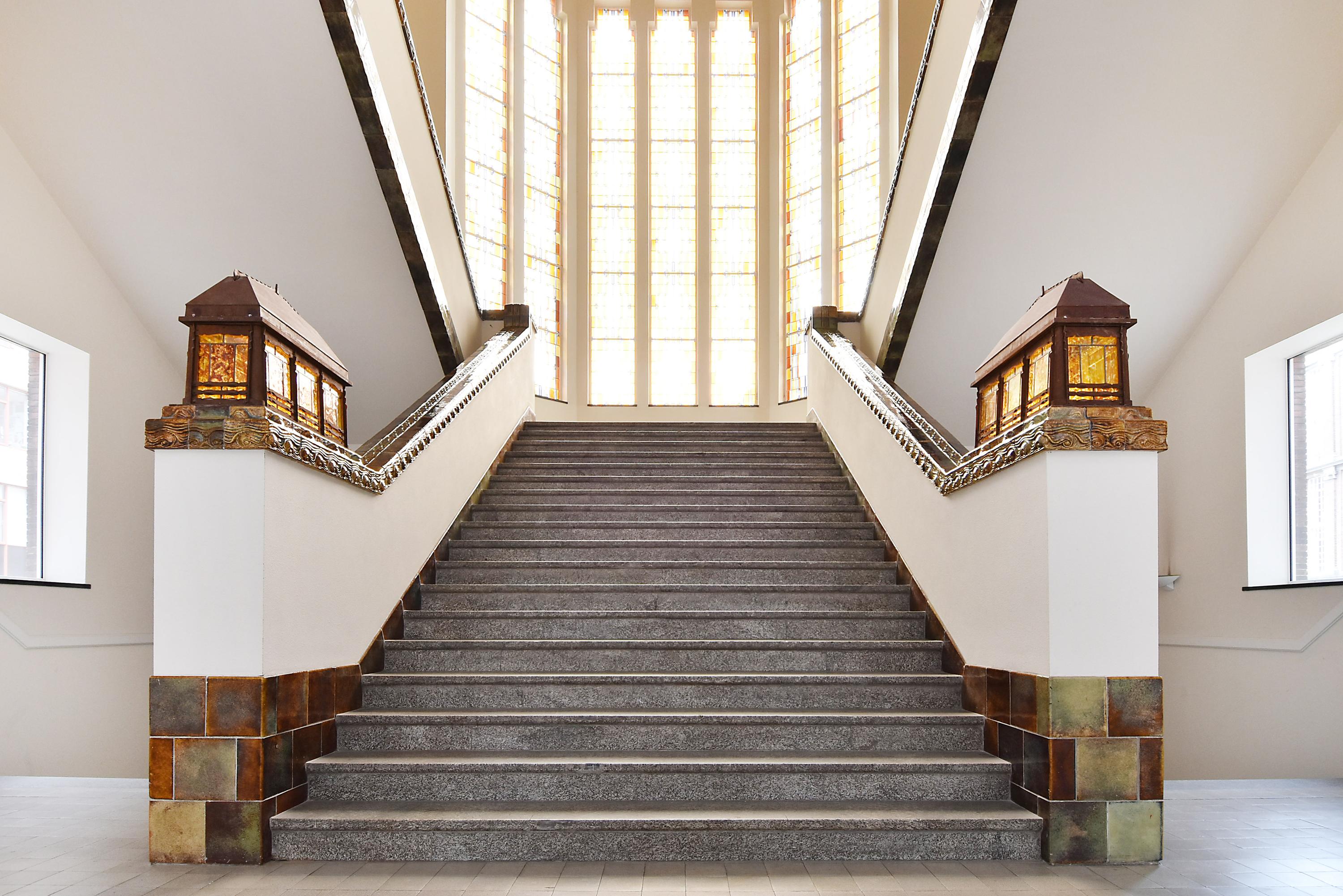 Representatieve entree met centrale hal, brievenbussen, lift en een prachtig monumentaal trappenhuis met glas-in-looddetails.