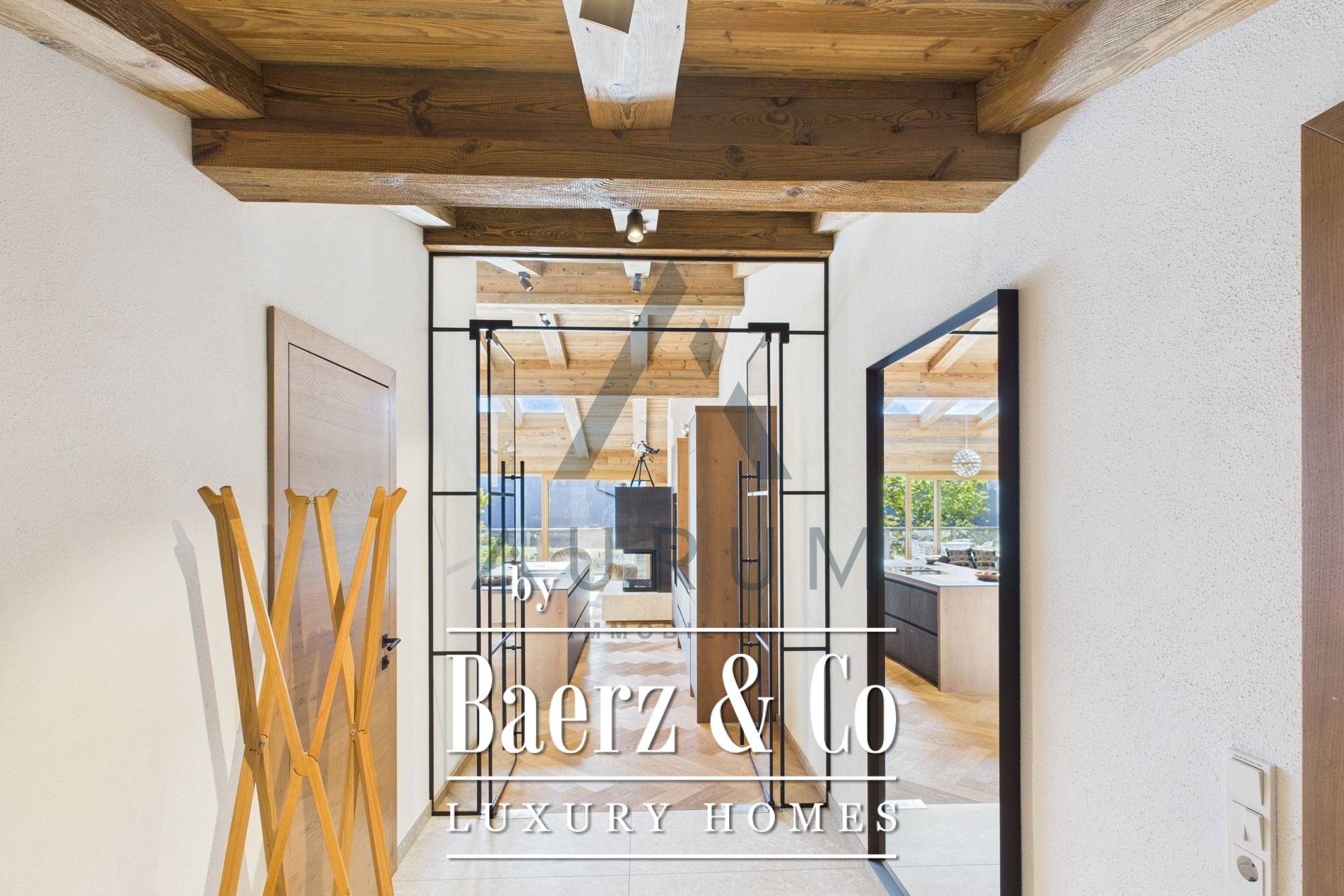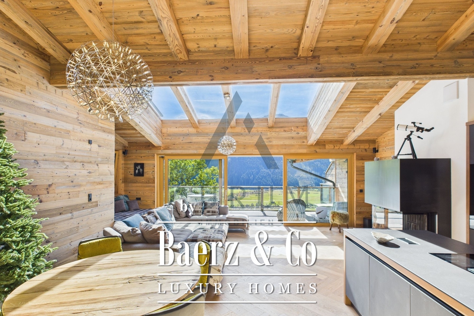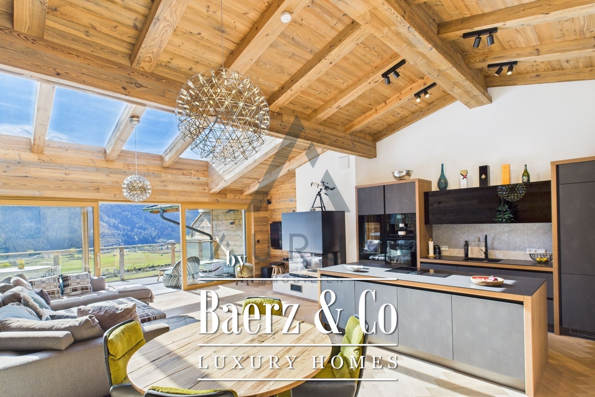 Una imponente zona de estar y comedor constituye el corazón del hogar, bajo una estructura de vigas de madera recuperada a la vista e iluminada por un lucernario de 3 por 4 metros. Las puertas francesas de triple acristalamiento de suelo a techo se abren a una terraza de 40 m² que ofrece vistas panorámicas de las montañas. Materiales nobles y una atmósfera sofisticada se funden en la cocina de diseño, equipada con electrodomésticos Miele, vinoteca, sistema de sonido Bose integrado e iluminación cuidadosamente seleccionada. Una chimenea aporta calidez discreta, mientras las persianas venecianas eléctricas y la calefacción por suelo radiante aseguran confort durante todo el año.