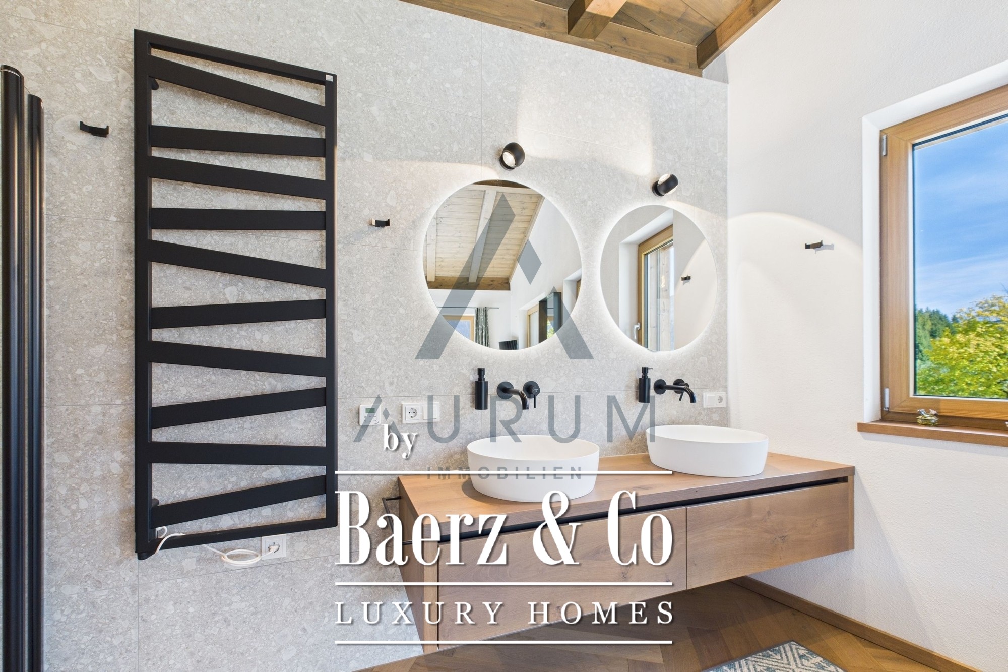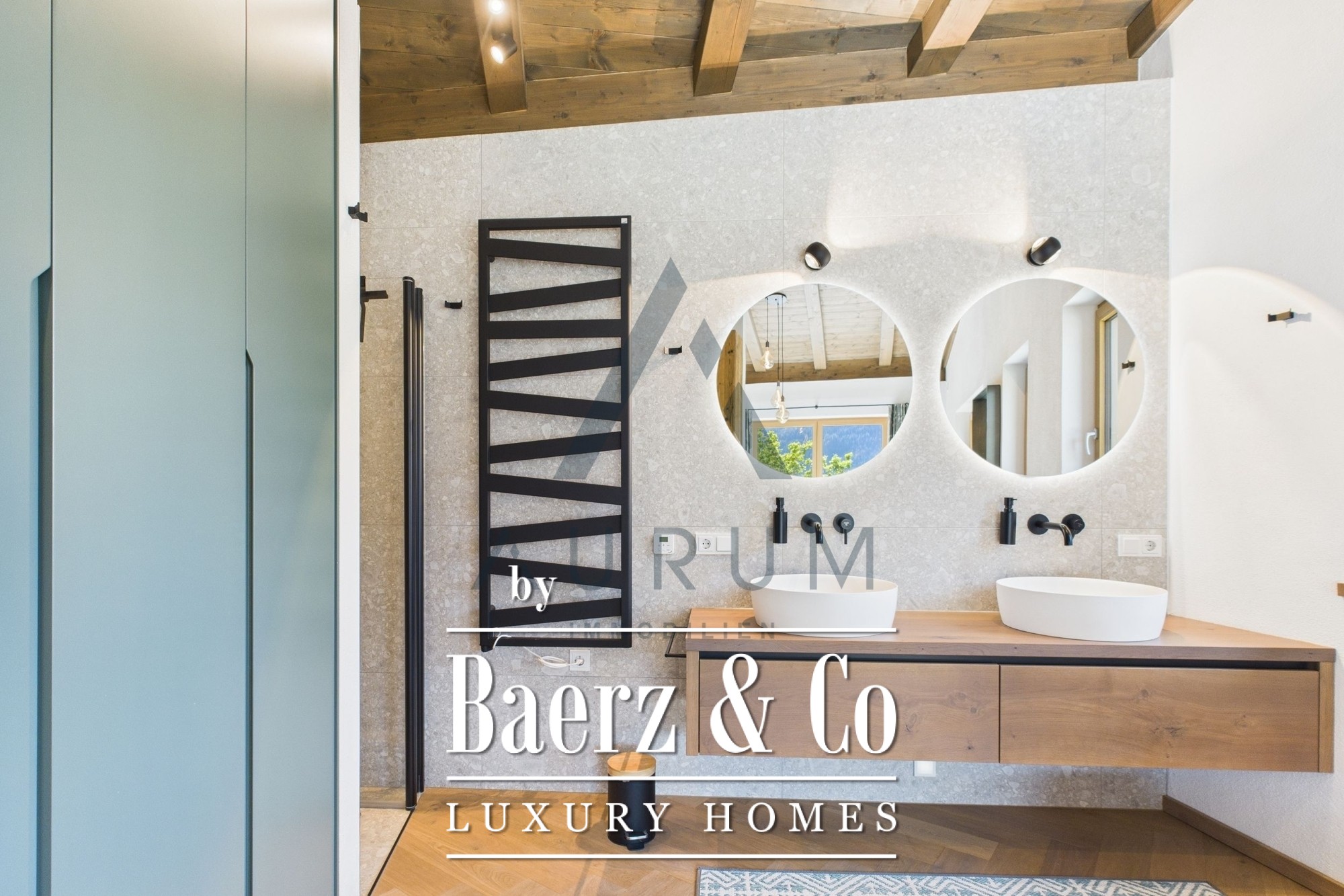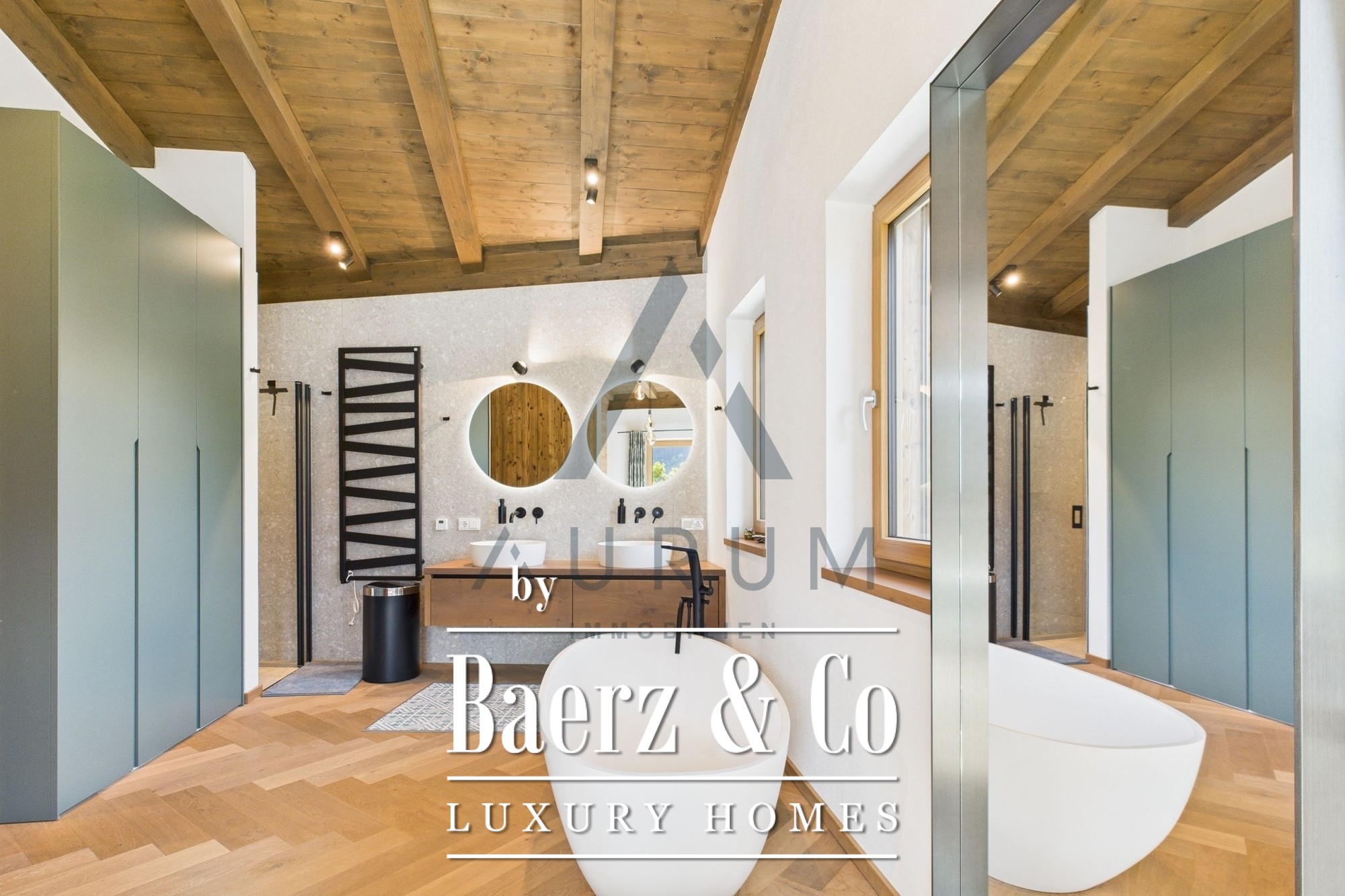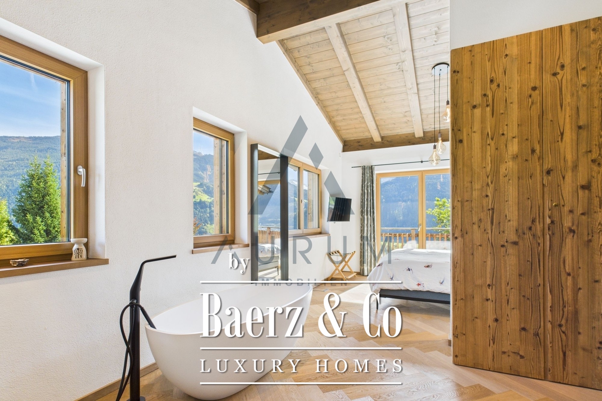 Una imponente zona de estar y comedor constituye el corazón del hogar, bajo una estructura de vigas de madera recuperada a la vista e iluminada por un lucernario de 3 por 4 metros. Las puertas francesas de triple acristalamiento de suelo a techo se abren a una terraza de 40 m² que ofrece vistas panorámicas de las montañas. Materiales nobles y una atmósfera sofisticada se funden en la cocina de diseño, equipada con electrodomésticos Miele, vinoteca, sistema de sonido Bose integrado e iluminación cuidadosamente seleccionada. Una chimenea aporta calidez discreta, mientras las persianas venecianas eléctricas y la calefacción por suelo radiante aseguran confort durante todo el año.