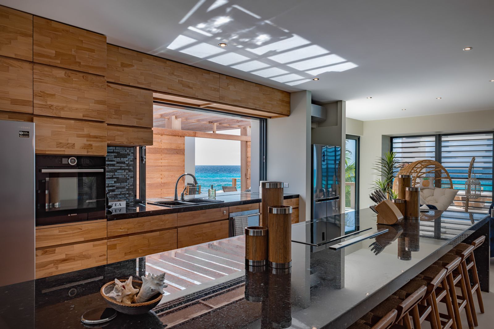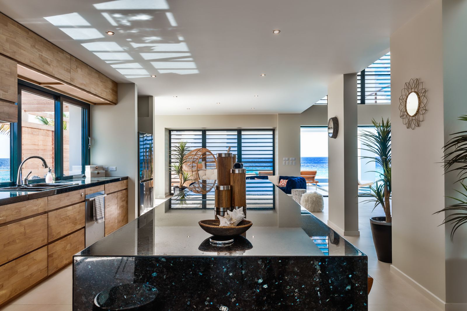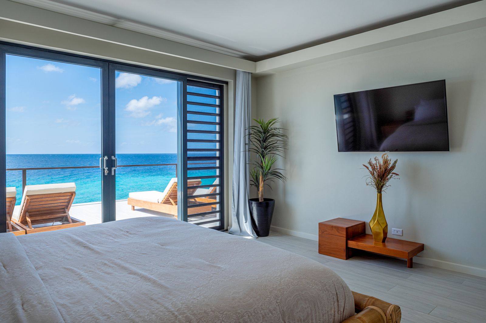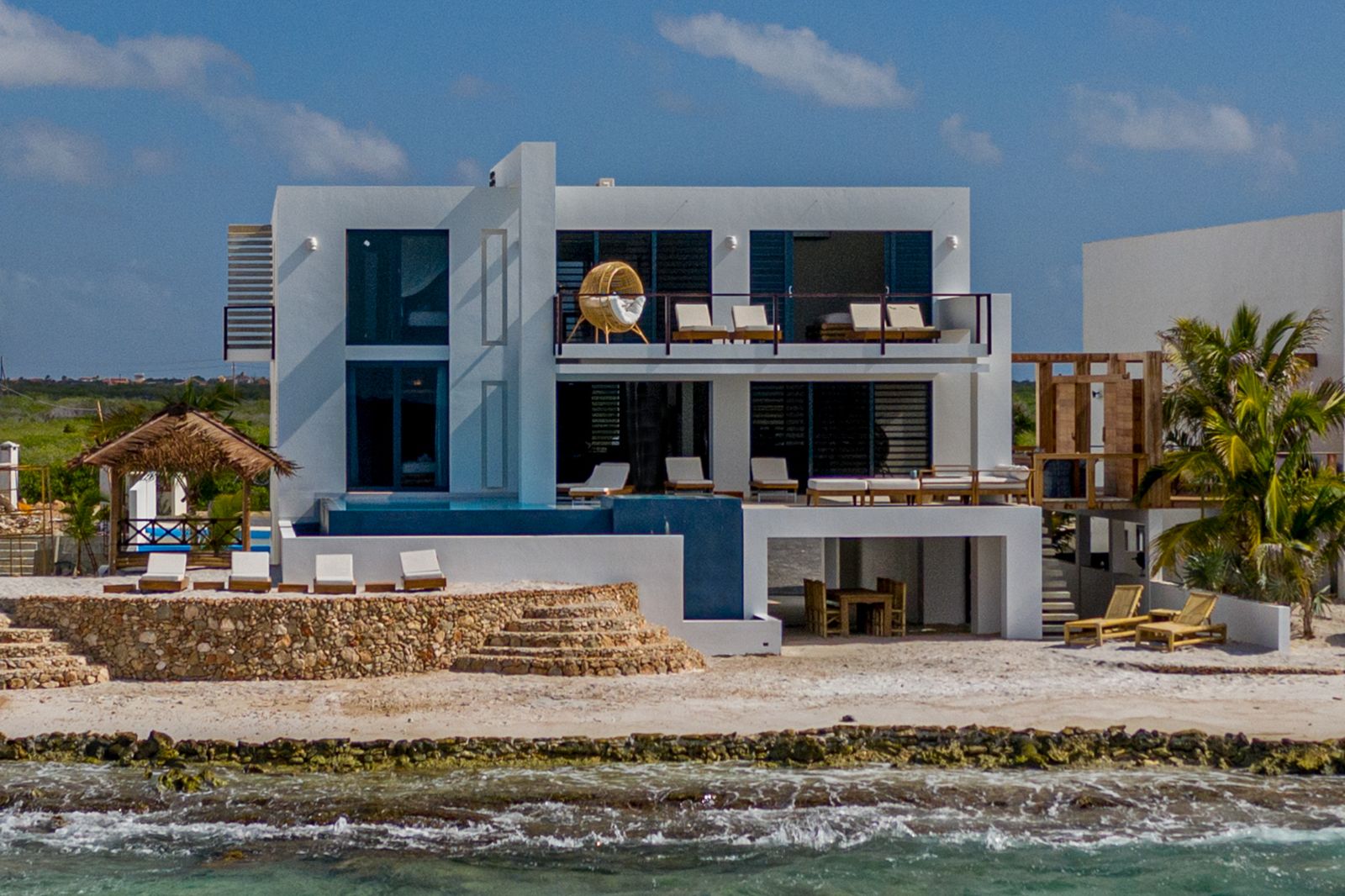La villa de playa Kralendijk se encuentra en la tranquila costa sur, ofreciendo acceso inmediato al mar Caribe y vistas panorámicas al océano. Su arquitectura moderna se caracteriza por líneas limpias, ventanales de suelo a techo y una paleta cromática sobria que realza la luz natural y las vistas sin obstáculos al mar. Al entrar, la luz recorre suelos de hormigón pulido en armonía con detalles de madera cálida, creando un ambiente sereno y duradero.