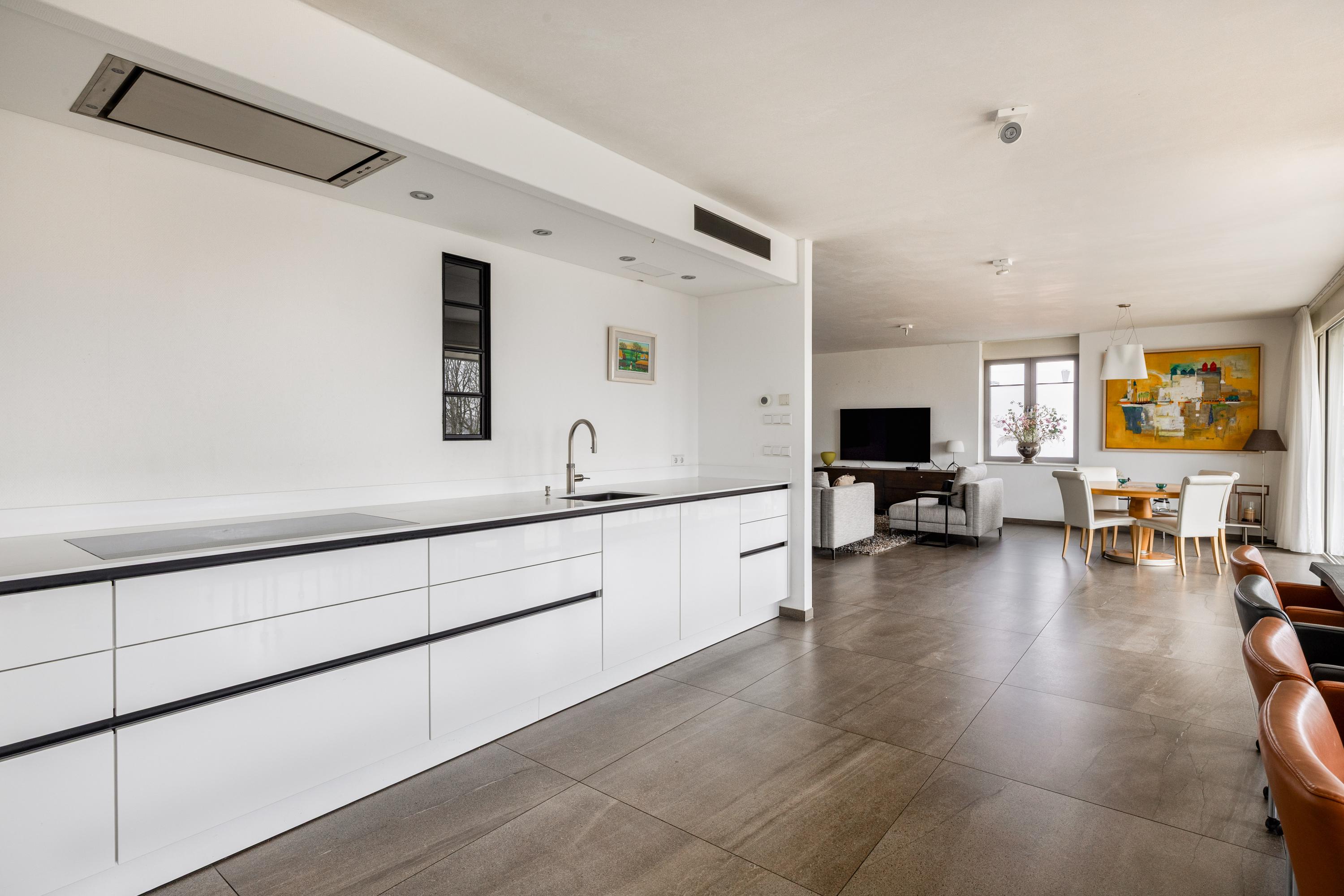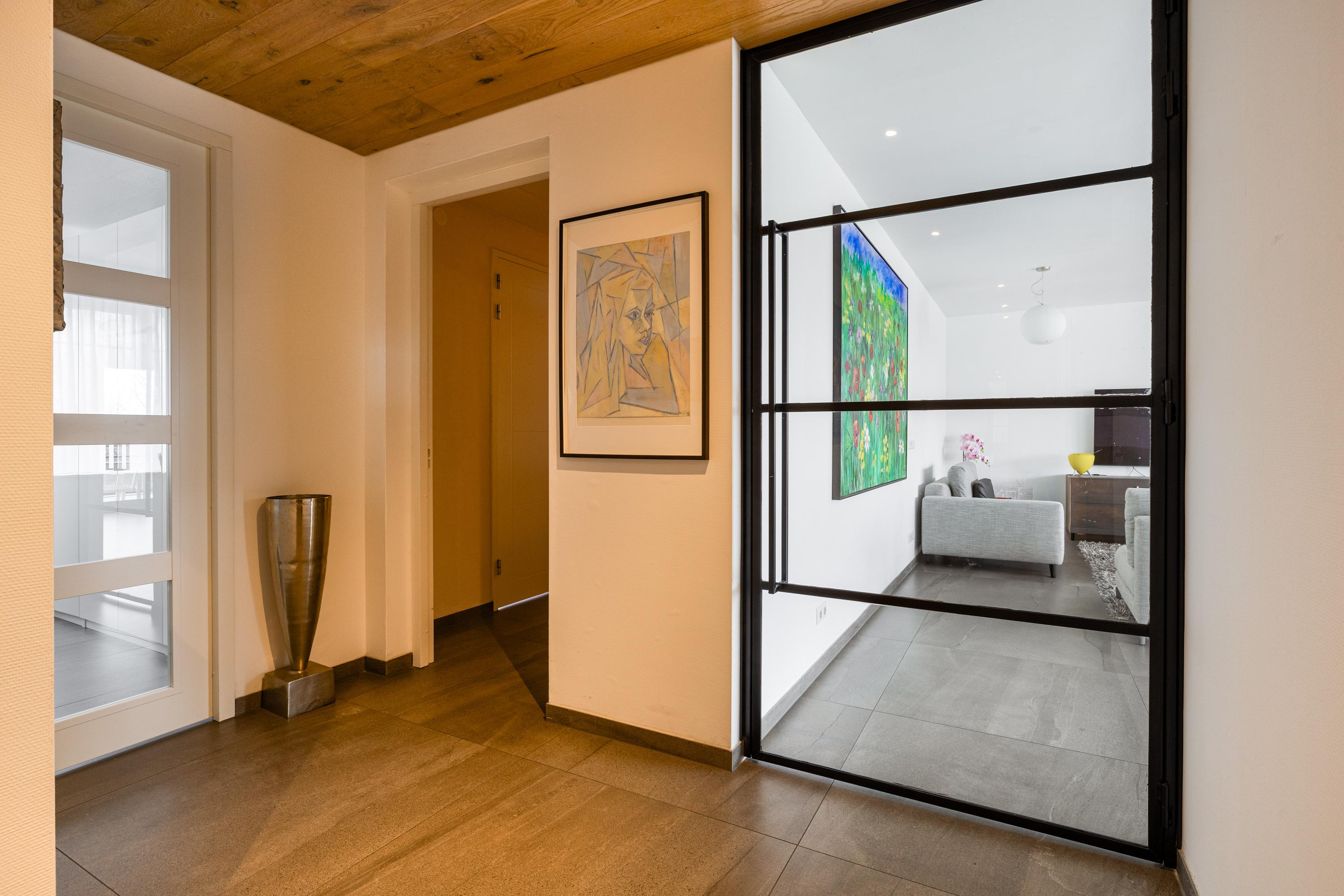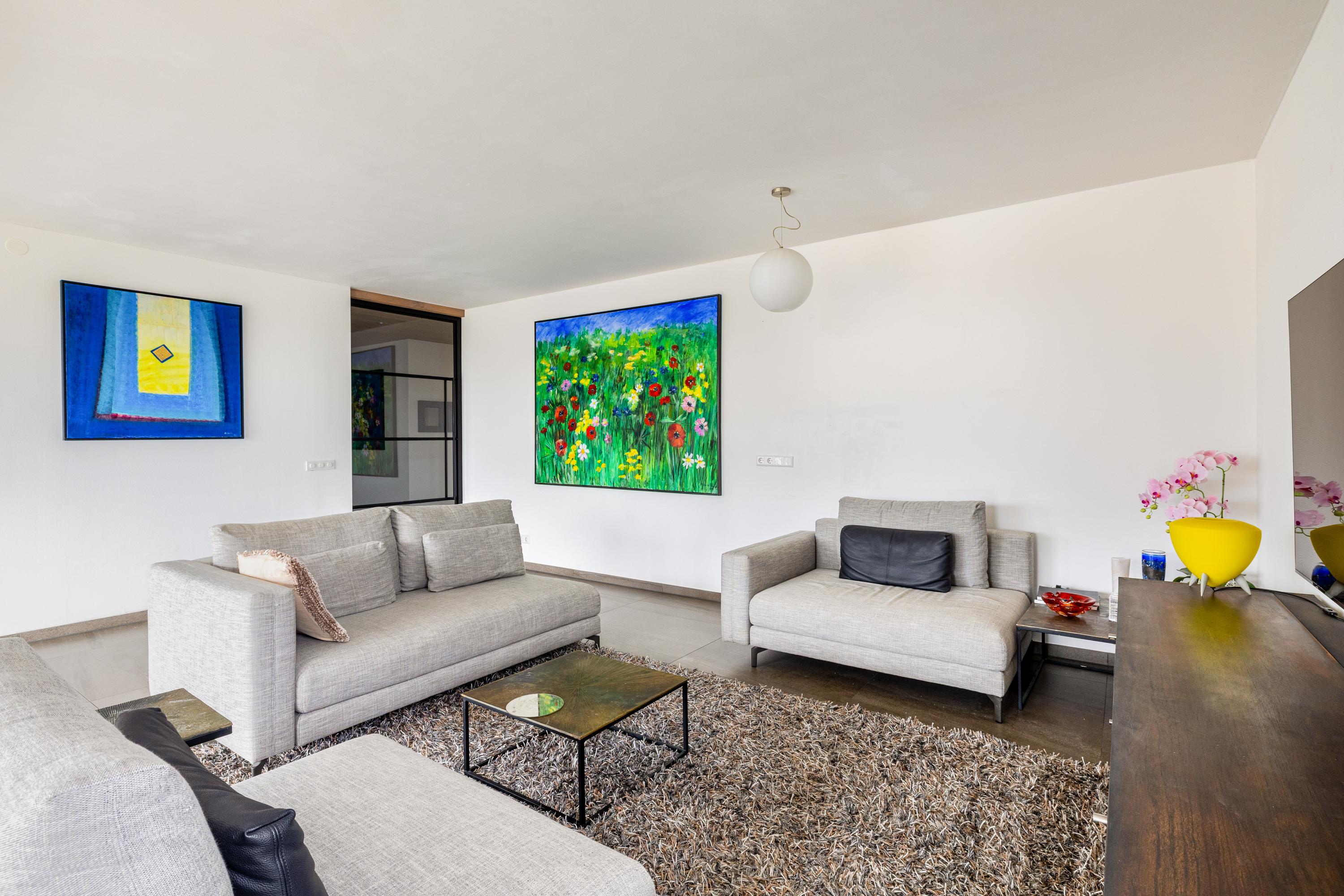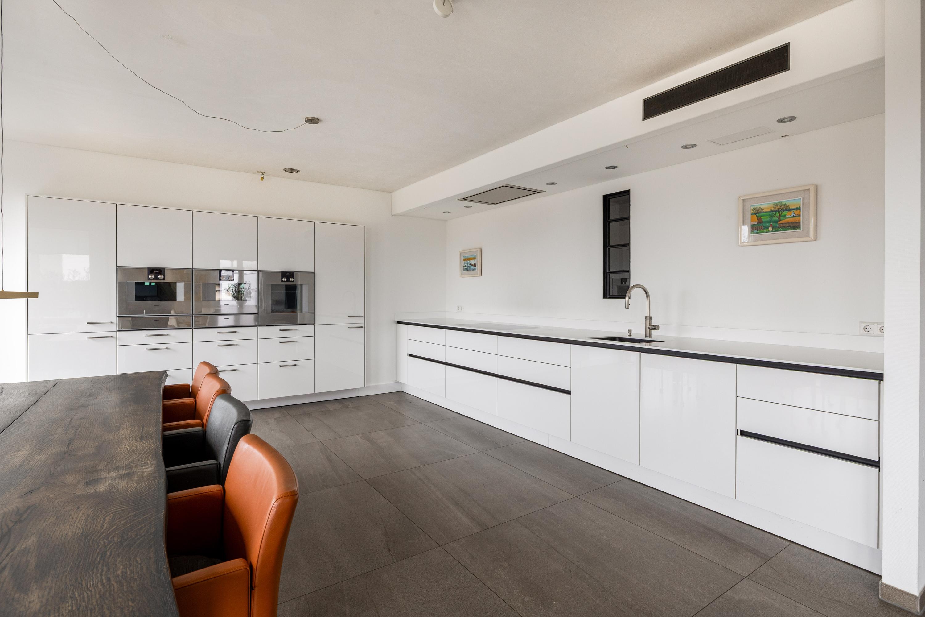 El salón principal se extiende hasta una terraza orientada al sureste mediante amplias puertas correderas. Aquí hay espacio suficiente para comer al aire libre, conversar tranquilamente o simplemente disfrutar de las vistas despejadas a zonas verdes y agua. Una segunda terraza, orientada al noroeste, ofrece una alternativa para los momentos más frescos, garantizando el disfrute privado al exterior en cualquier momento del día. En el interior, la cocina SieMatic con electrodomésticos Gaggenau constituye el corazón de la vivienda, con líneas limpias y generosas superficies de trabajo tanto para reuniones sociales como para el uso diario.