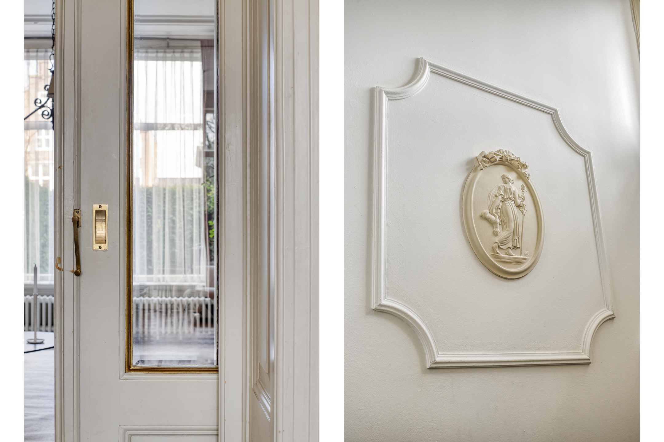 Tras su fachada, la vivienda conserva la elegancia de su época: techos altos, ventanas elevadas, abundantes detalles en las fachadas, estucos, escaleras y puertas. Al entrar, un vestíbulo de mármol con techos elevados y majestuosas escaleras proporciona una transición tranquila del ritmo urbano al sosiego interior. El salón clásico, con puertas correderas originales y techos ornamentados, se conecta con una amplia zona de comedor y una luminosa galería con vistas al jardín. Ocho dormitorios se distribuyen entre la primera y la segunda planta, junto a un despacho, vestidor y espacios flexibles para invitados o trabajo, ideal tanto para la vida familiar como para el teletrabajo.