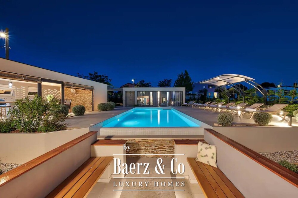 Villa Rakalj, situada en Marčana, Croacia, ofrece una cuidada fusión de modernidad y serenidad. Esta villa dispone de 315 m² de espacio habitable en un entorno tranquilo, rodeada por una generosa parcela de 1.150 m². Su arquitectura celebra la amplitud y permite la entrada de luz natural en cada uno de los seis dormitorios y seis baños, con una atmósfera refinada en todo el conjunto. Dos cocinas elegantemente diseñadas enriquecen la vida diaria y hacen de este espacio el lugar ideal tanto para reuniones íntimas como para celebraciones.